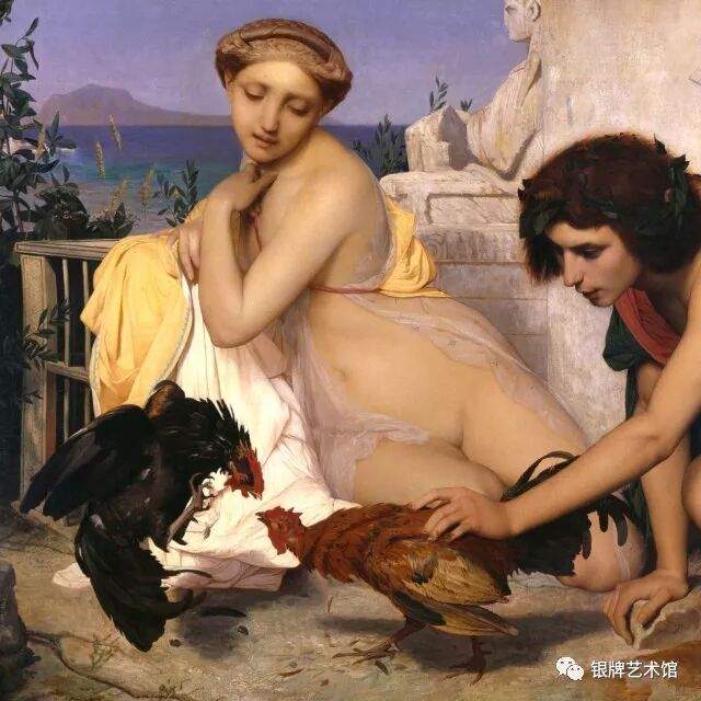 杰罗姆不断的提高自己的绘画技术,在一个学术活动上,描绘了这幅《年轻的希腊人在玩斗鸡》图中以那不勒斯湾为背景,描绘一个裸体的年轻男子和一个身披轻盈褶皱裙子的女孩在逗弄两只斗鸡的场景。