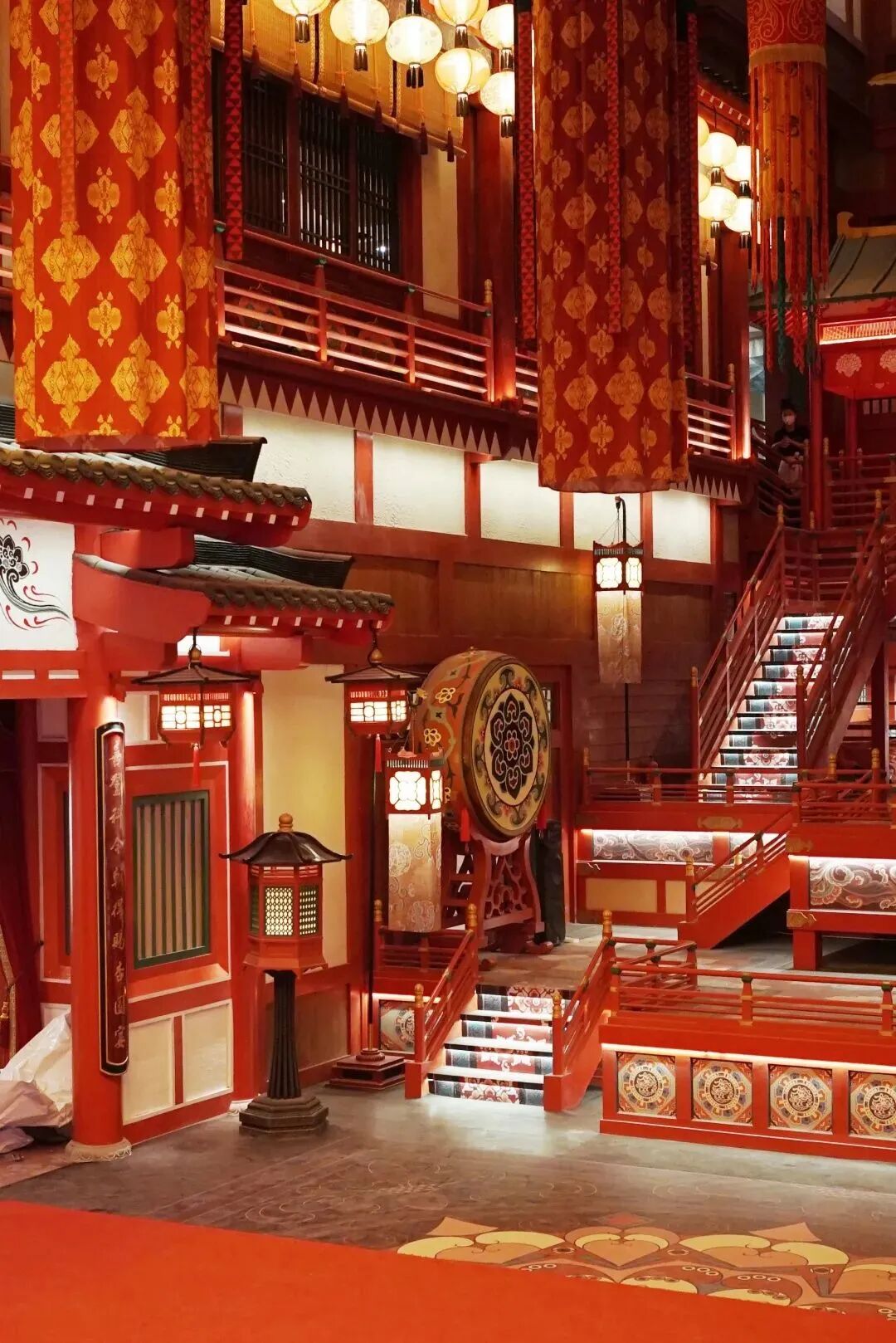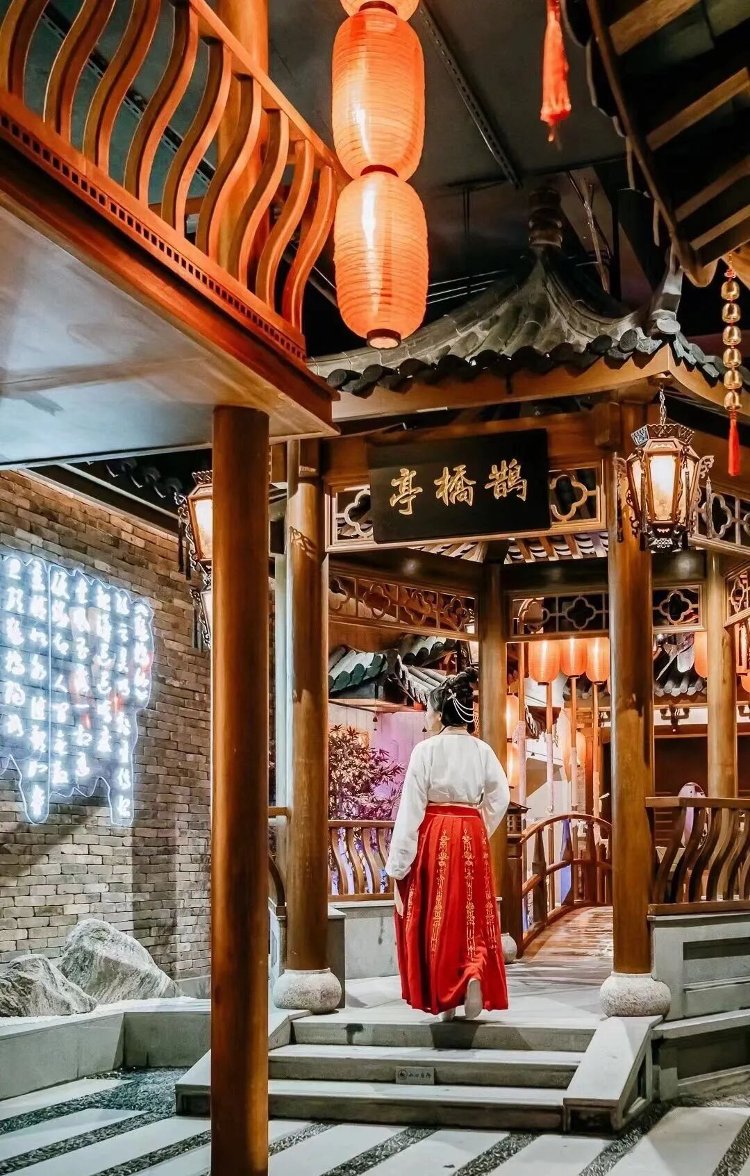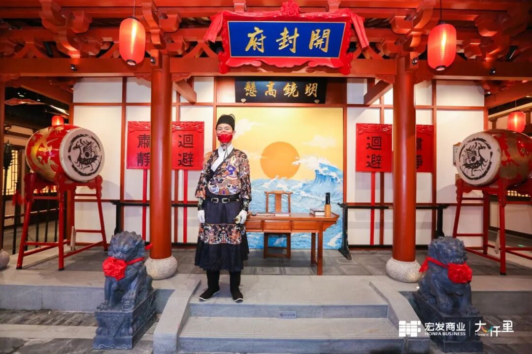 共设计有三纵三横的北宋街巷,用红色砖瓦砖墙为主色调,开封府、国子监、震远镖局、龙门客栈、望月台、鹊桥、姻缘树、虹桥等建筑,还有随处可见的铜壶、纸伞、花灯物件,随处可见宋风古韵的历史风貌,喜欢cos的顾客前来打卡,仿佛就身在宋代盛世的繁华梦境中。