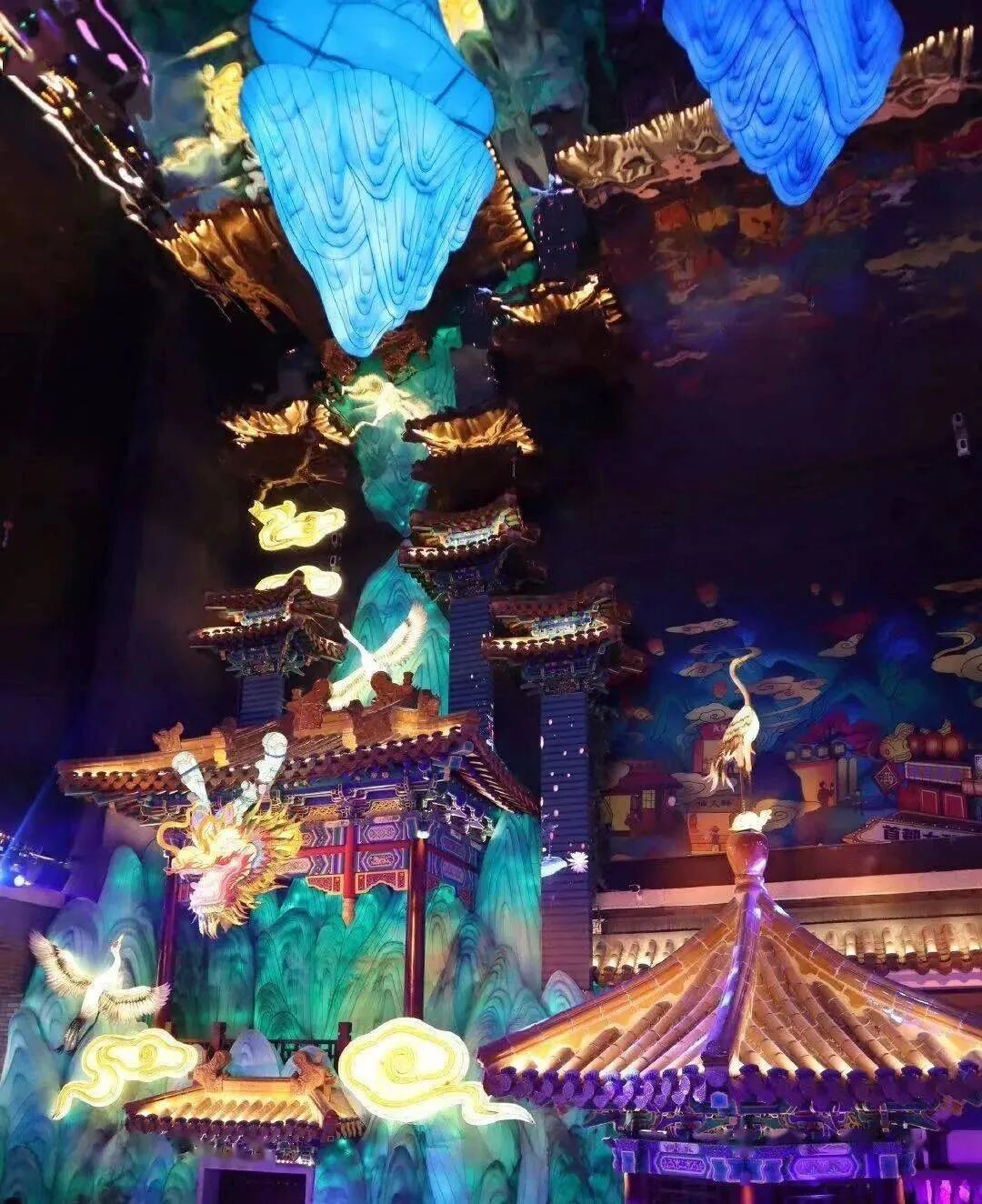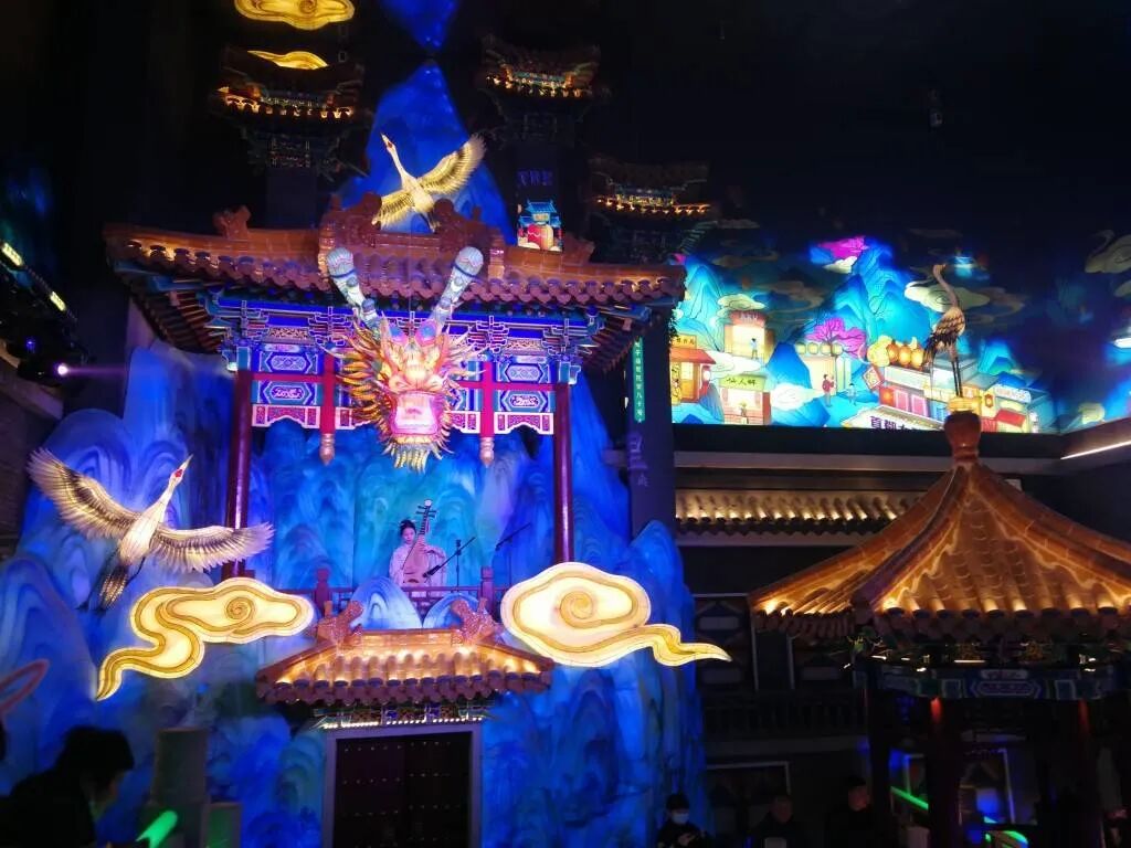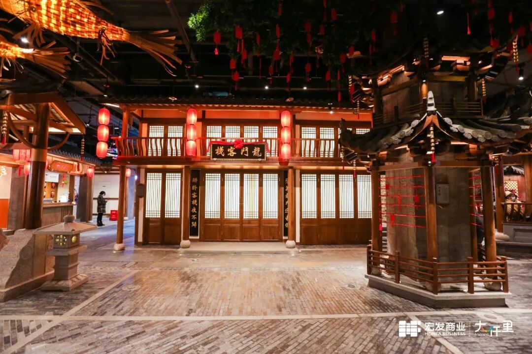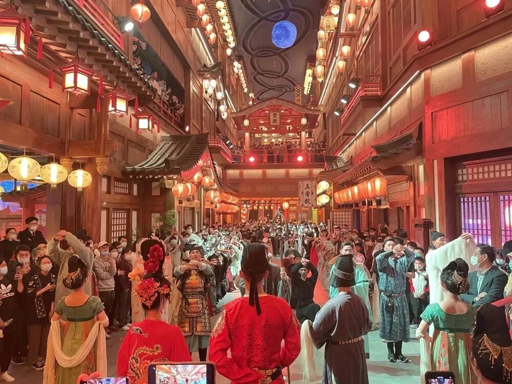 共设计有三纵三横的北宋街巷,用红色砖瓦砖墙为主色调,开封府、国子监、震远镖局、龙门客栈、望月台、鹊桥、姻缘树、虹桥等建筑,还有随处可见的铜壶、纸伞、花灯物件,随处可见宋风古韵的历史风貌,喜欢cos的顾客前来打卡,仿佛就身在宋代盛世的繁华梦境中。