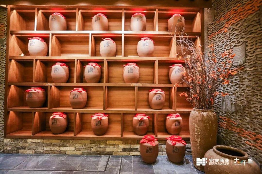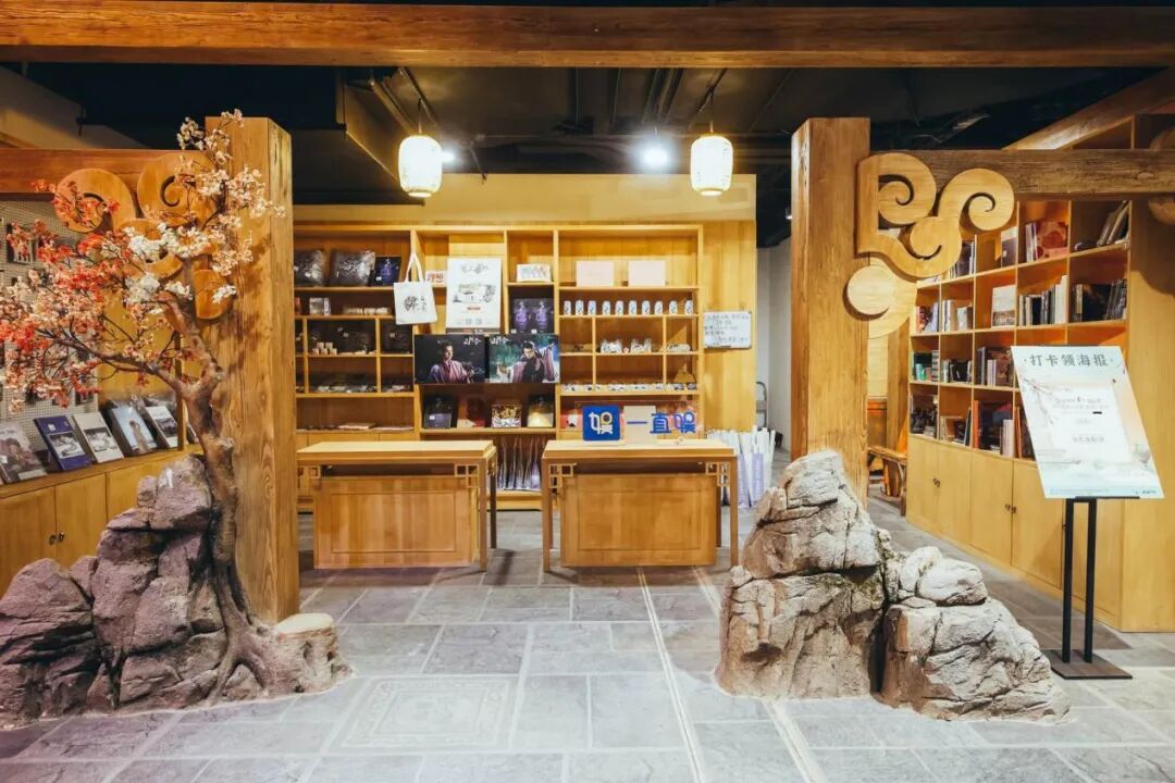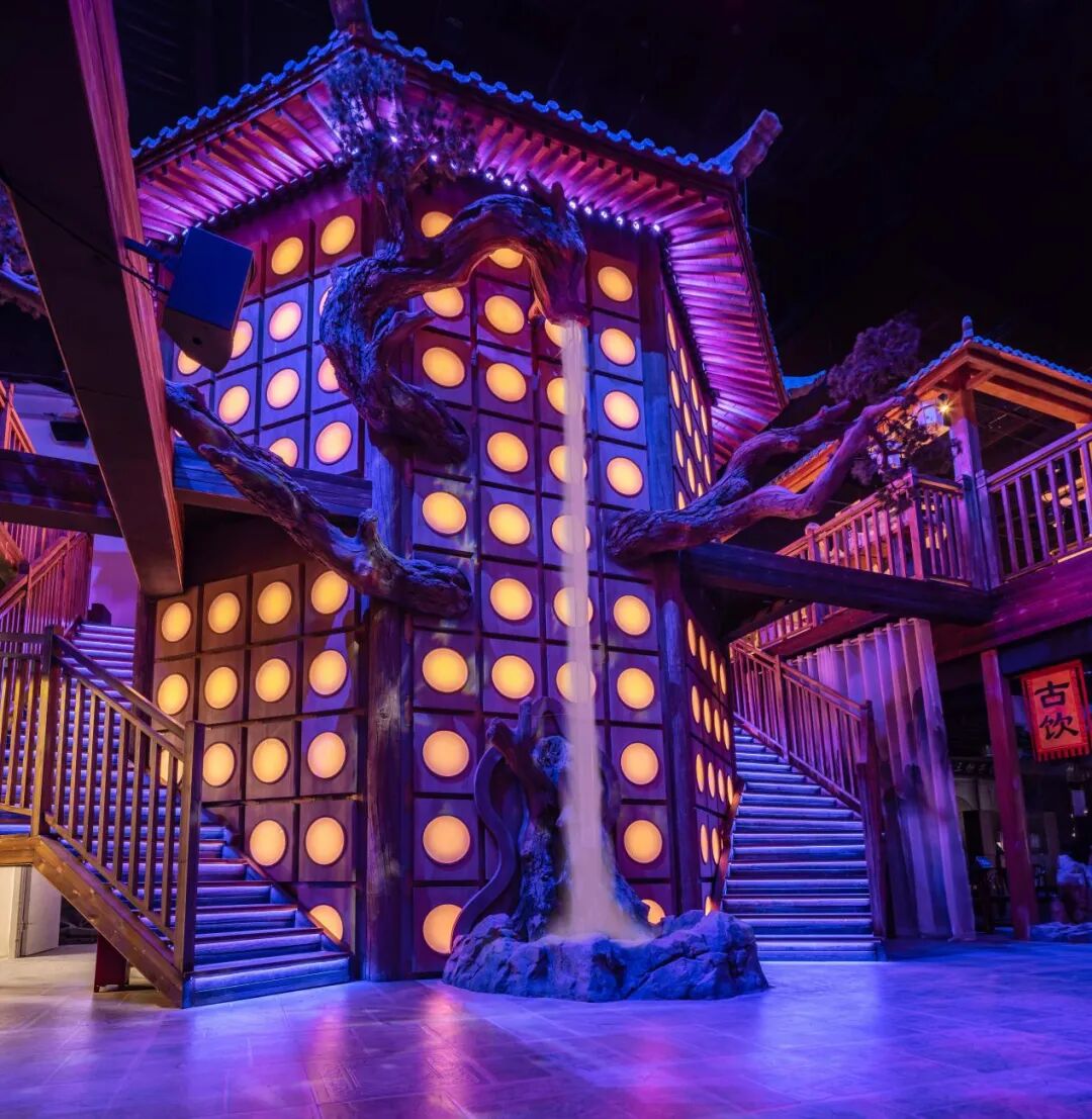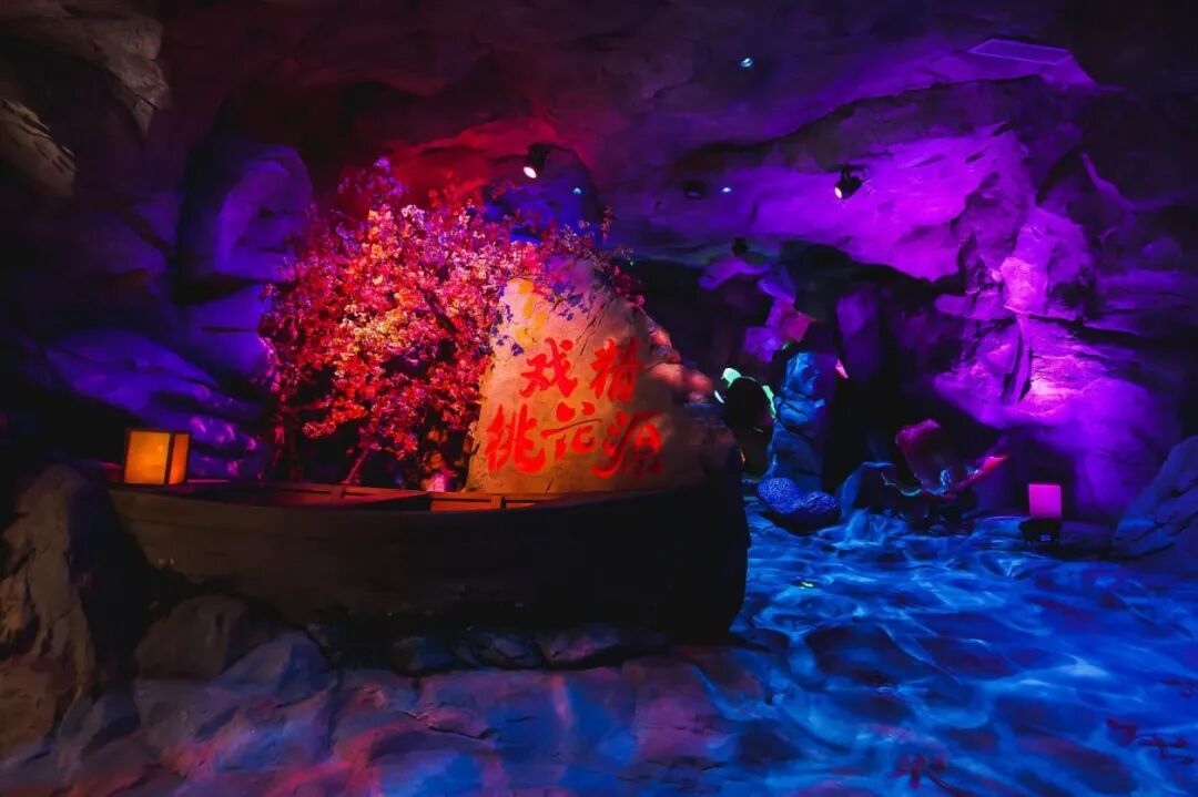 桃园建筑在这里随处可见,分散在各地的的古风道具达到了1381件,入口处烟雾缭绕,顾客进门的那一刻仿佛就进入到了陶渊明笔下的桃花源处,位于中央的桃花树成为了标志性的打卡地,桃树上和地上的甲骨文彰显空间设计的细腻感。