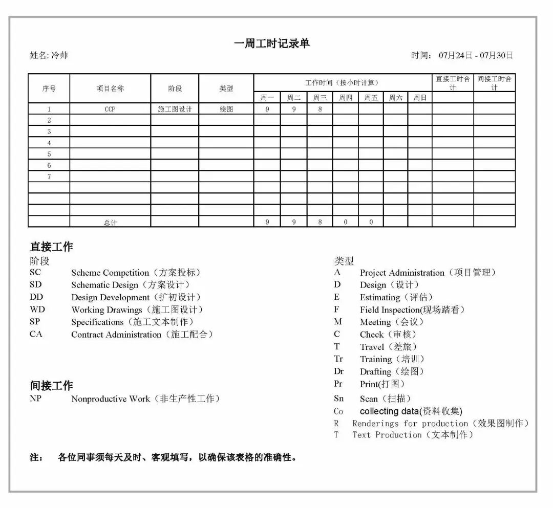 主要的目的是培养设计师的自我管理意识,从侧面也可以帮助管理人员判断设计师的工作效率,同时这张表在项目结束后,对于整个项目的工作量和成本的评估也会起到很重要的作用。所以在人员管理上也能给你一定的帮助。
