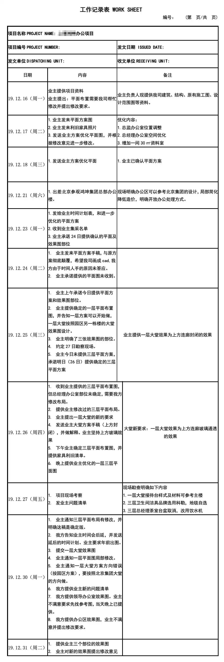 工作记录表绝对不是设计单位的一本私人日记,一定要在项目过程中和业主同步(可以1周发送业主1次),这样才能起到帮助业主和提醒业主的作用。