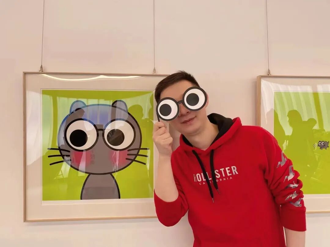 答:COOCOO这个名字最早起的时候其实没有考虑含义,只因为字母的外观构成很像我的画, 发音也还挺好听的, 就用了这个名字, 后来才知道英文里有疯狂的狂放不羁的含义,但这个含义跟大眼镜那个系列想表达的某种状态还是蛮契合的,挺巧的。我的创作有点像就处于现实与幻想之间的交界点,这个世界也是挺疯狂的,所以用这个词作为这个展览的名字,特别好。