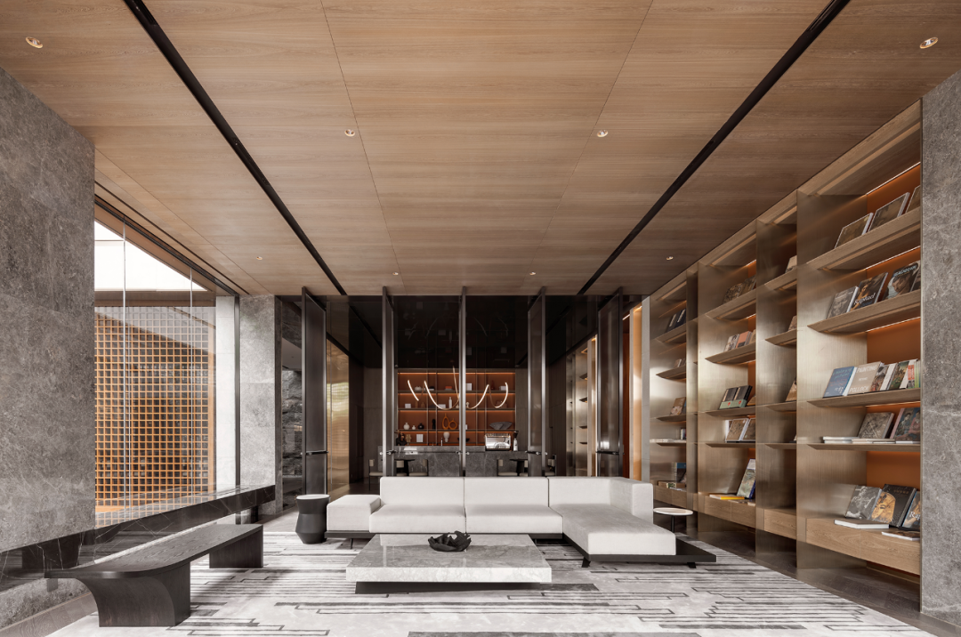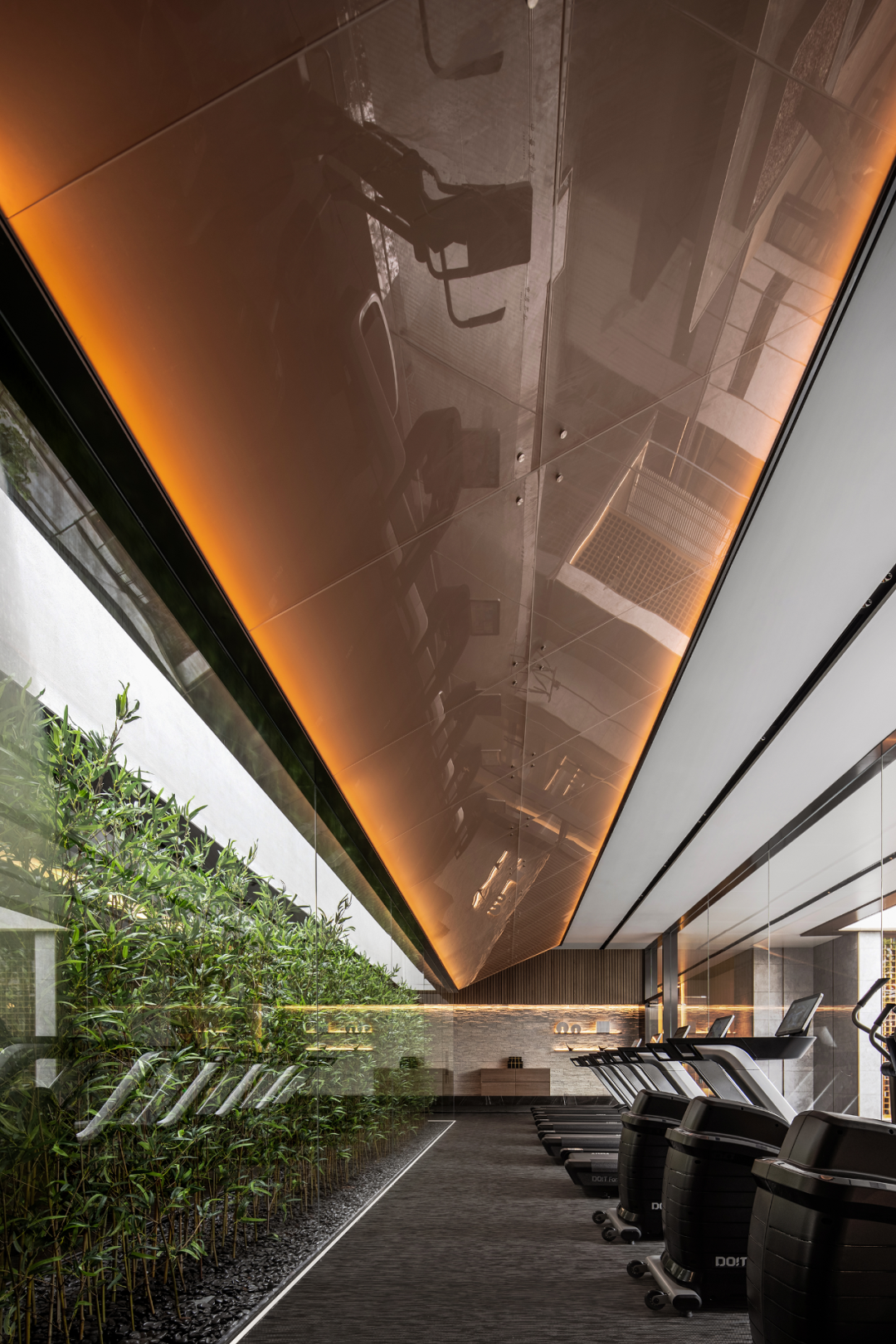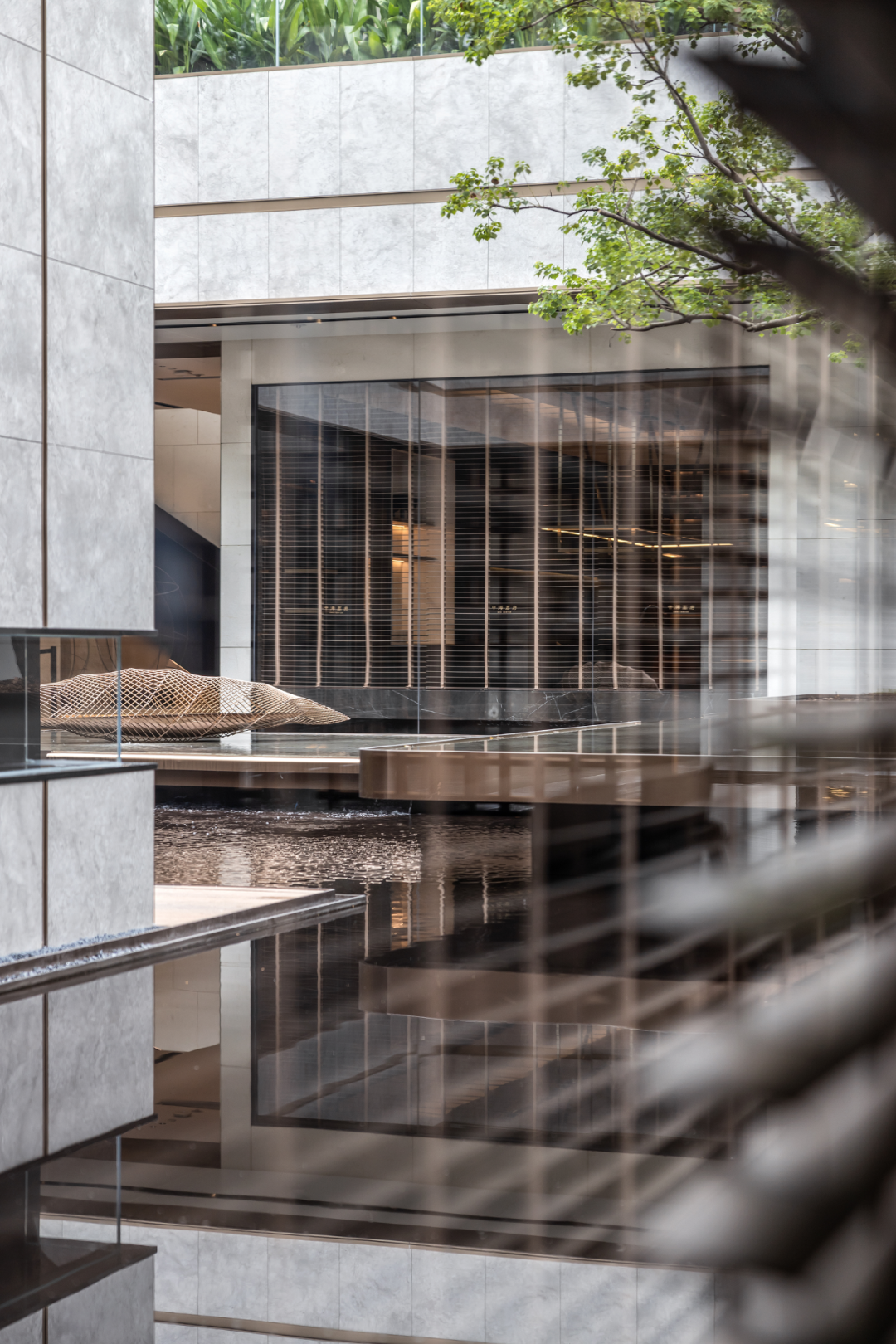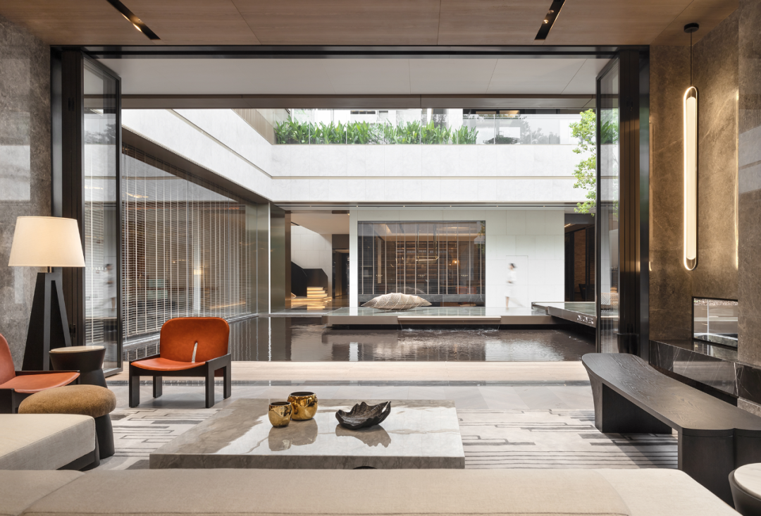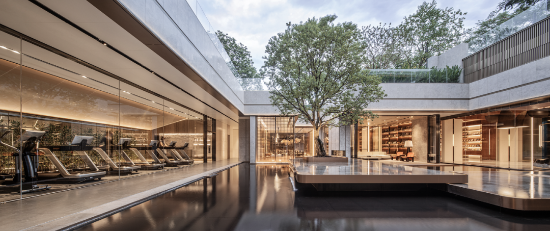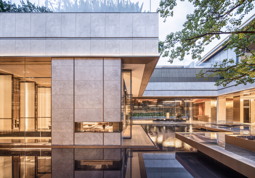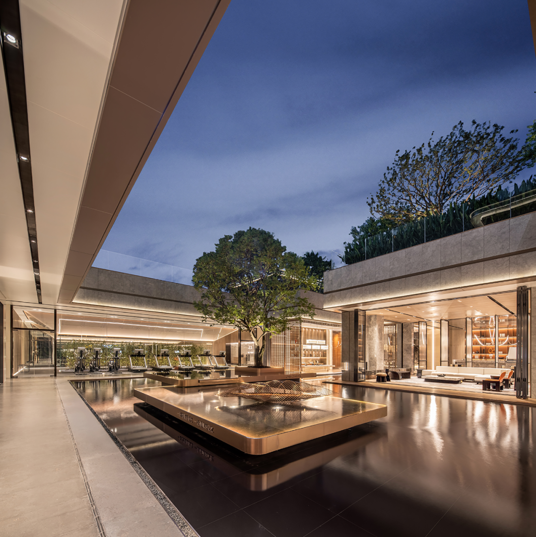 本案建筑为五栋塔楼,一层为庭院景观及连接的户外露天泳池,中间为大型的开口采光天井,巧妙地将自然光线与地面景观引入到负一层的会所空间,透过中央水景的波光反射,创造出奇妙的空间戏剧性。