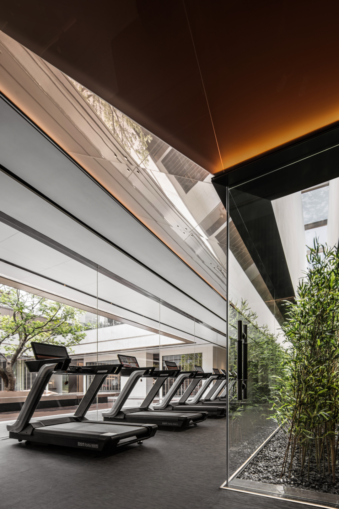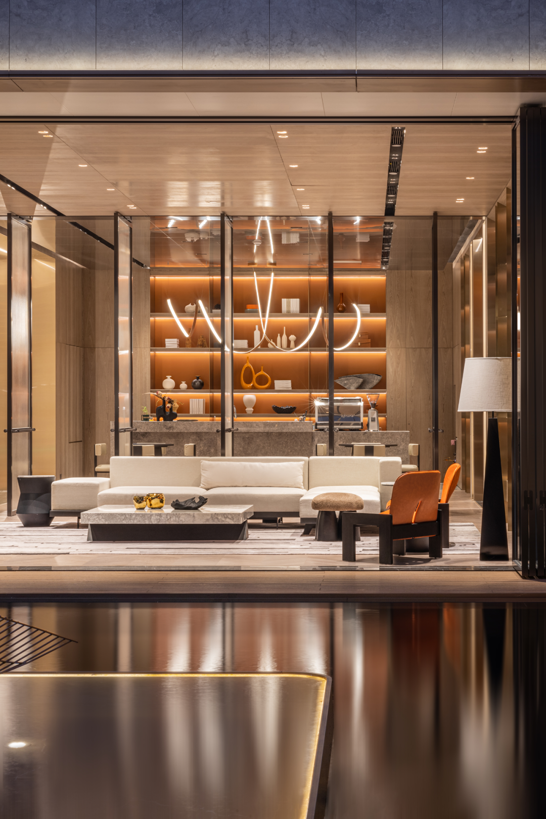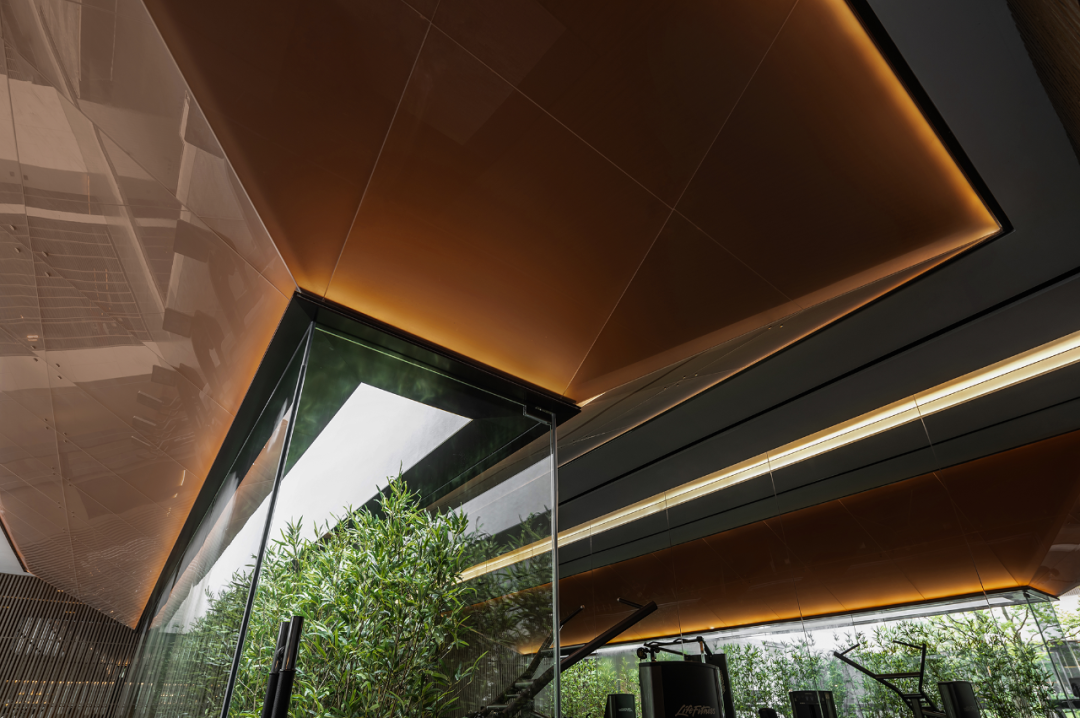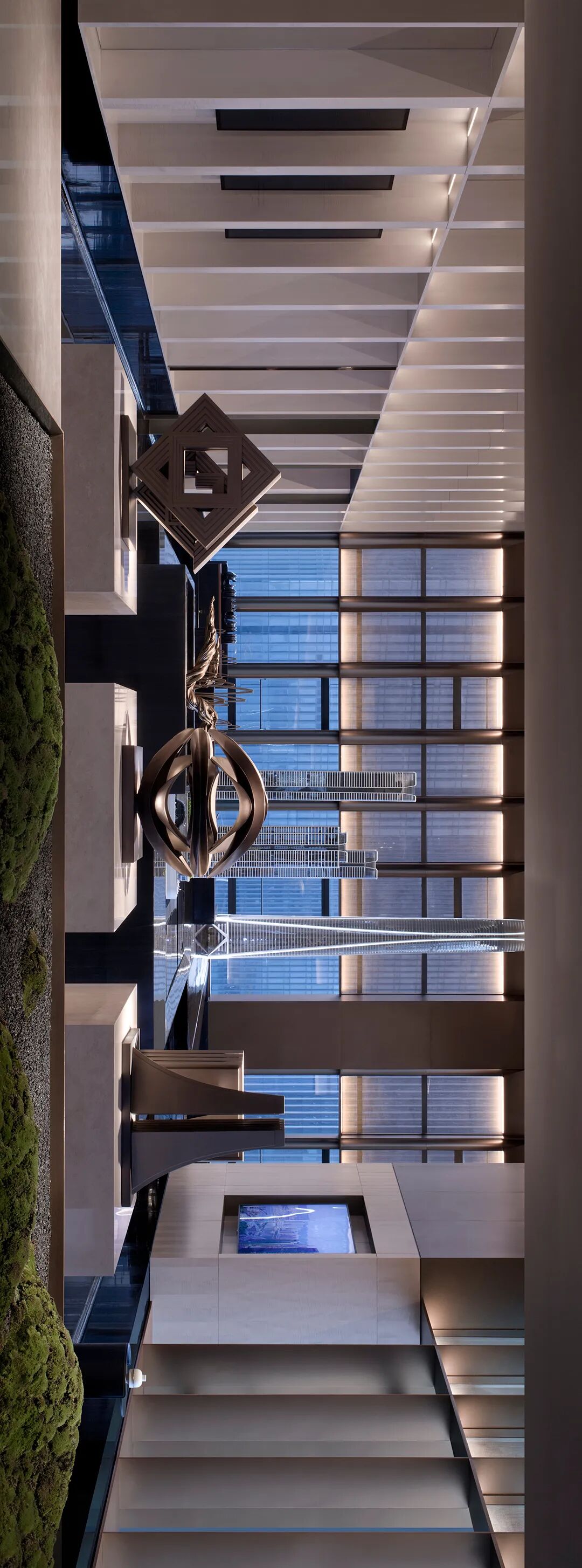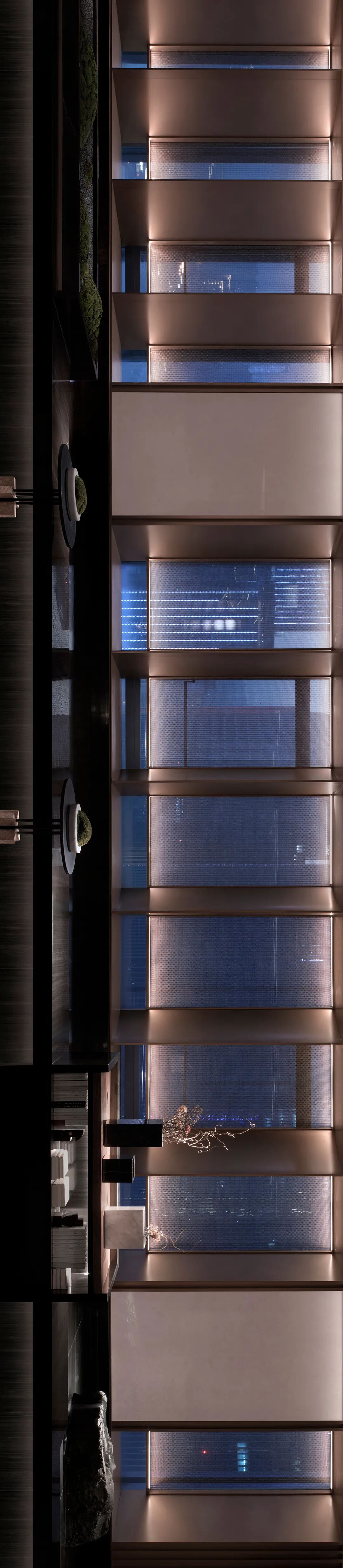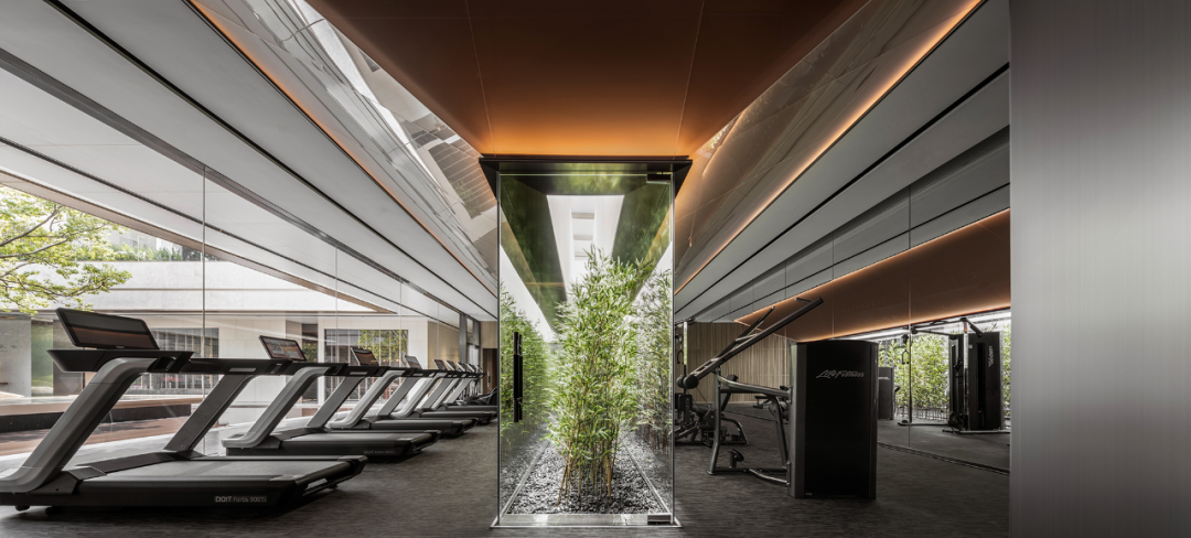 本案建筑为五栋塔楼,一层为庭院景观及连接的户外露天泳池,中间为大型的开口采光天井,巧妙地将自然光线与地面景观引入到负一层的会所空间,透过中央水景的波光反射,创造出奇妙的空间戏剧性。