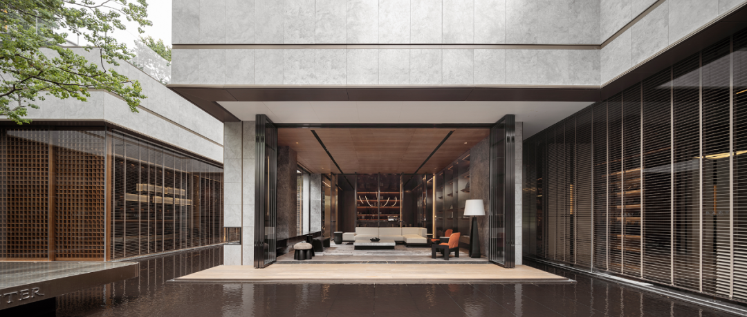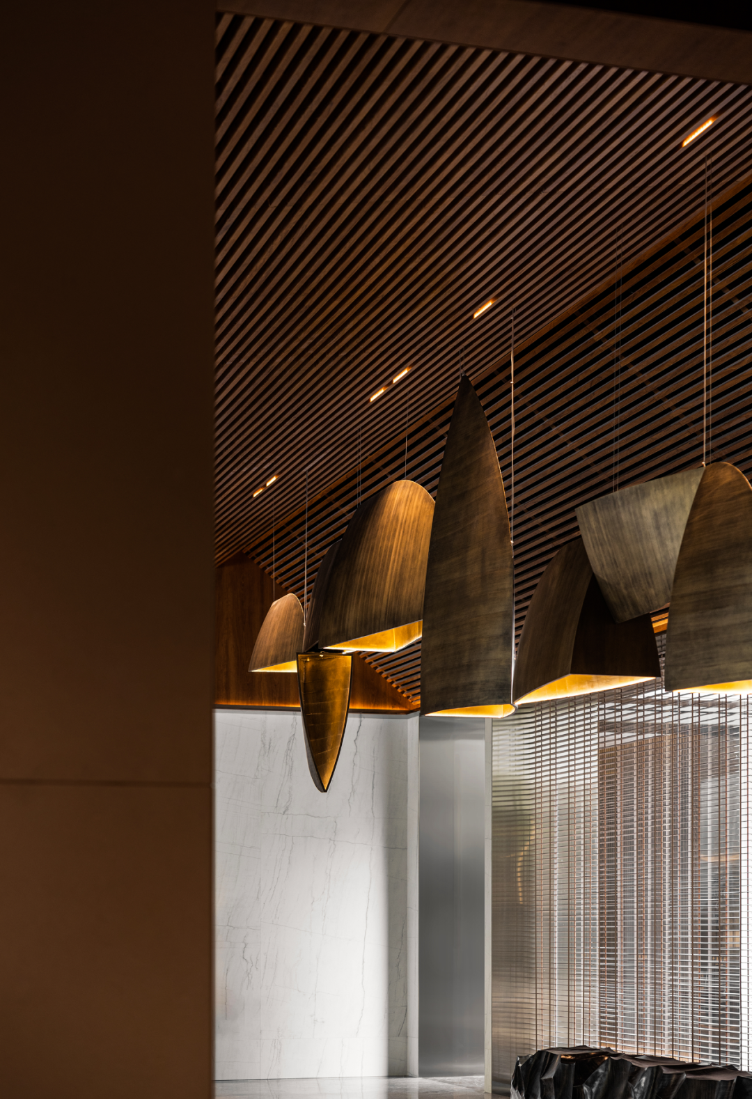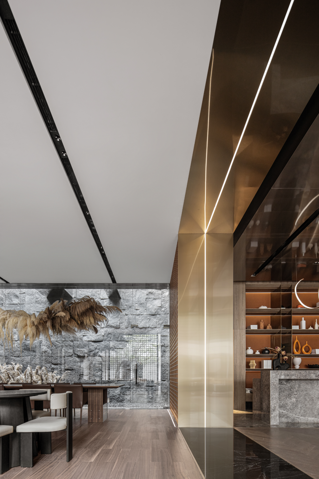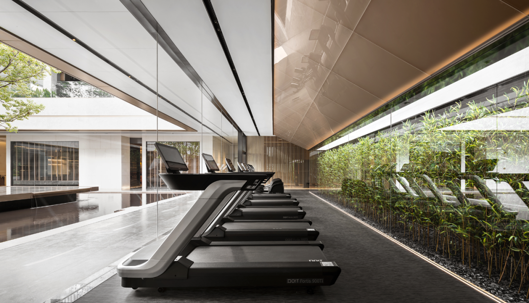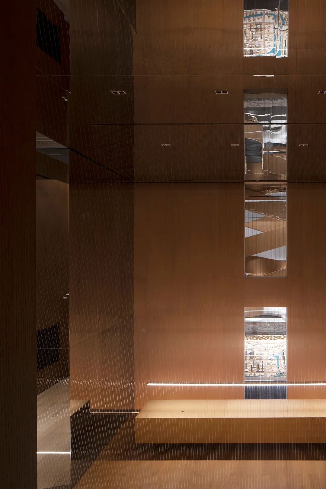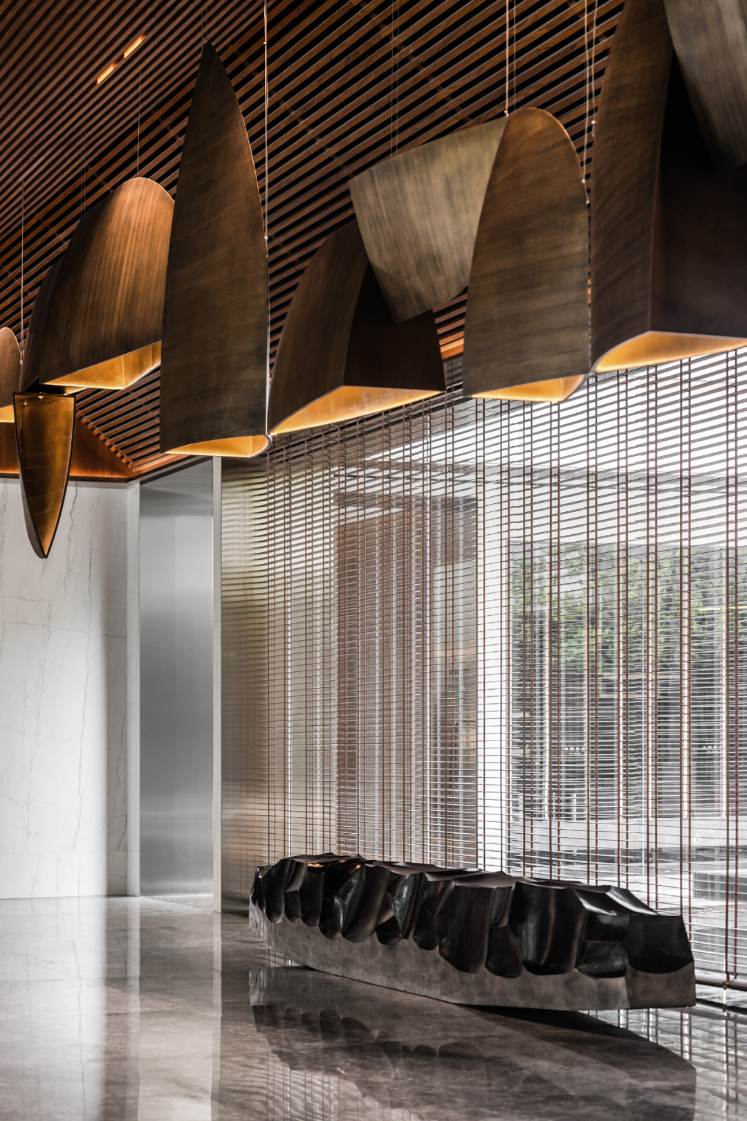 本案建筑为五栋塔楼,一层为庭院景观及连接的户外露天泳池,中间为大型的开口采光天井,巧妙地将自然光线与地面景观引入到负一层的会所空间,透过中央水景的波光反射,创造出奇妙的空间戏剧性。
