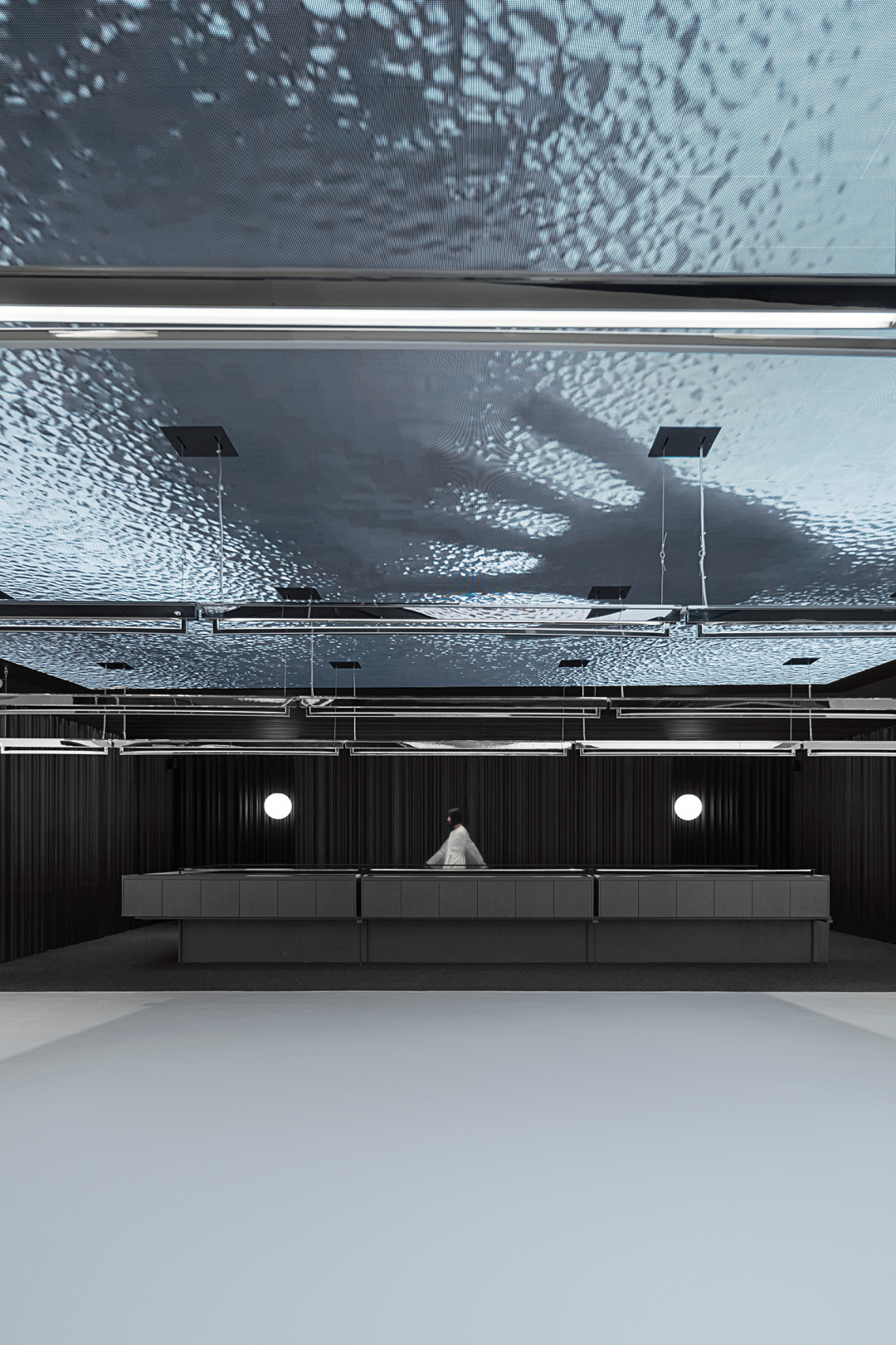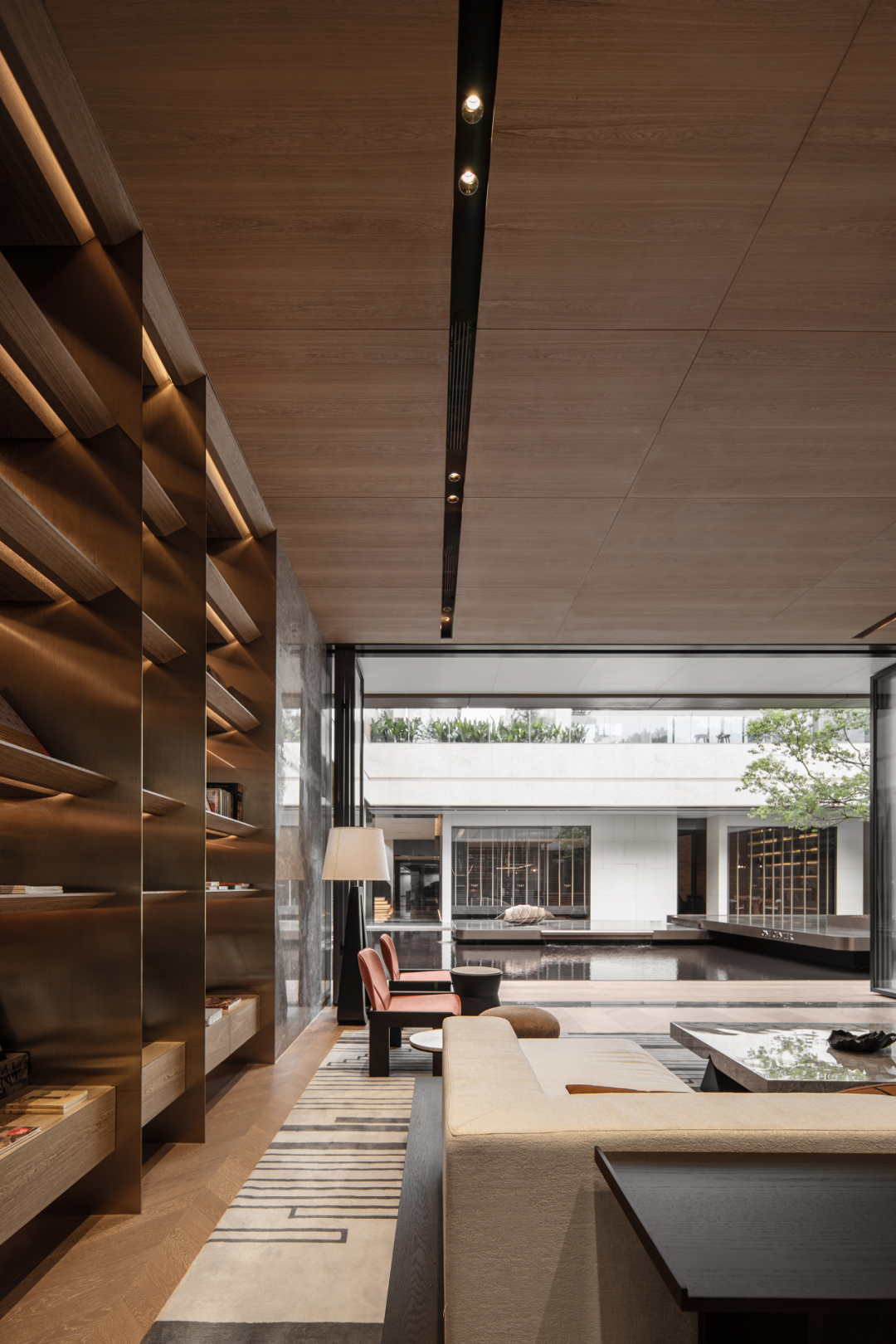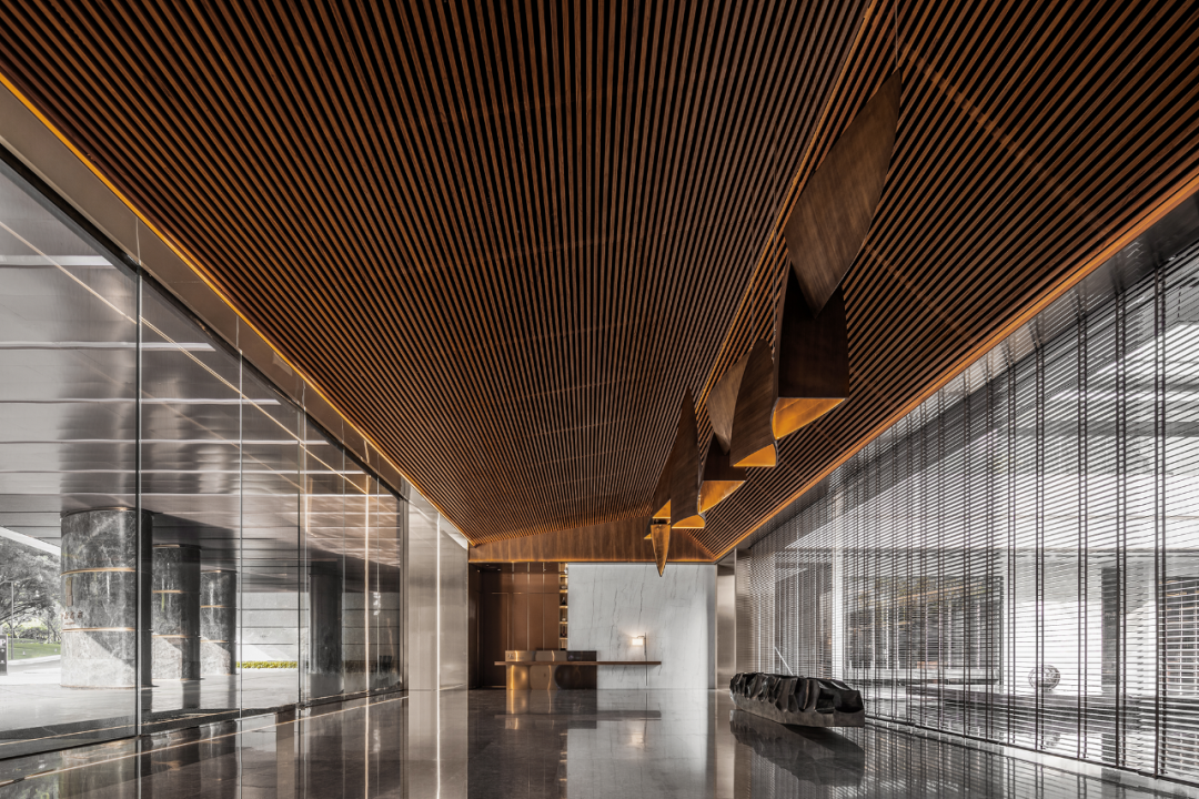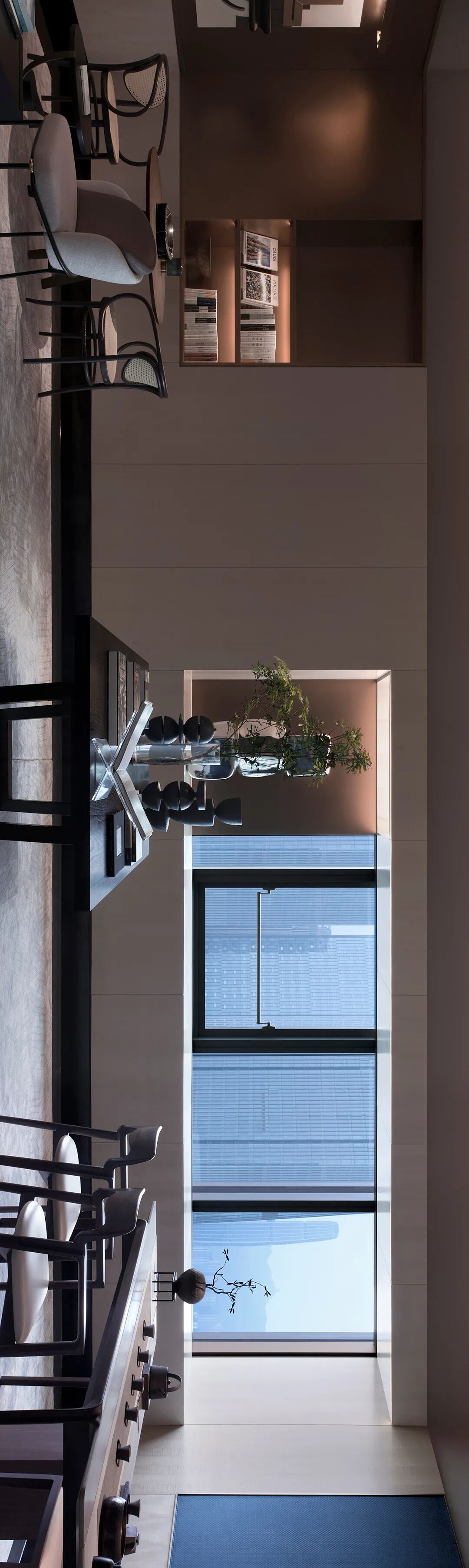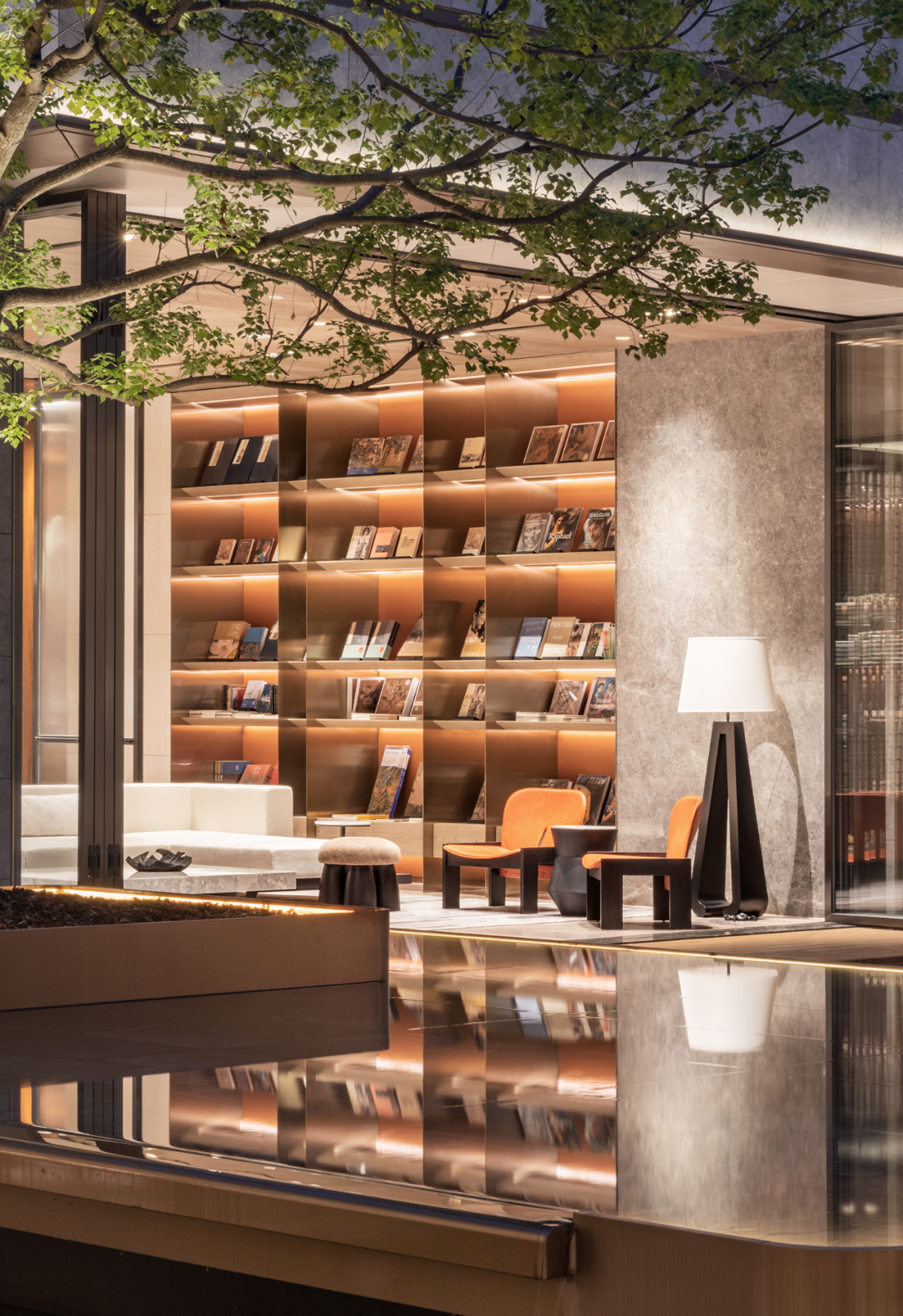 本案建筑为五栋塔楼,一层为庭院景观及连接的户外露天泳池,中间为大型的开口采光天井,巧妙地将自然光线与地面景观引入到负一层的会所空间,透过中央水景的波光反射,创造出奇妙的空间戏剧性。