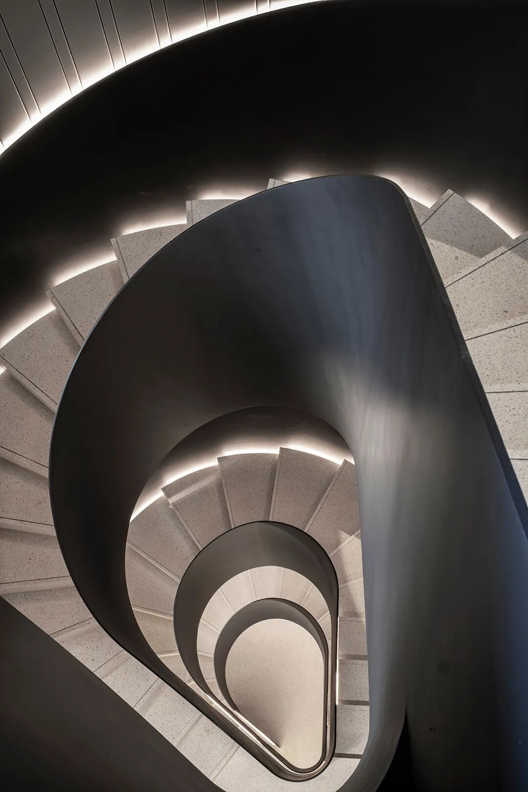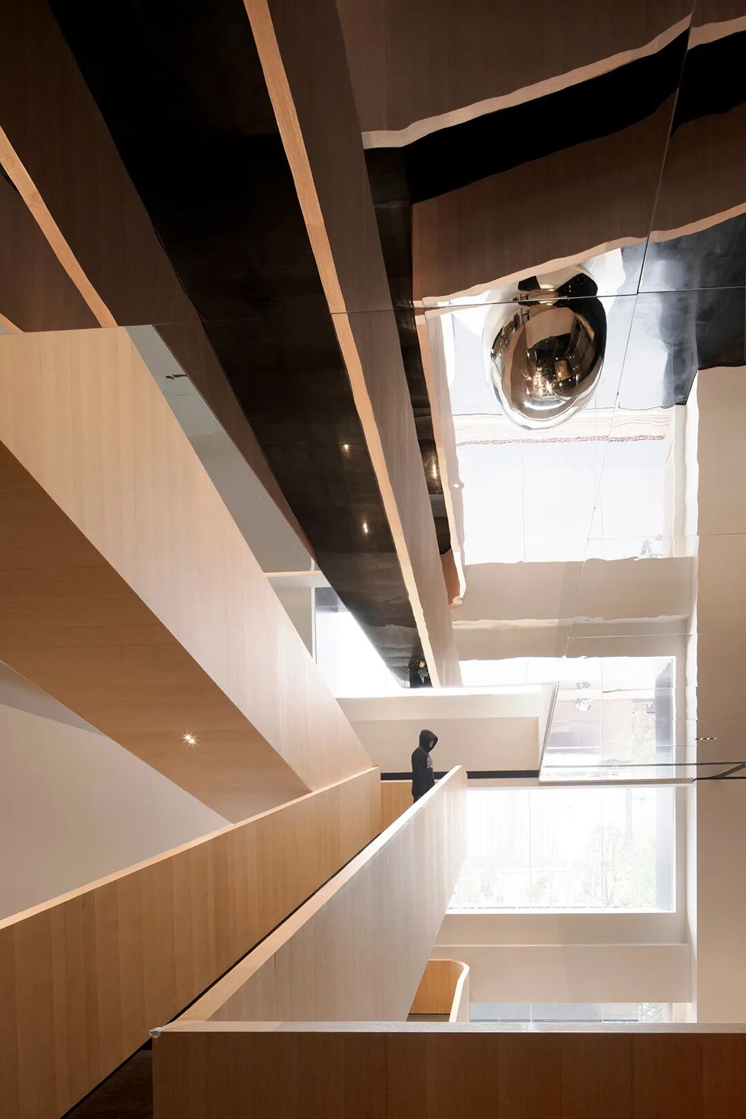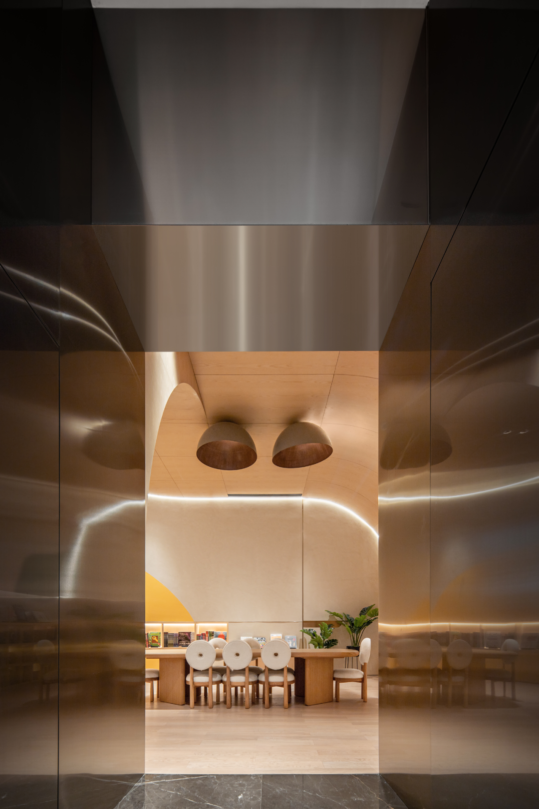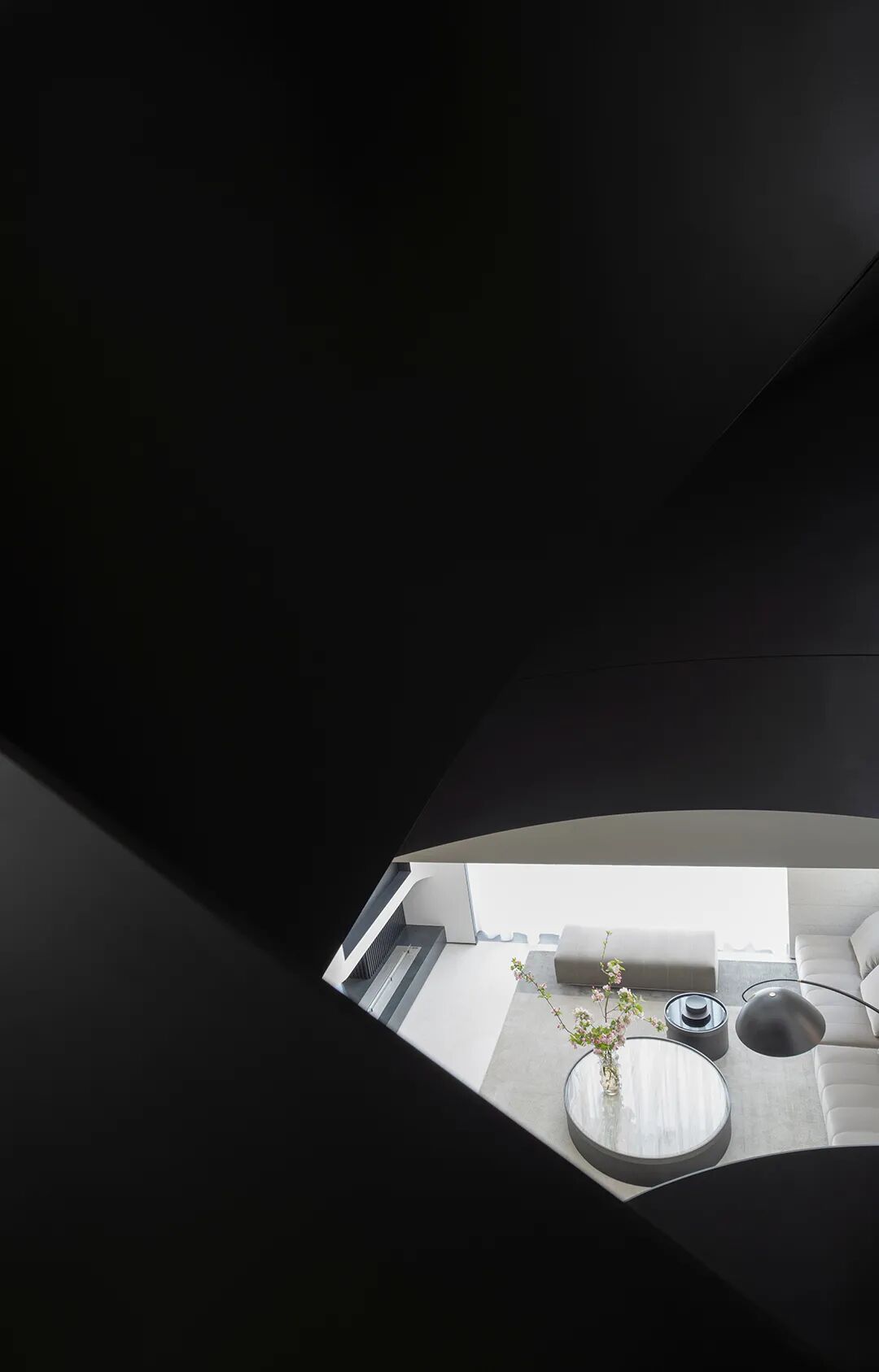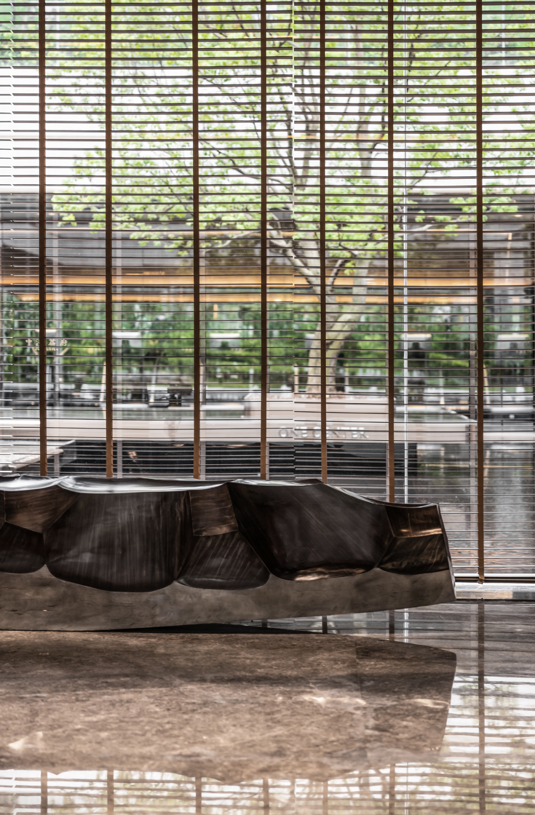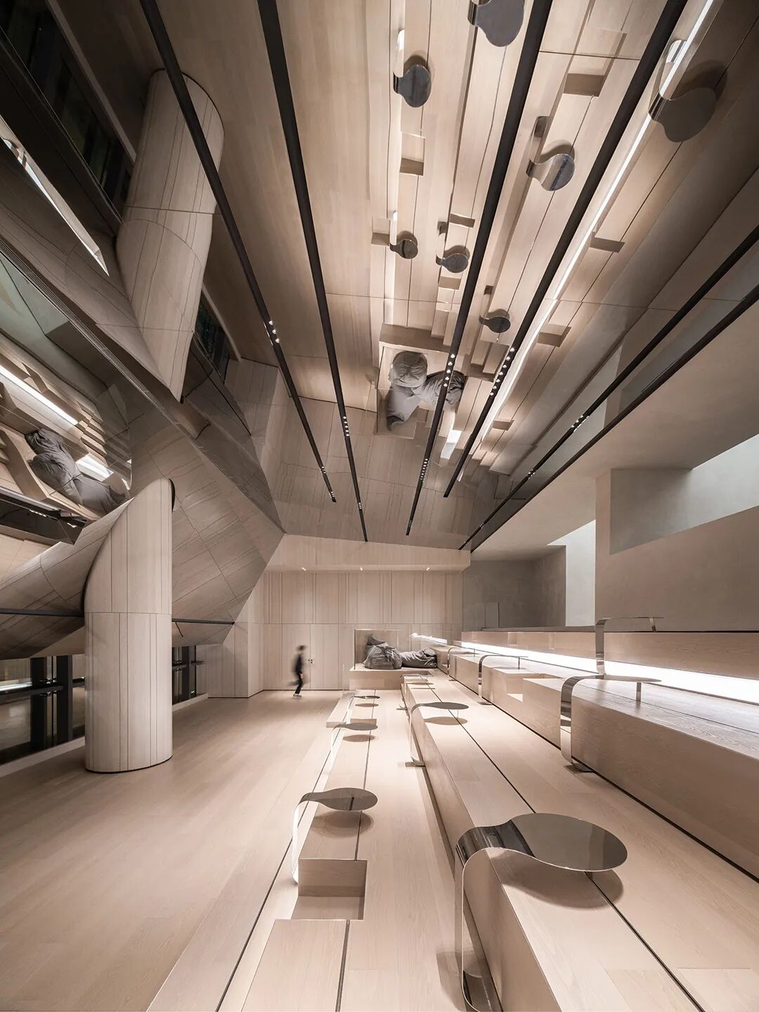 本案建筑为五栋塔楼,一层为庭院景观及连接的户外露天泳池,中间为大型的开口采光天井,巧妙地将自然光线与地面景观引入到负一层的会所空间,透过中央水景的波光反射,创造出奇妙的空间戏剧性。