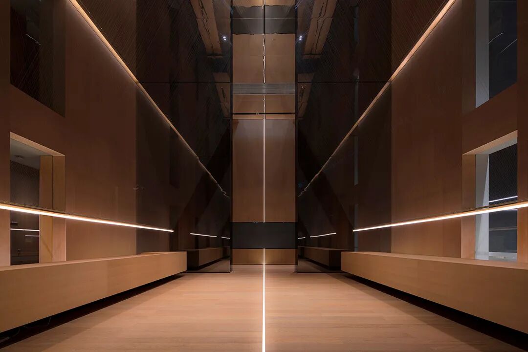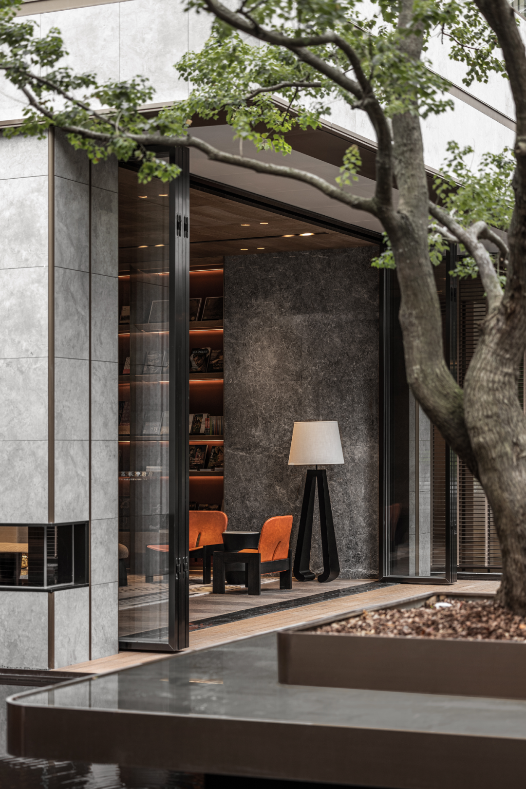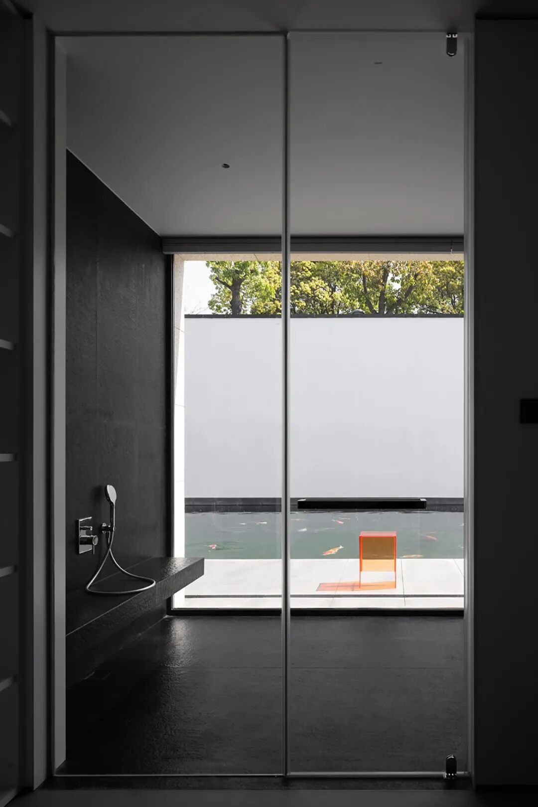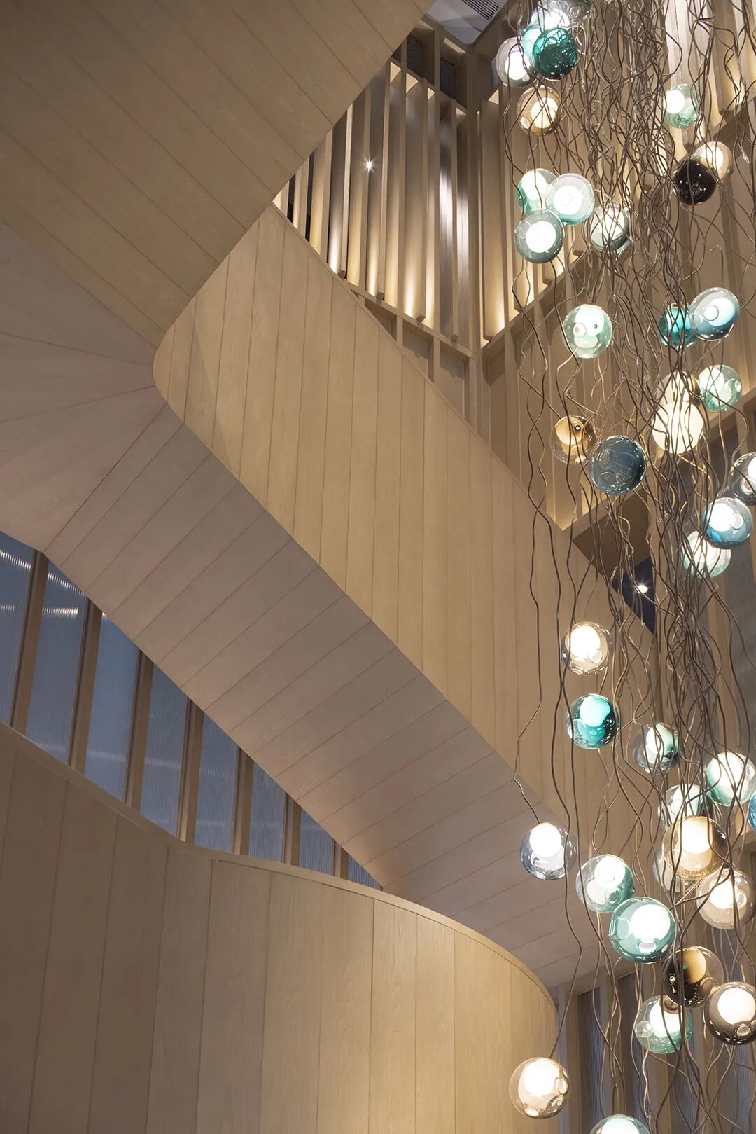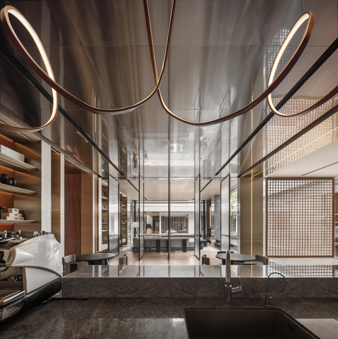 本案建筑为五栋塔楼,一层为庭院景观及连接的户外露天泳池,中间为大型的开口采光天井,巧妙地将自然光线与地面景观引入到负一层的会所空间,透过中央水景的波光反射,创造出奇妙的空间戏剧性。