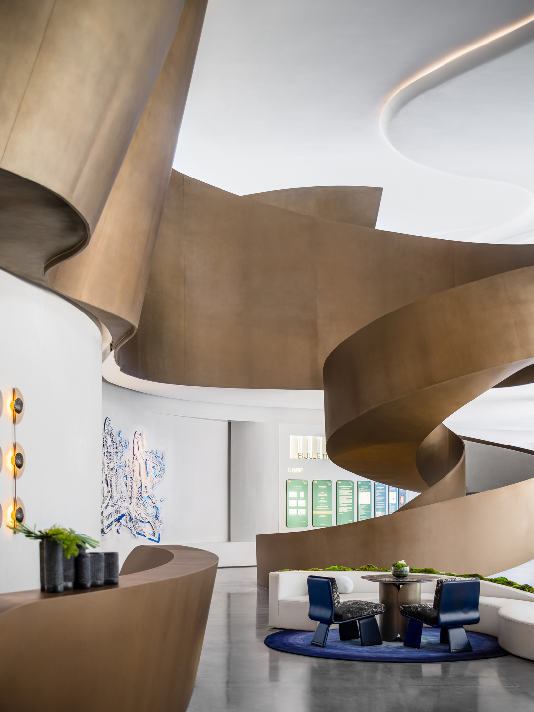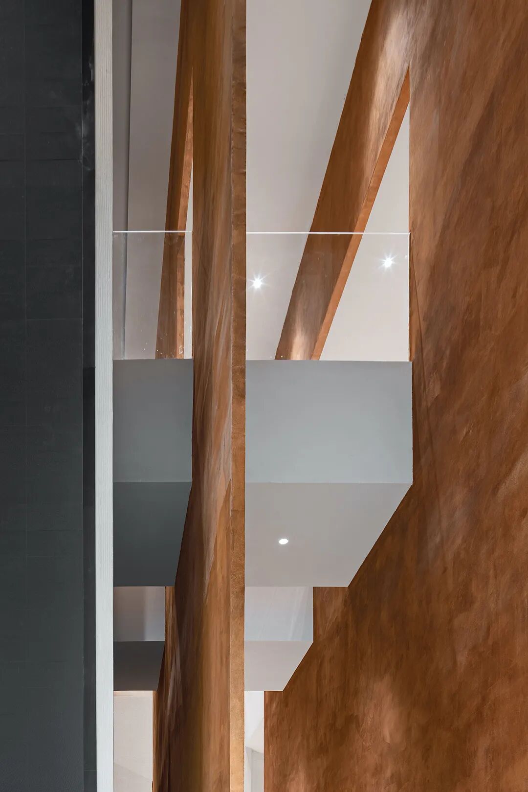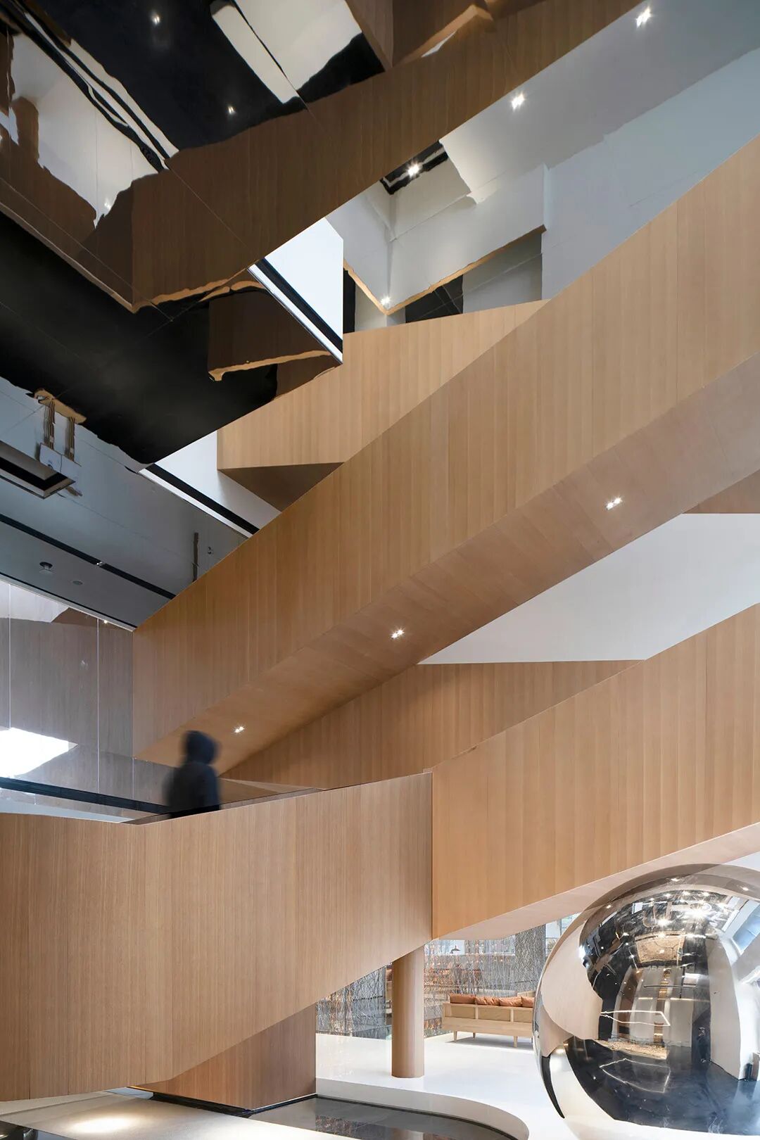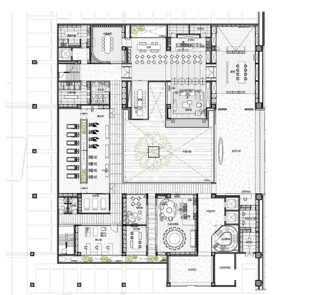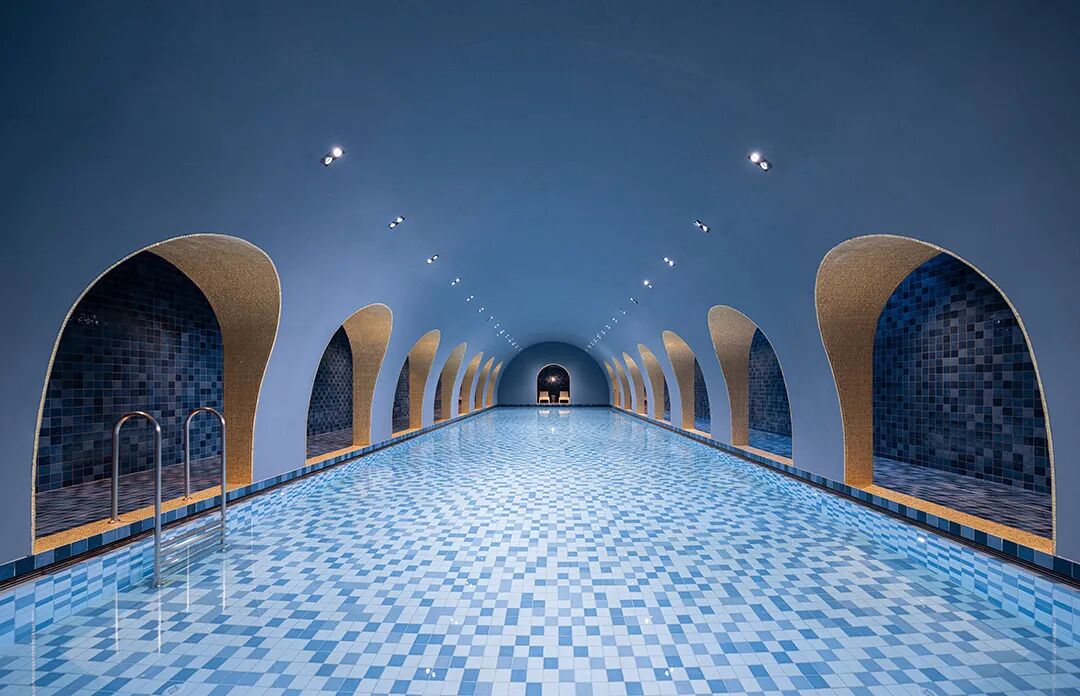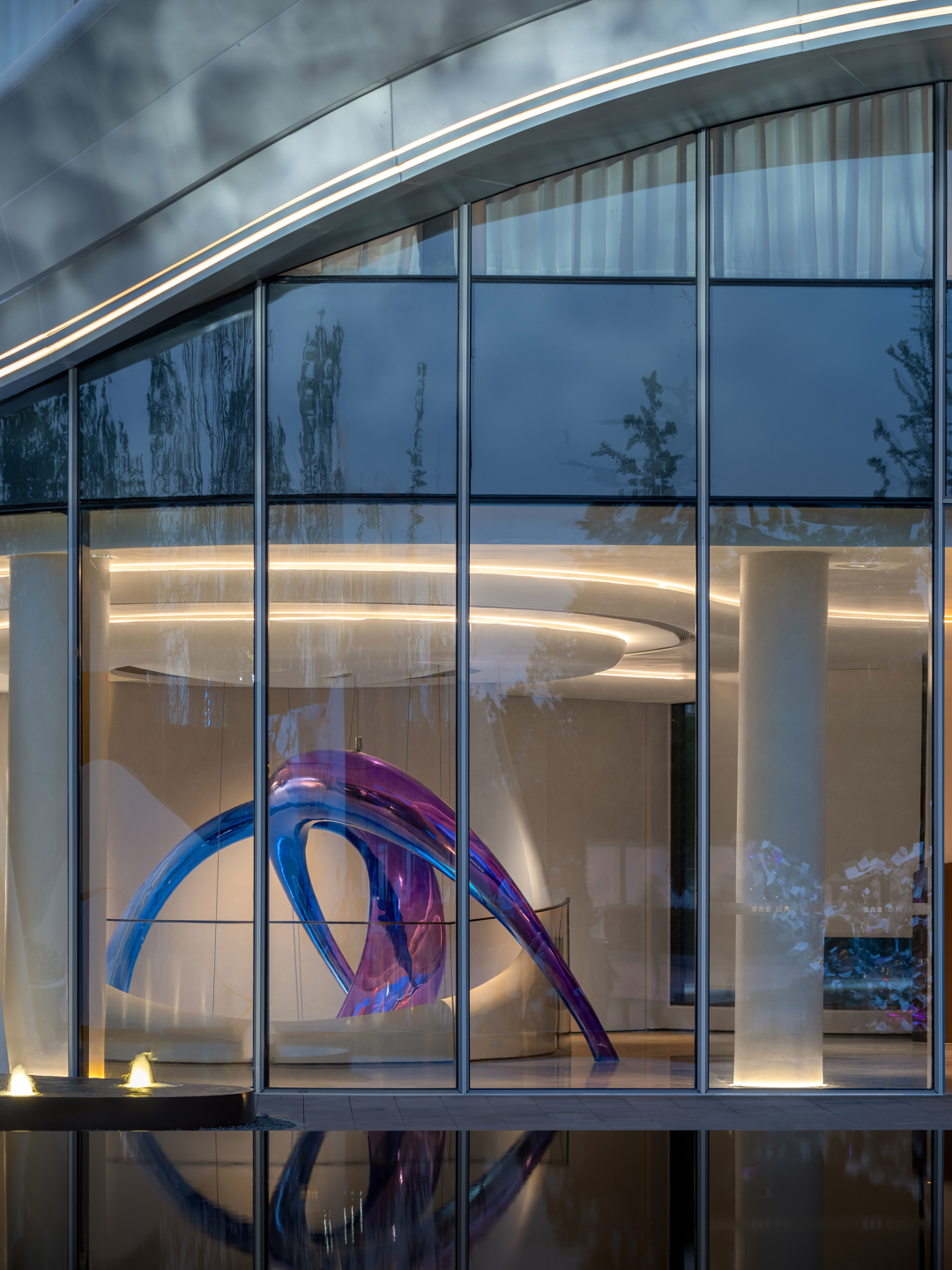 本案建筑为五栋塔楼,一层为庭院景观及连接的户外露天泳池,中间为大型的开口采光天井,巧妙地将自然光线与地面景观引入到负一层的会所空间,透过中央水景的波光反射,创造出奇妙的空间戏剧性。