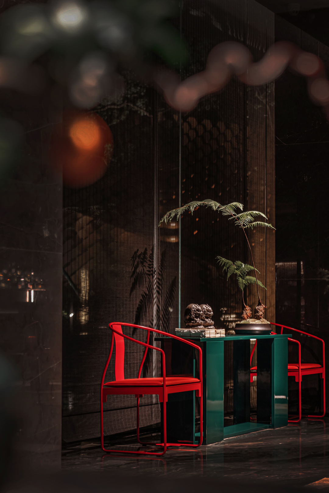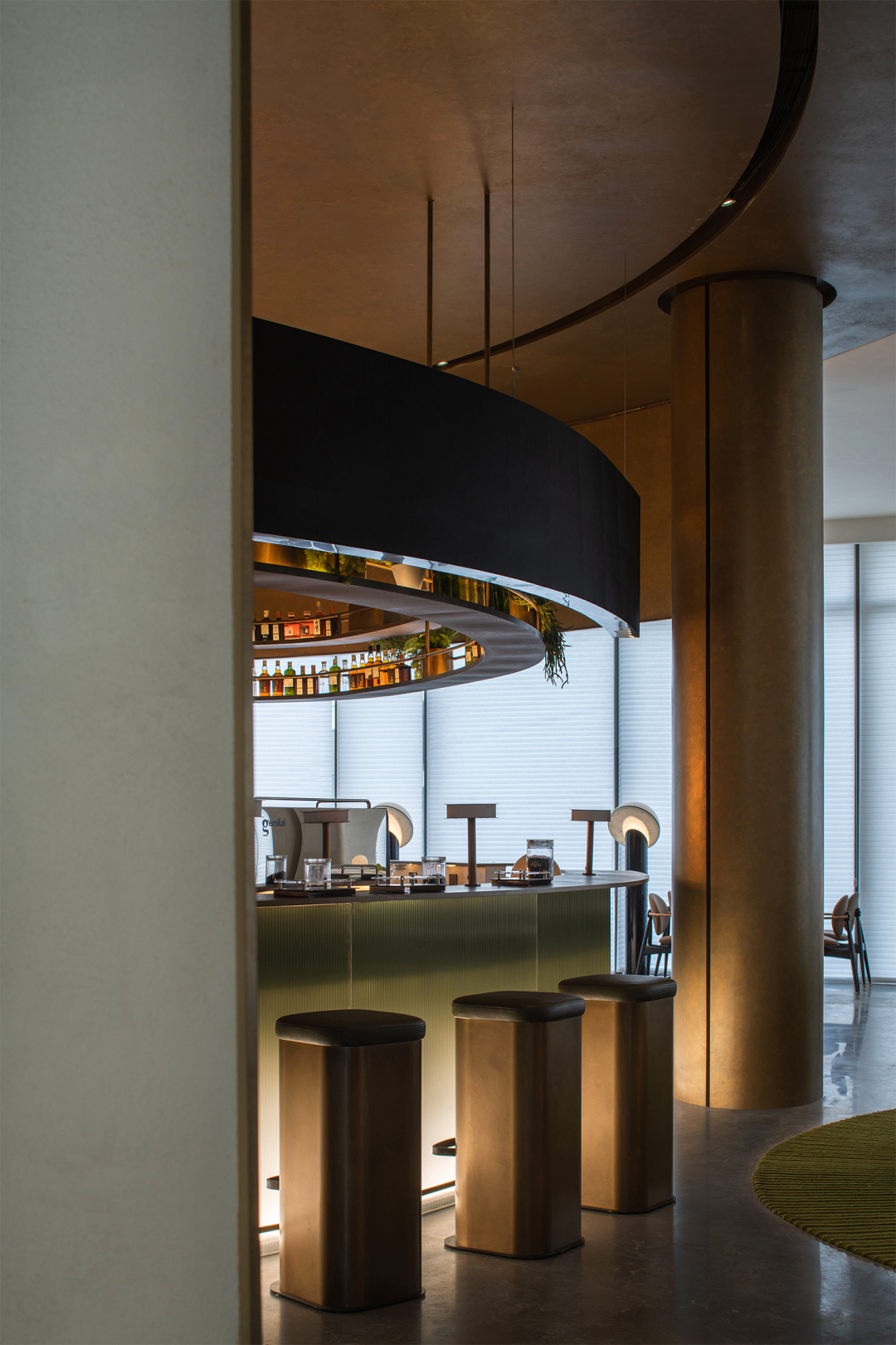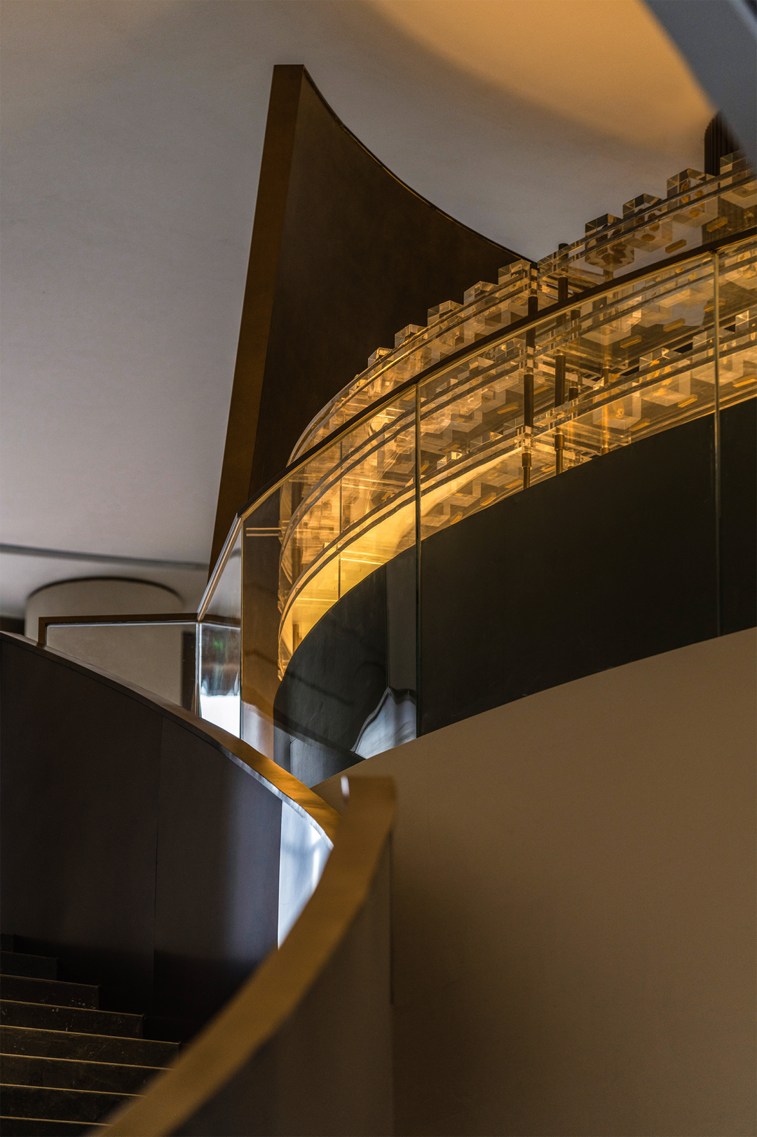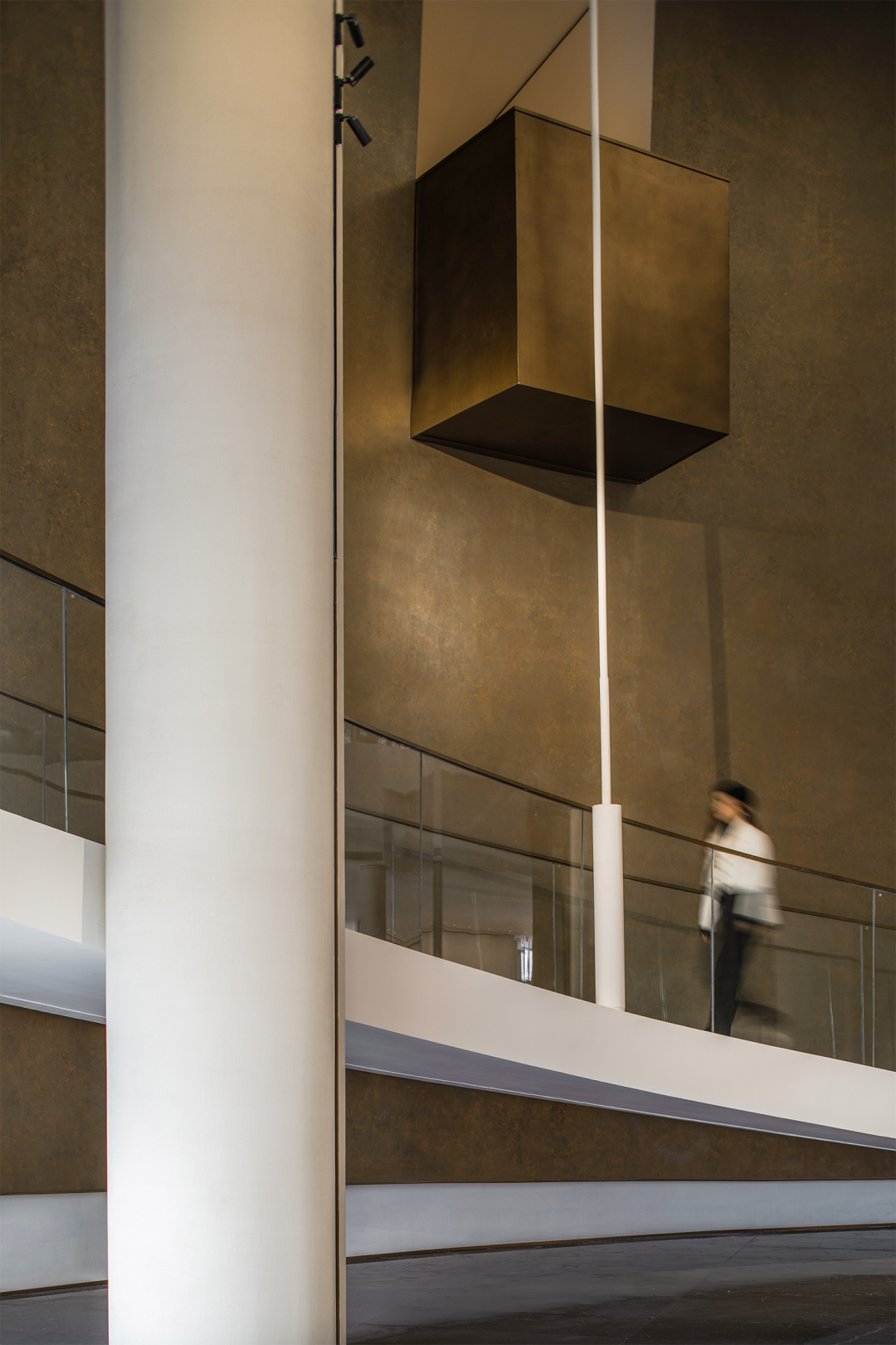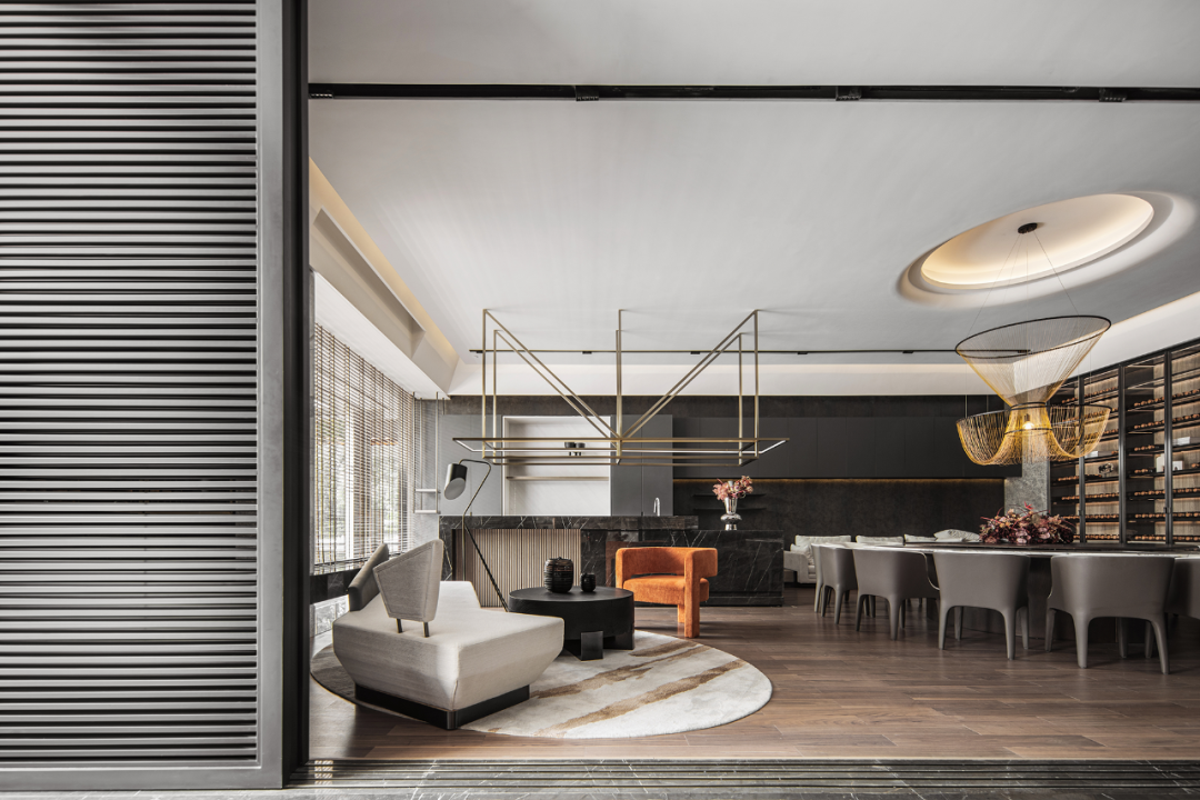 本案建筑为五栋塔楼,一层为庭院景观及连接的户外露天泳池,中间为大型的开口采光天井,巧妙地将自然光线与地面景观引入到负一层的会所空间,透过中央水景的波光反射,创造出奇妙的空间戏剧性。