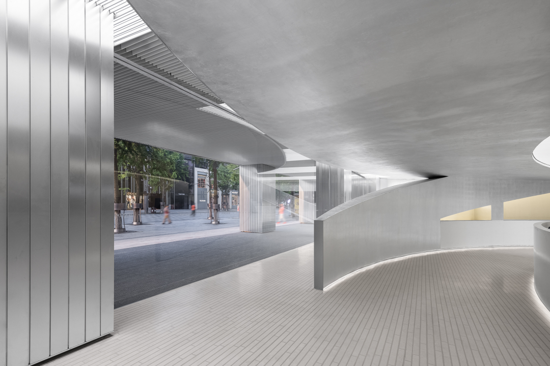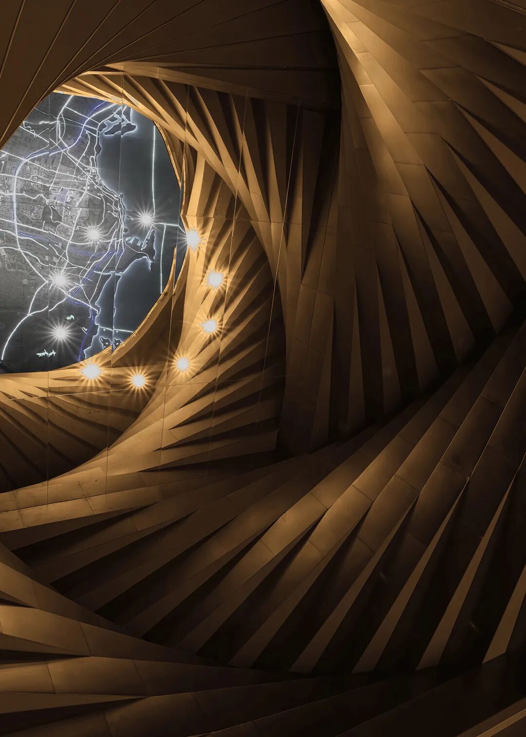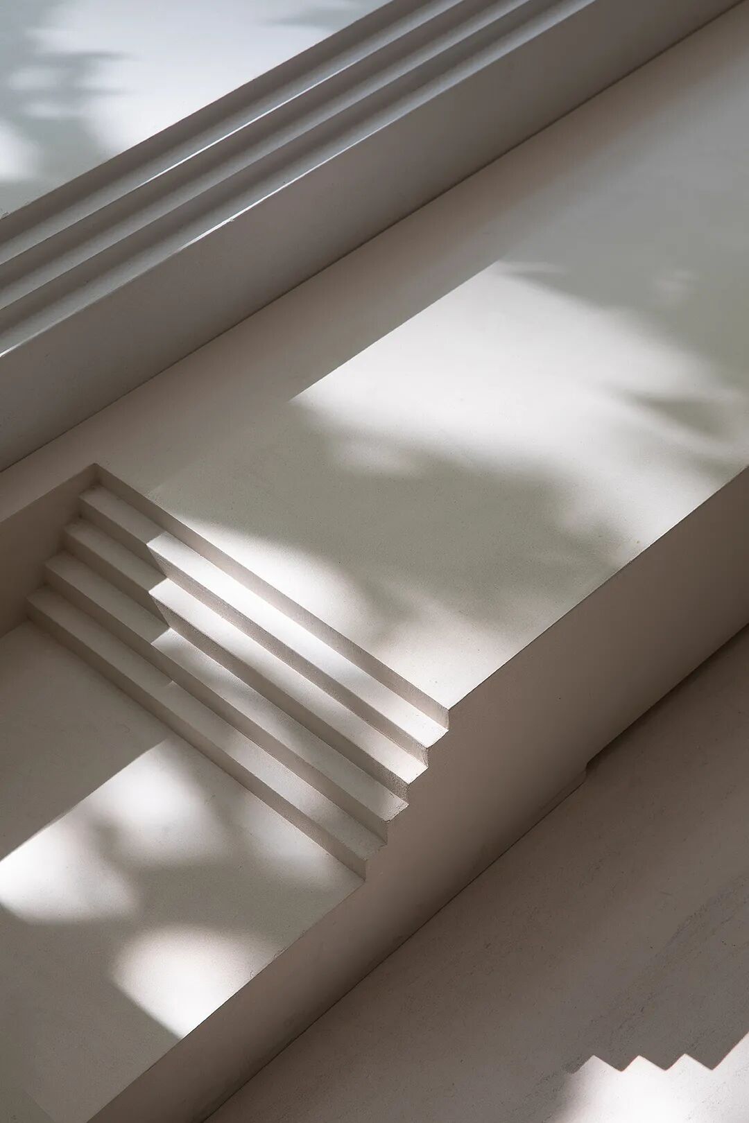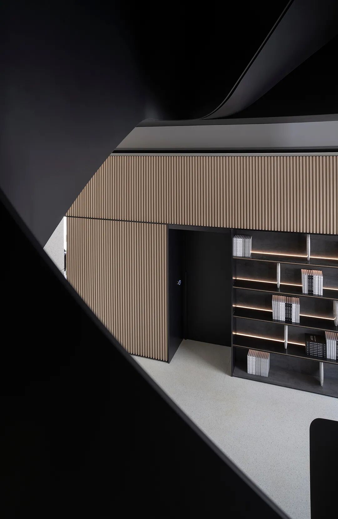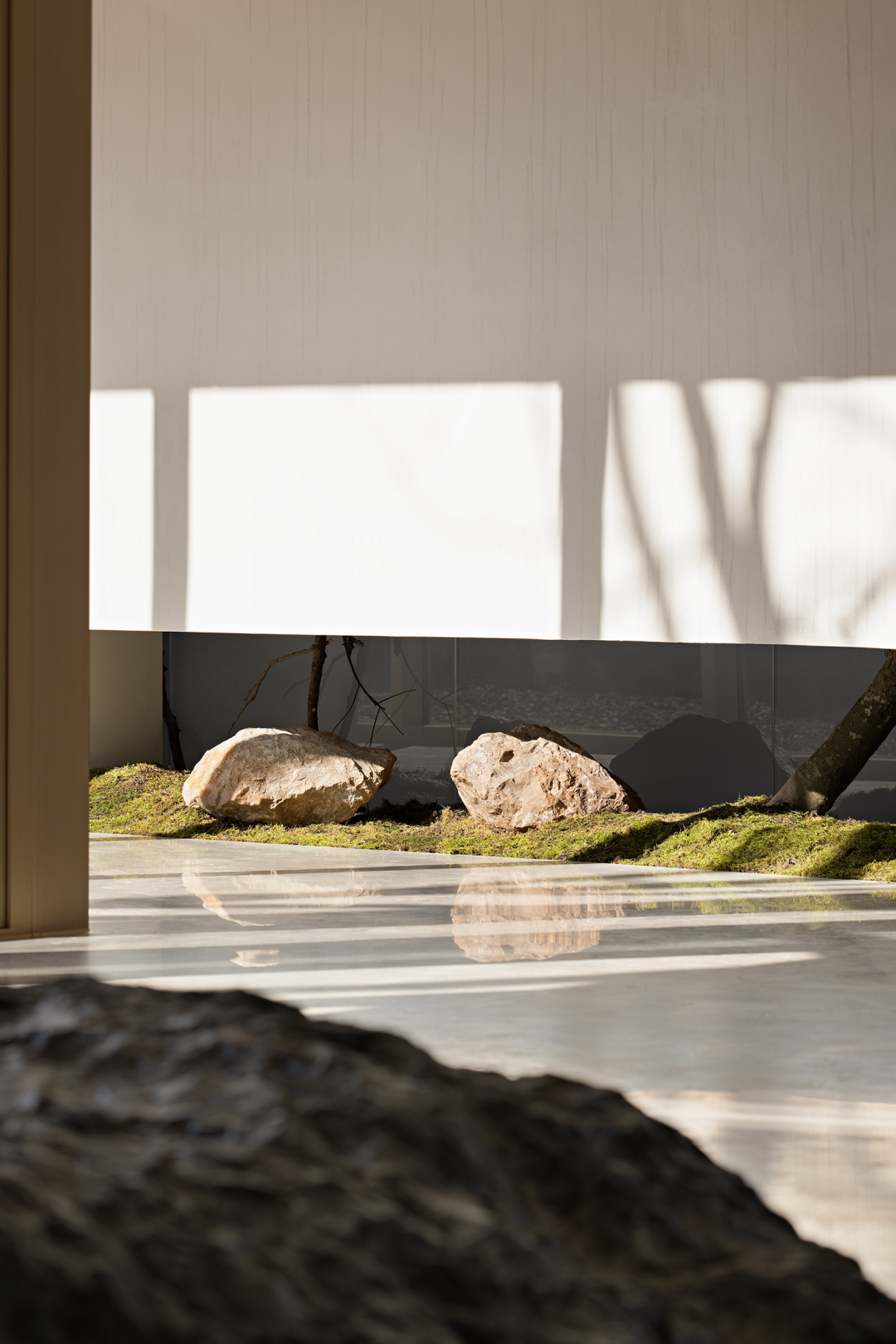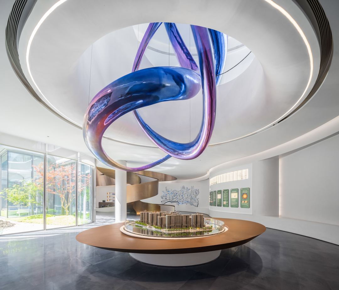 本案建筑为五栋塔楼,一层为庭院景观及连接的户外露天泳池,中间为大型的开口采光天井,巧妙地将自然光线与地面景观引入到负一层的会所空间,透过中央水景的波光反射,创造出奇妙的空间戏剧性。