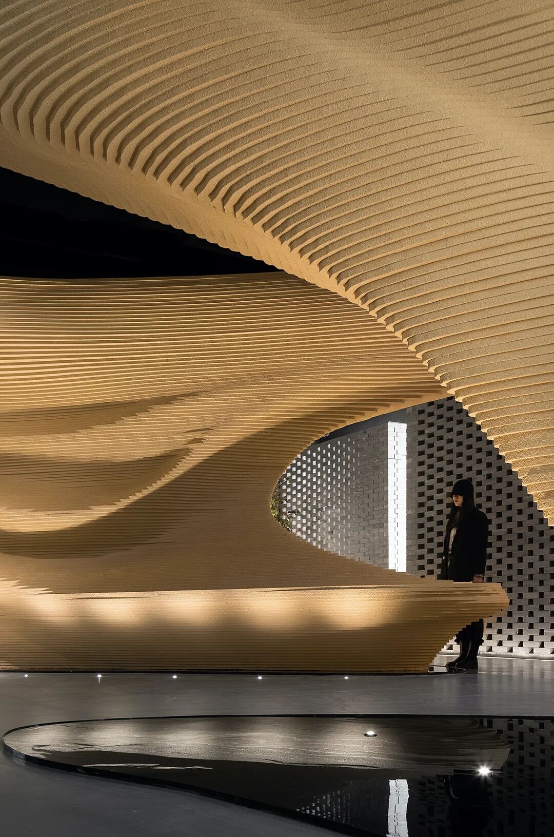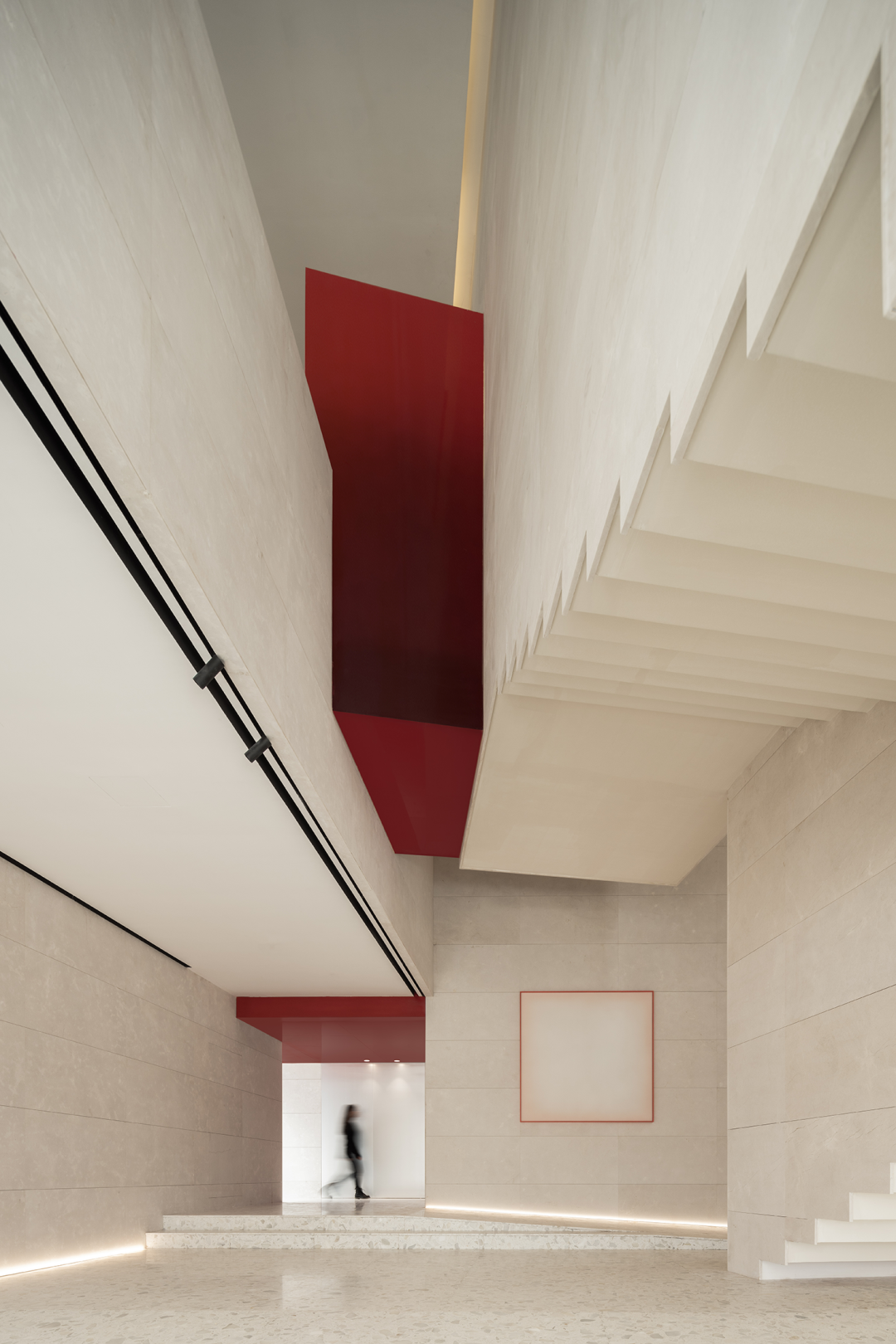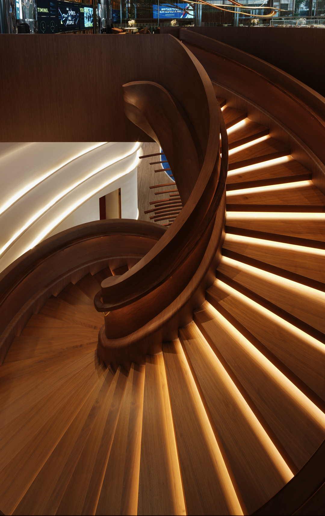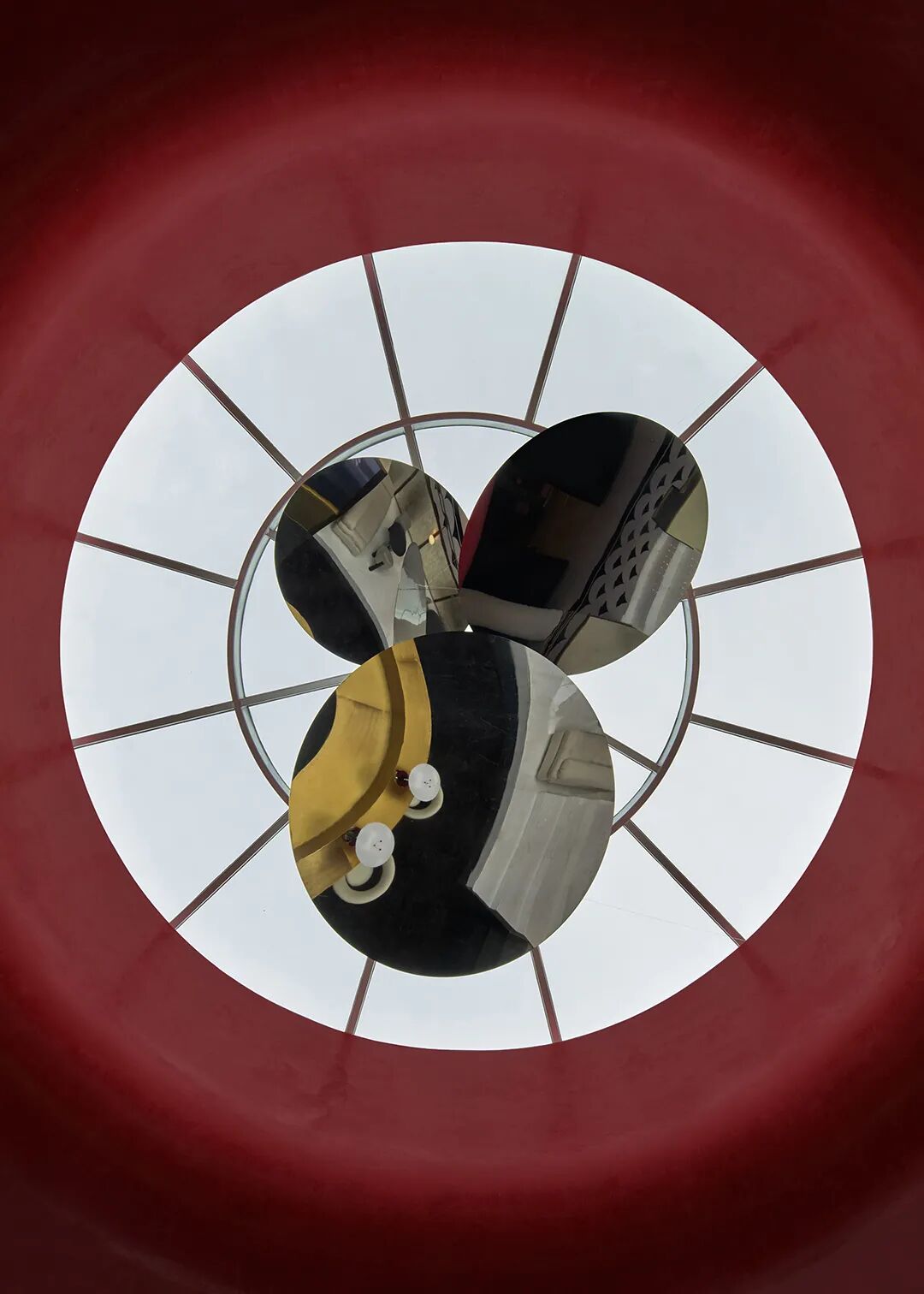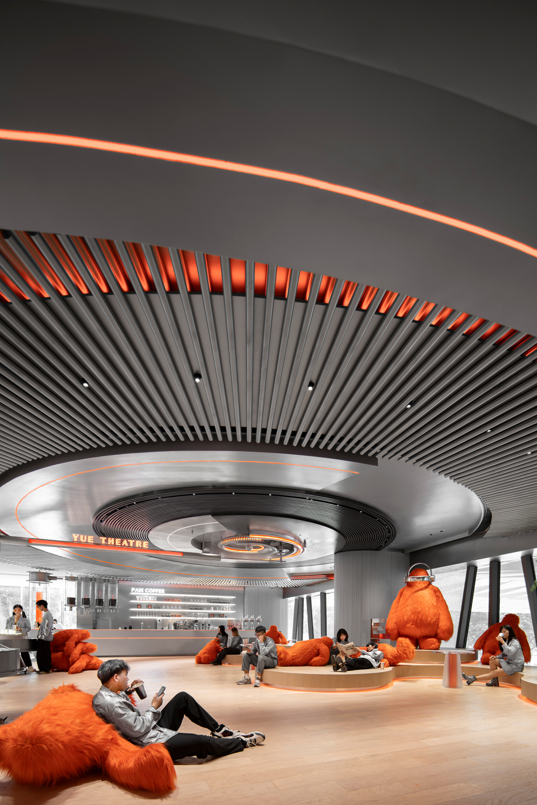 本案建筑为五栋塔楼,一层为庭院景观及连接的户外露天泳池,中间为大型的开口采光天井,巧妙地将自然光线与地面景观引入到负一层的会所空间,透过中央水景的波光反射,创造出奇妙的空间戏剧性。