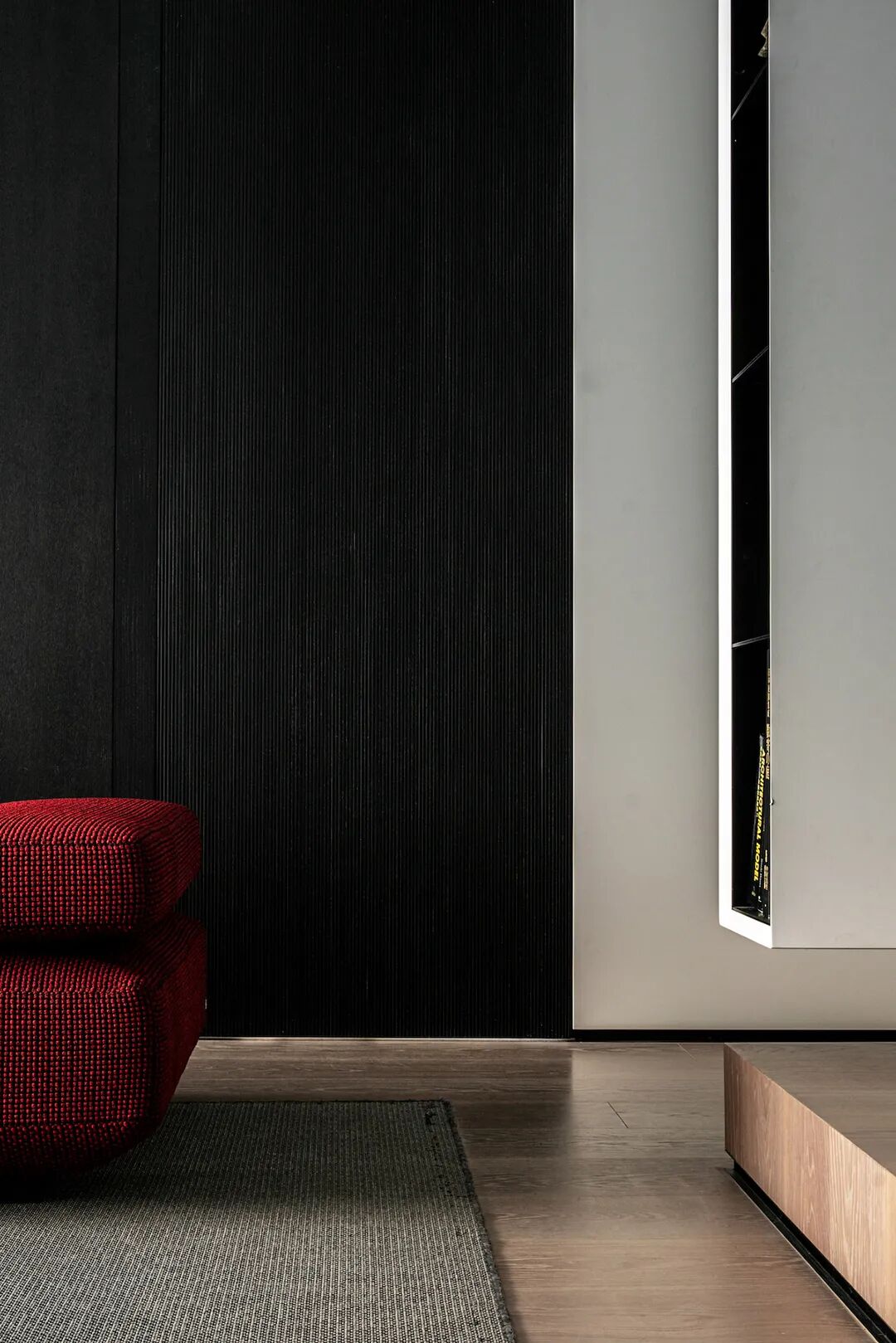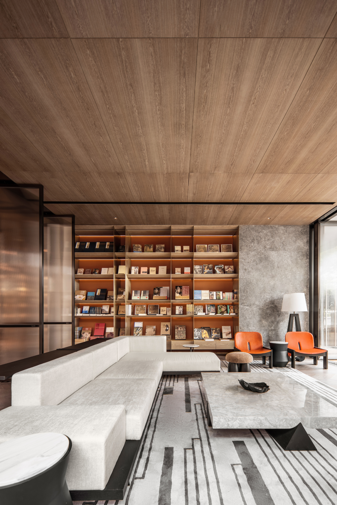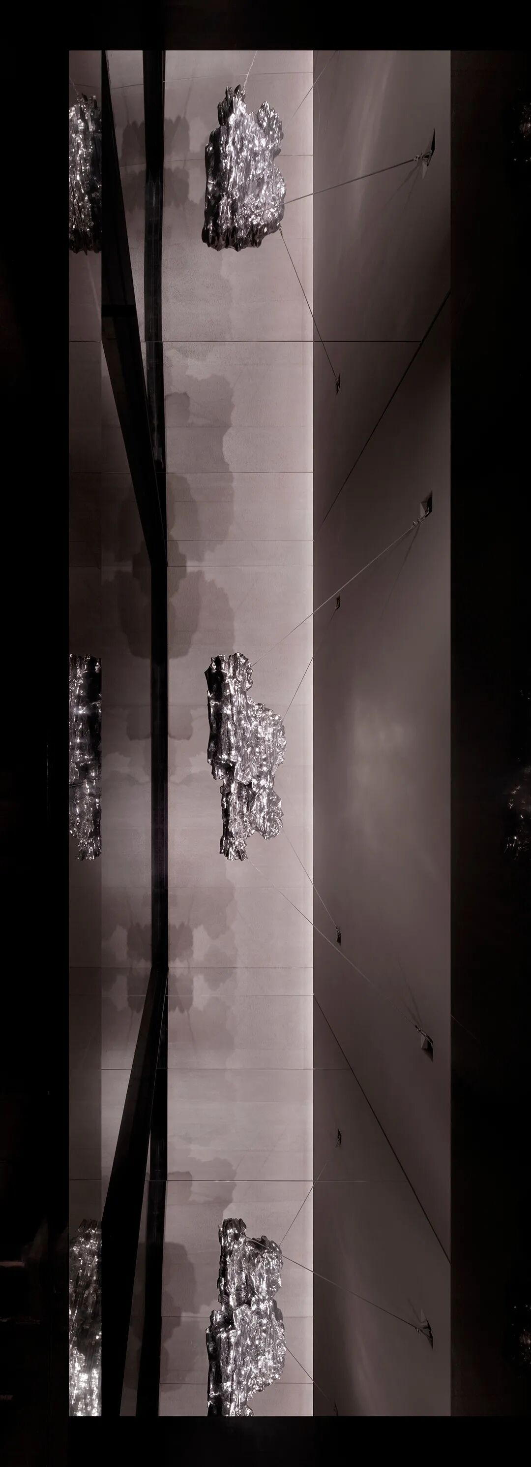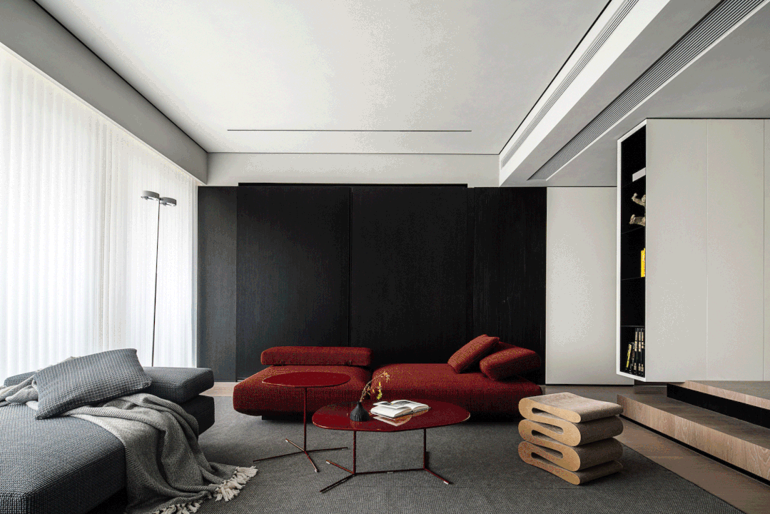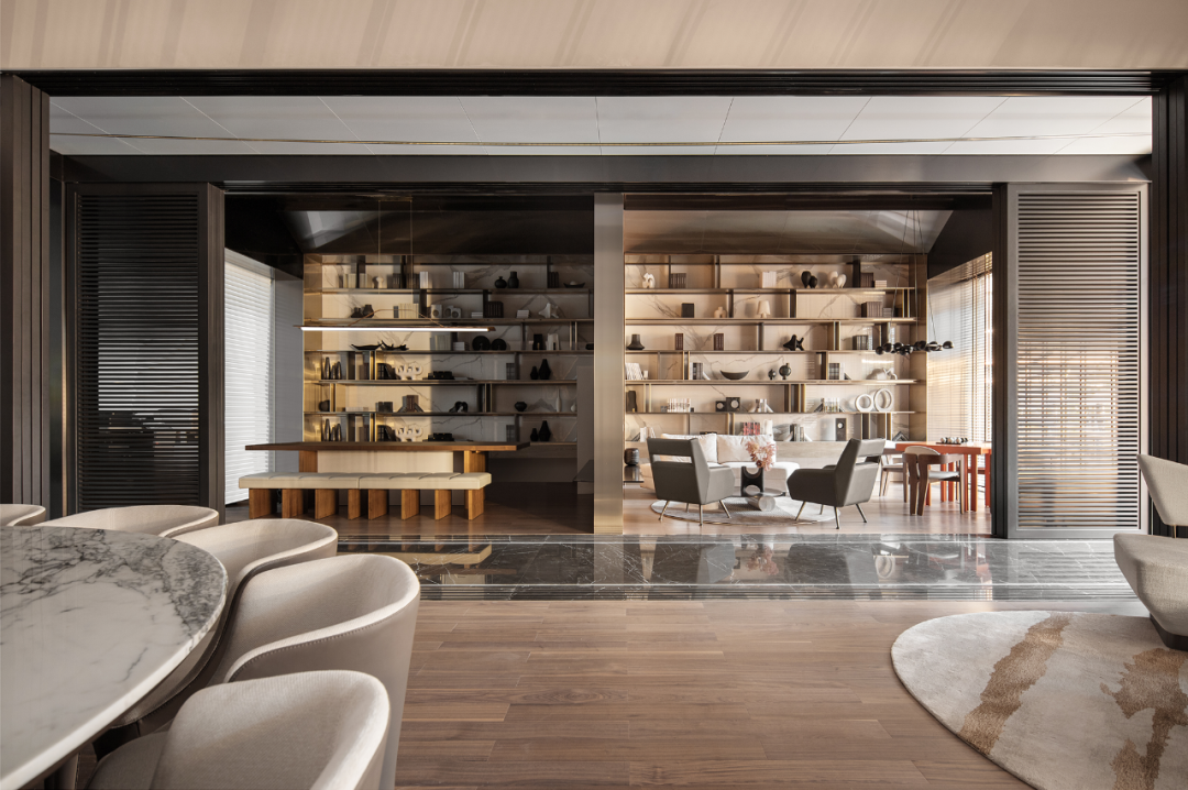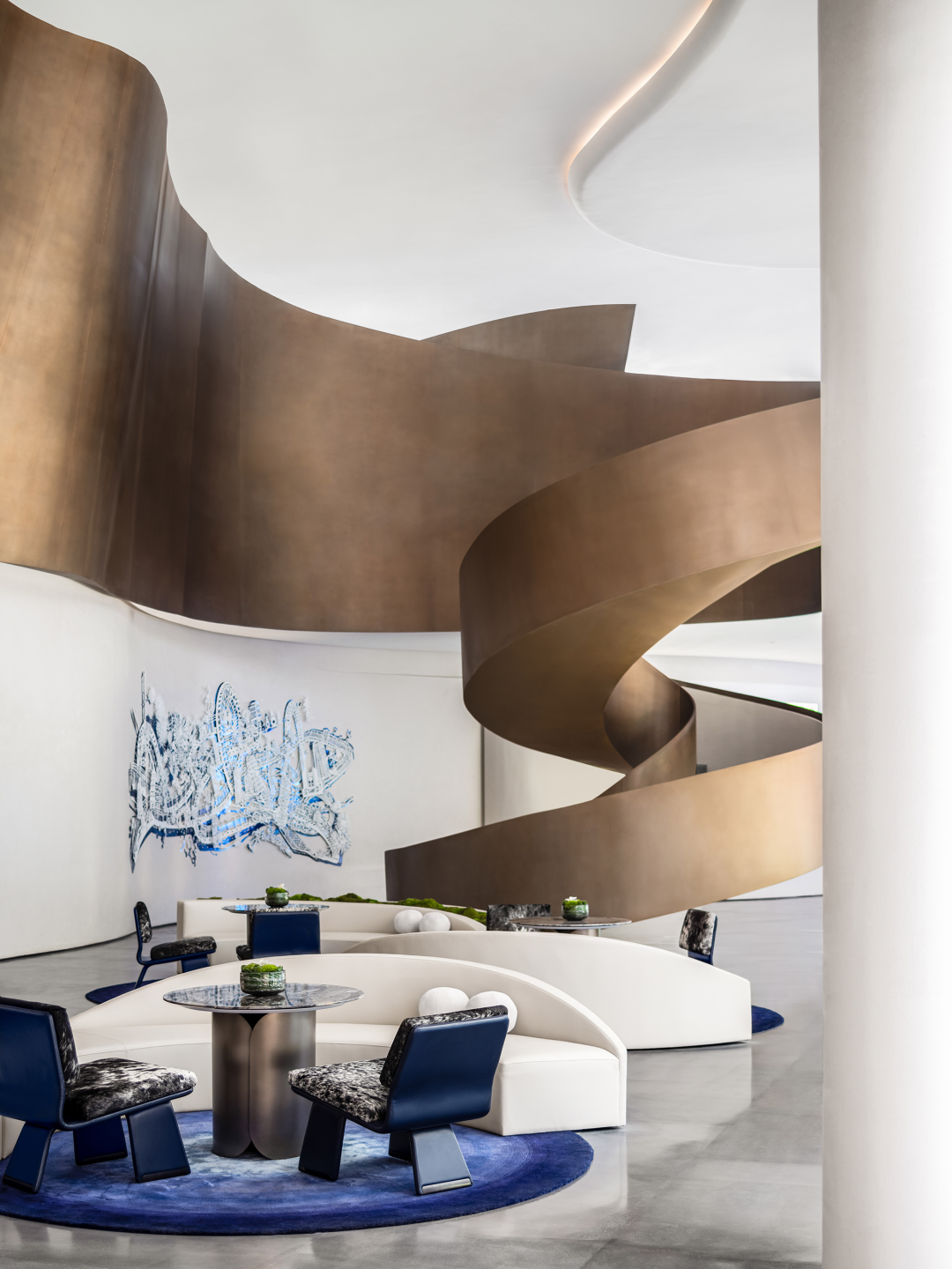 本案建筑为五栋塔楼,一层为庭院景观及连接的户外露天泳池,中间为大型的开口采光天井,巧妙地将自然光线与地面景观引入到负一层的会所空间,透过中央水景的波光反射,创造出奇妙的空间戏剧性。