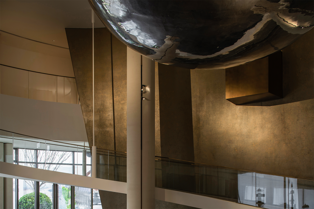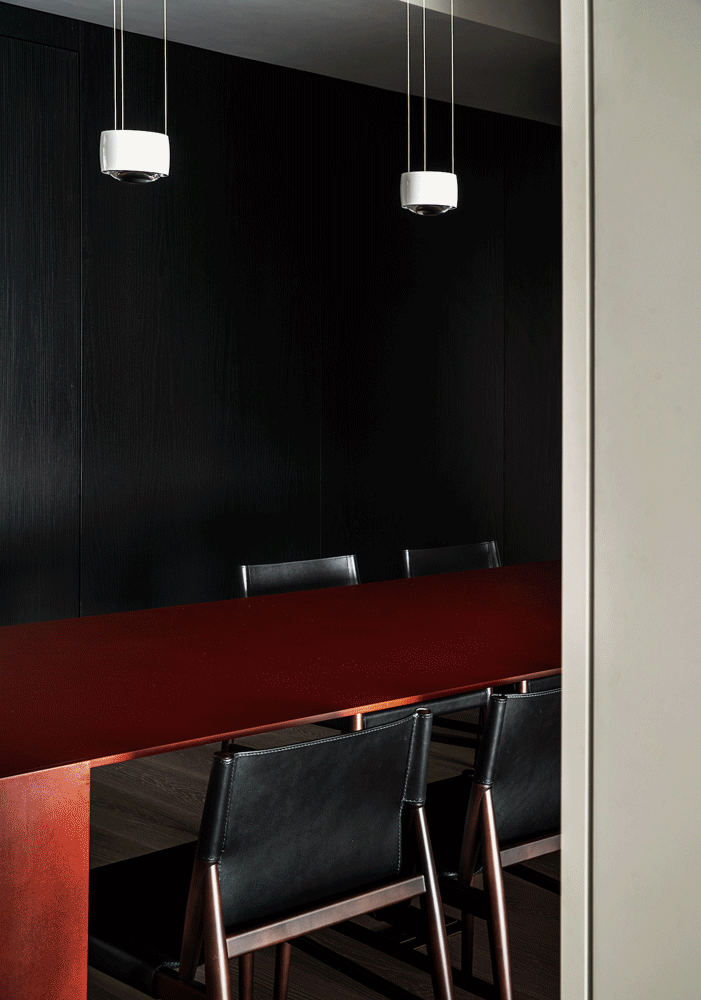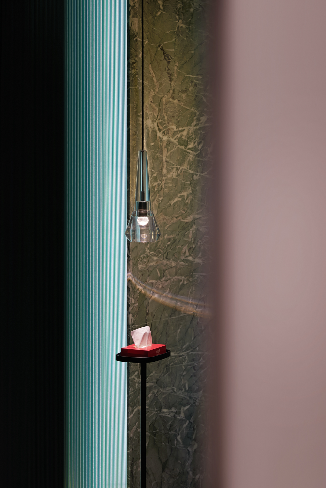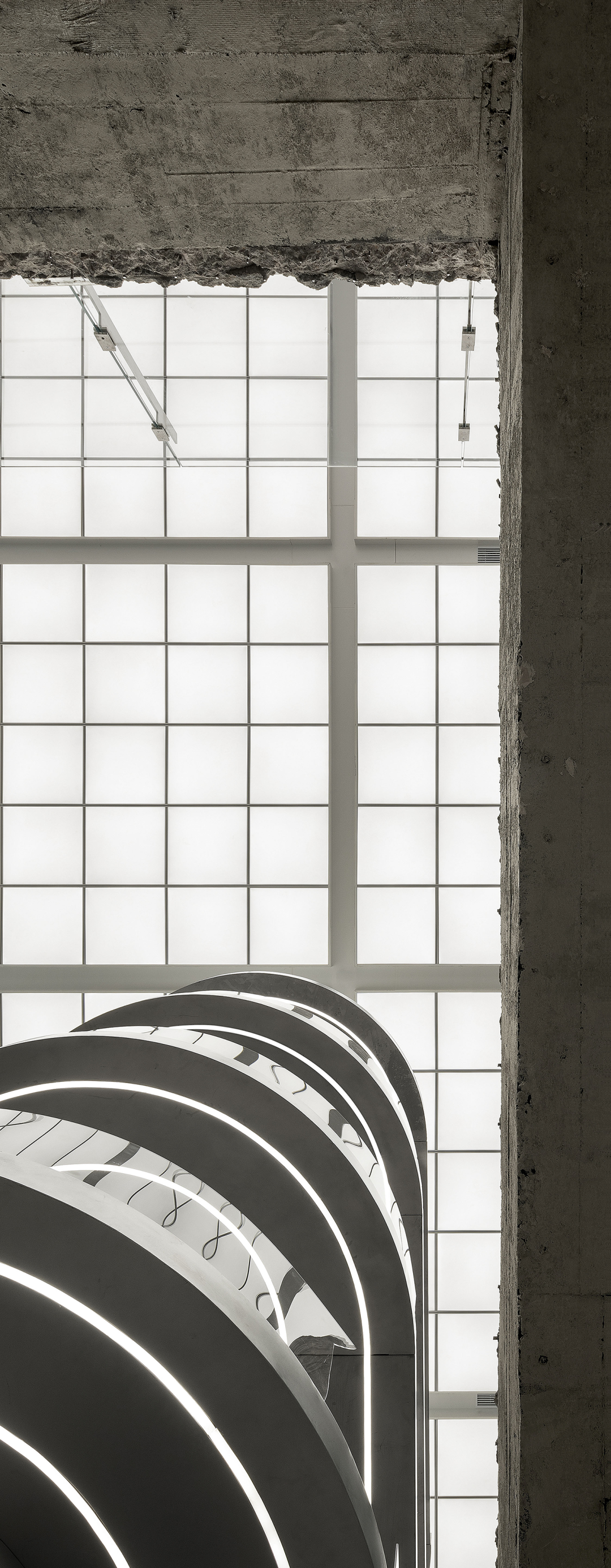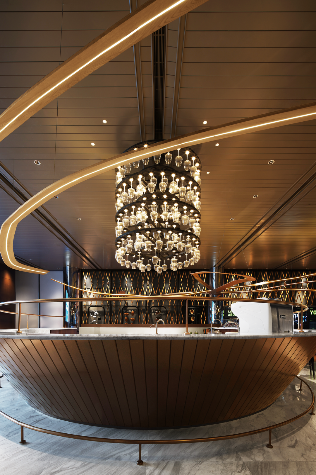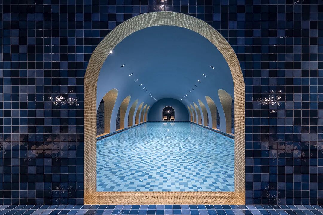 本案建筑为五栋塔楼,一层为庭院景观及连接的户外露天泳池,中间为大型的开口采光天井,巧妙地将自然光线与地面景观引入到负一层的会所空间,透过中央水景的波光反射,创造出奇妙的空间戏剧性。