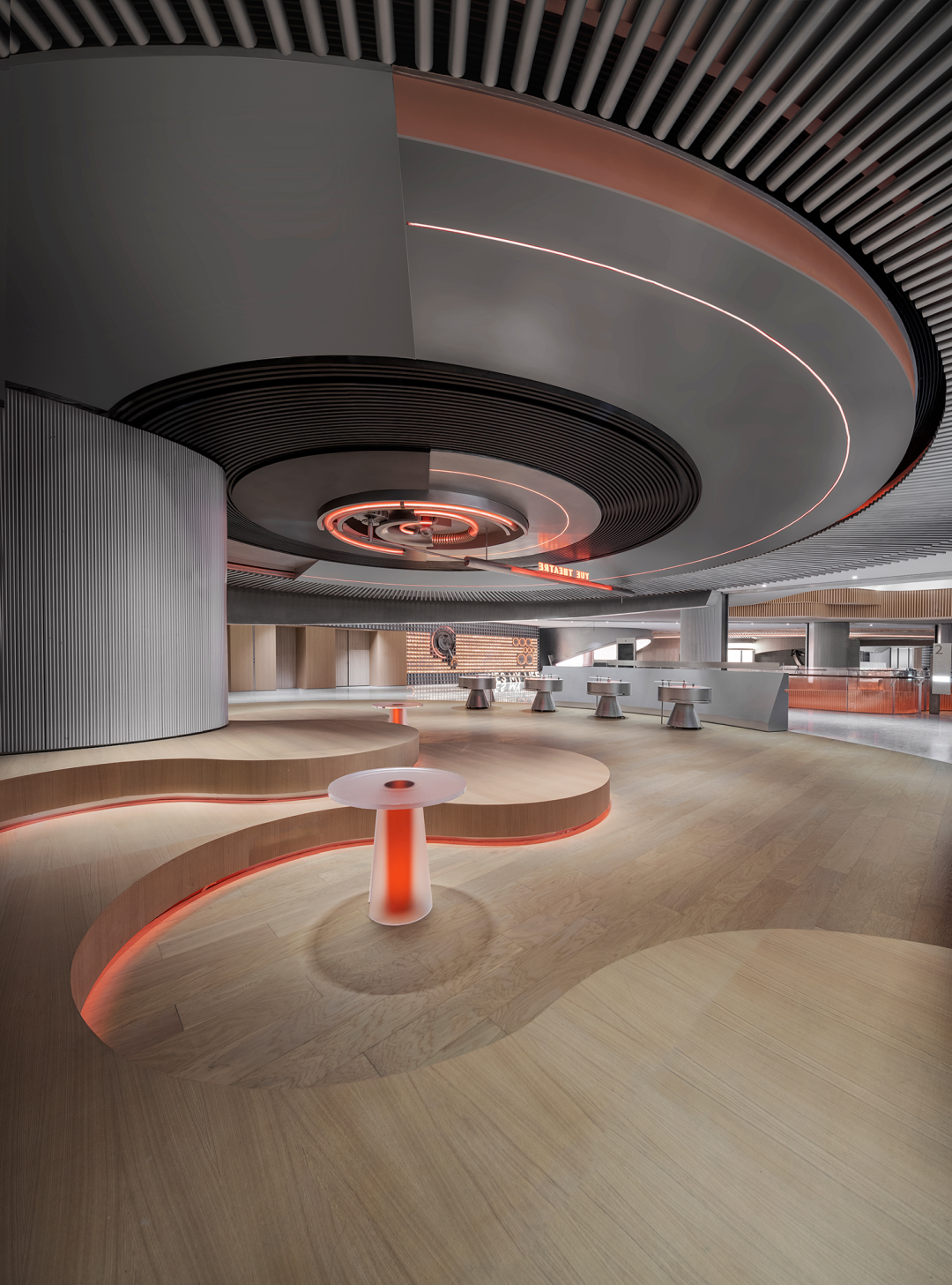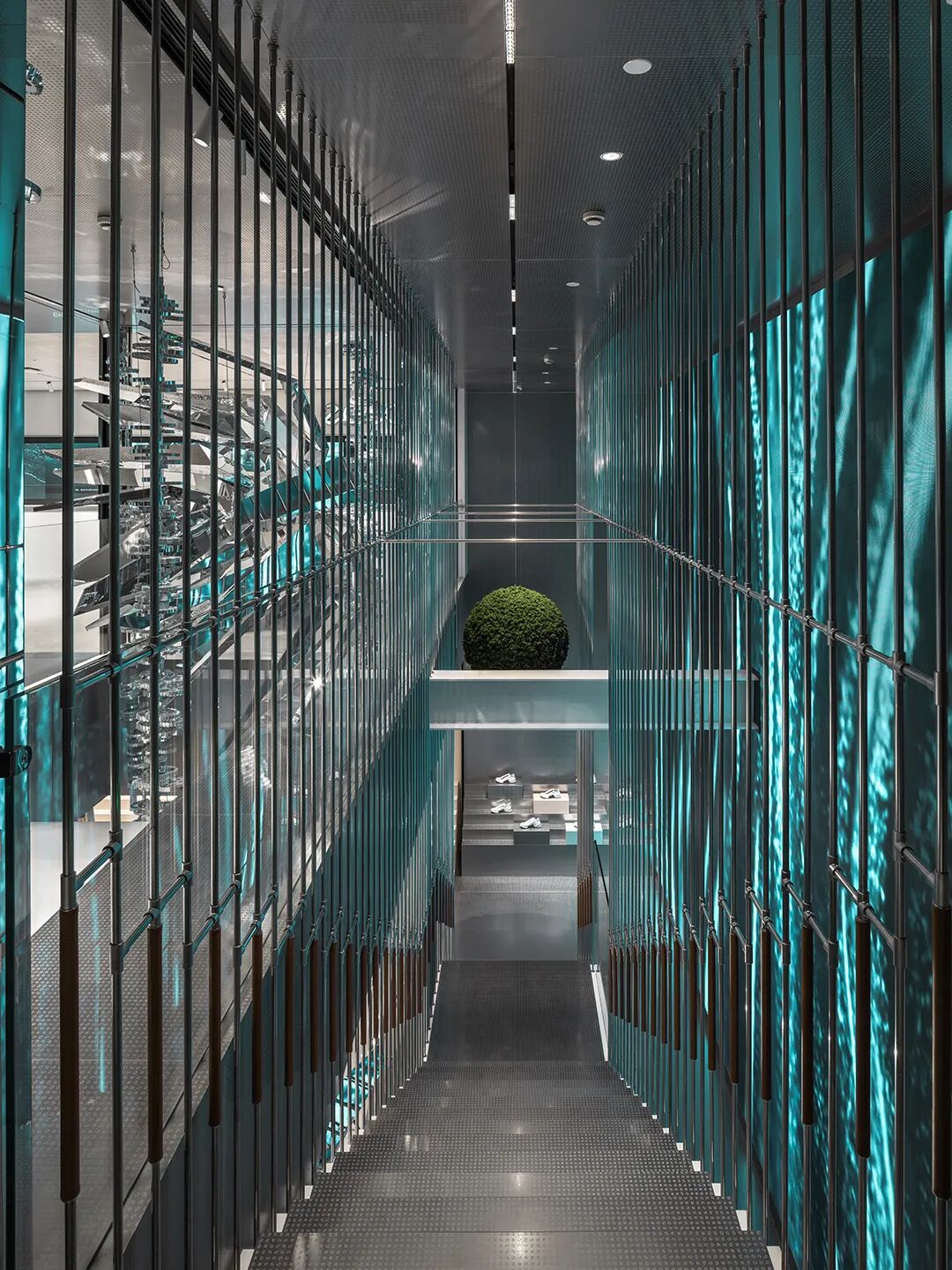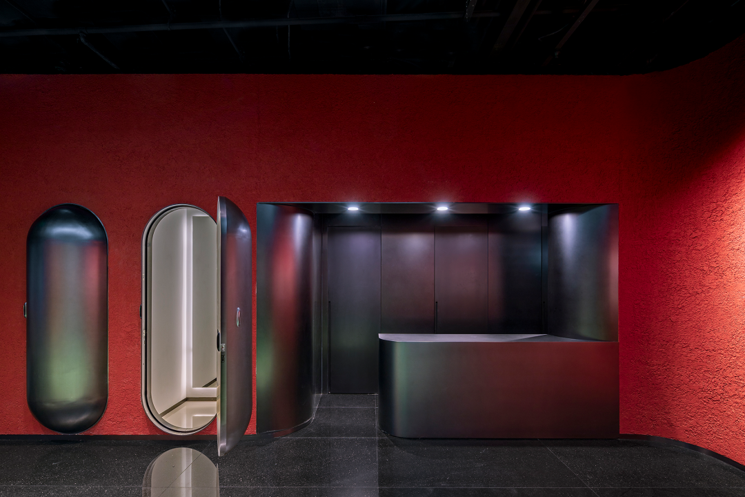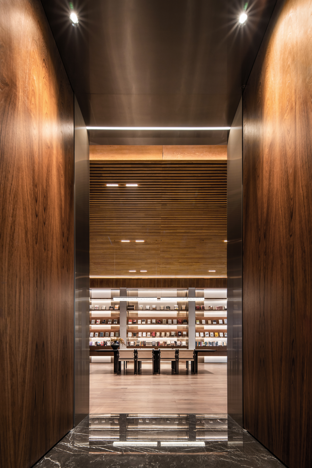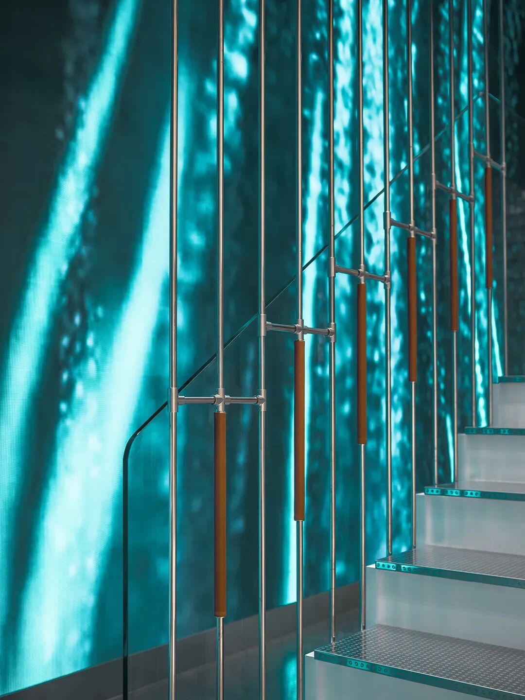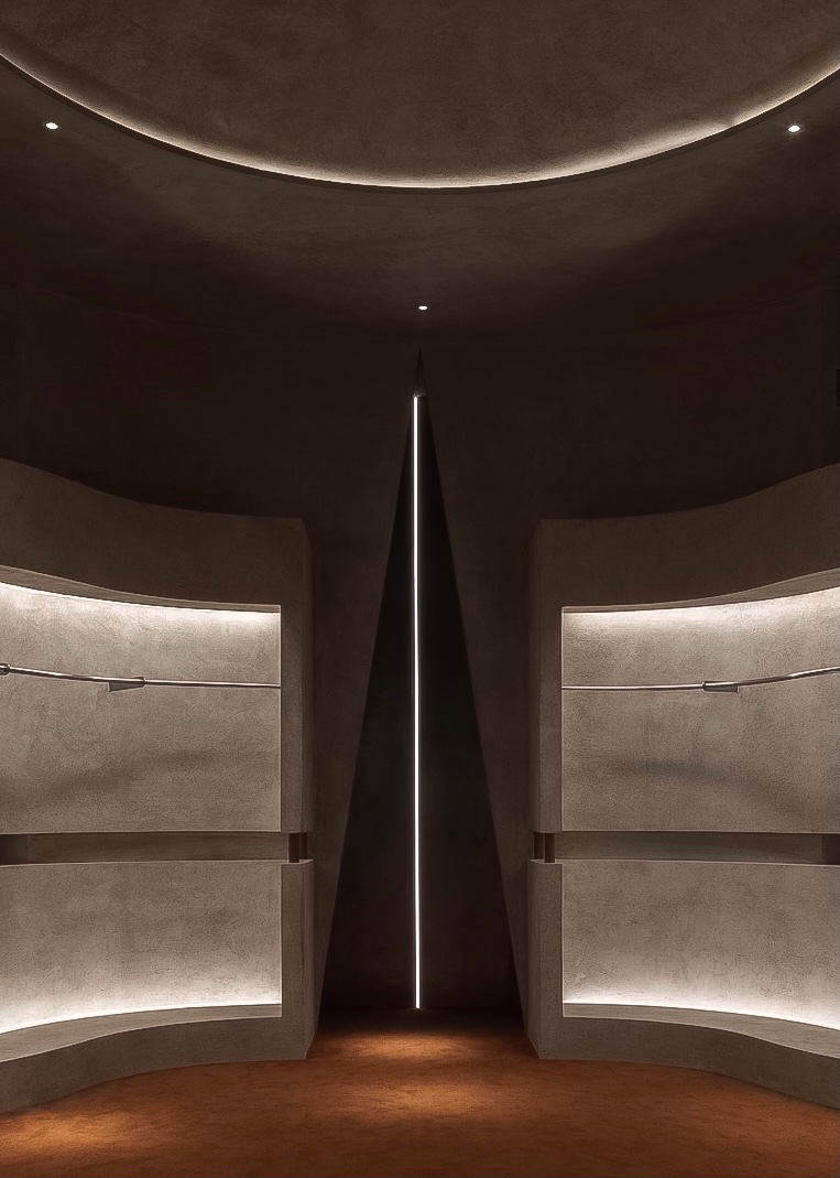 本案建筑为五栋塔楼,一层为庭院景观及连接的户外露天泳池,中间为大型的开口采光天井,巧妙地将自然光线与地面景观引入到负一层的会所空间,透过中央水景的波光反射,创造出奇妙的空间戏剧性。