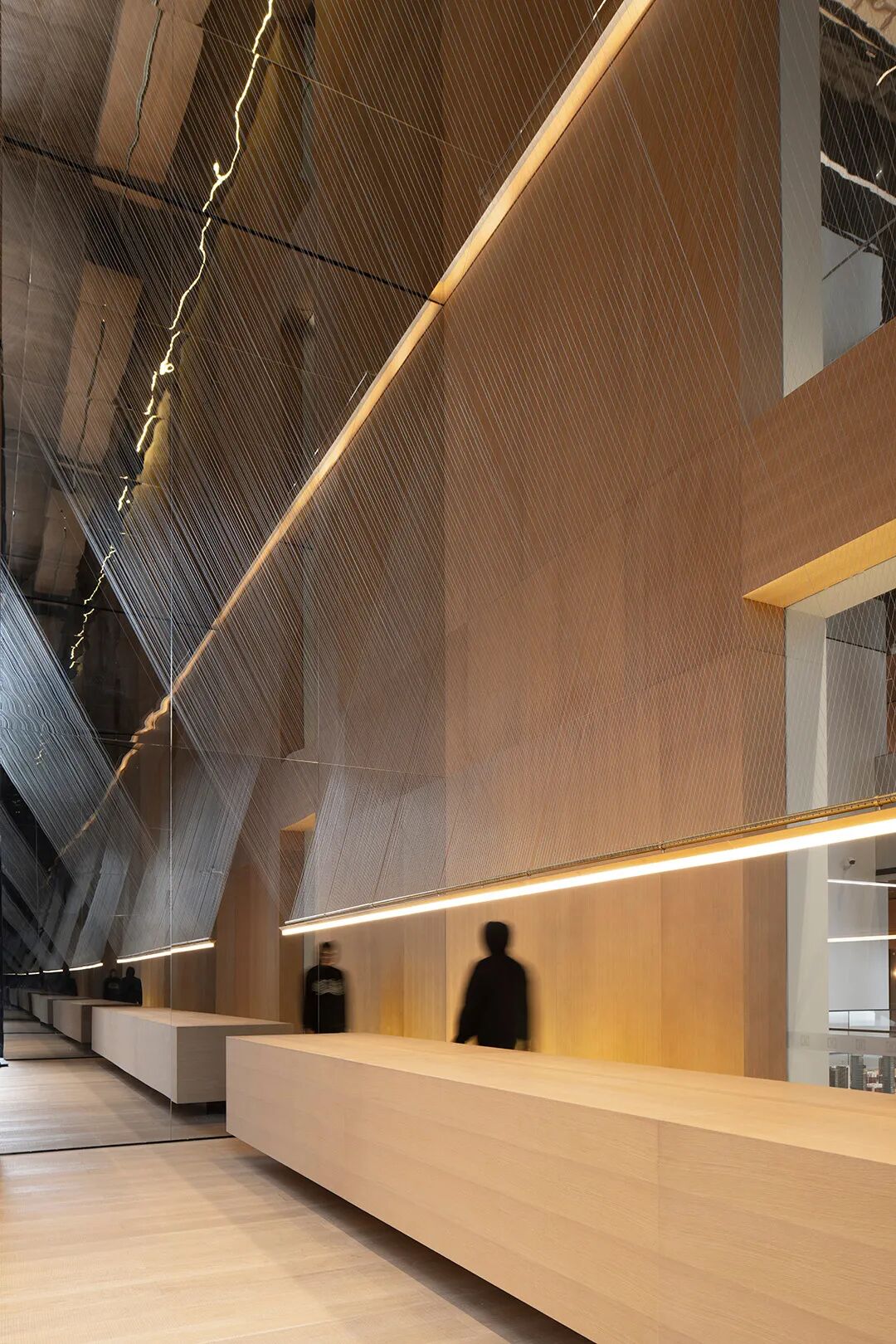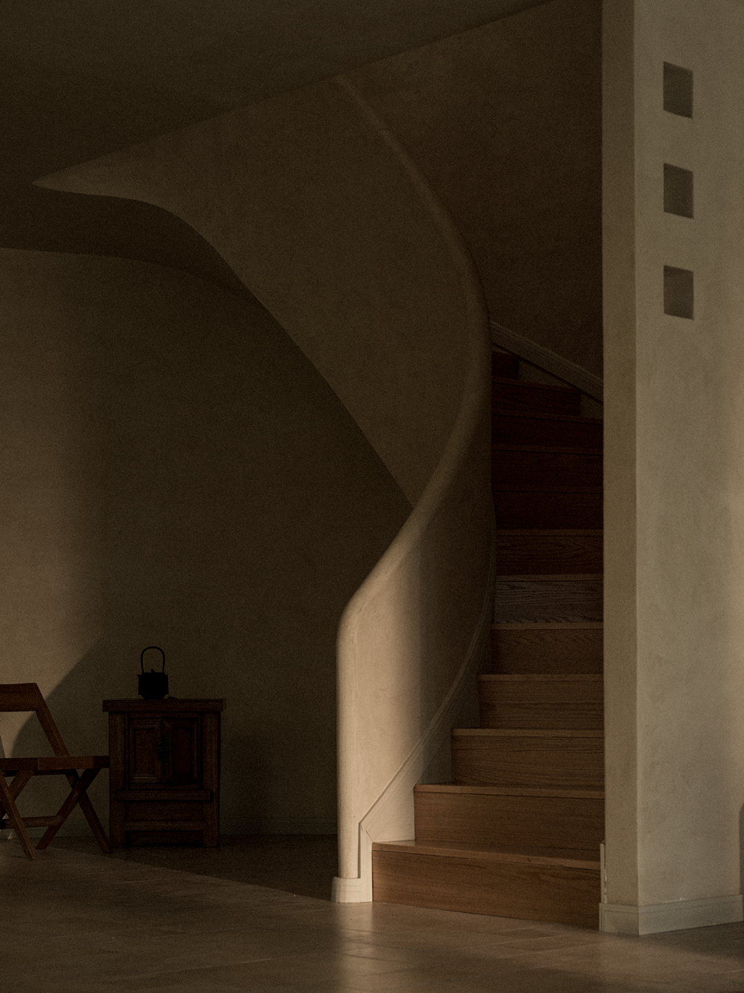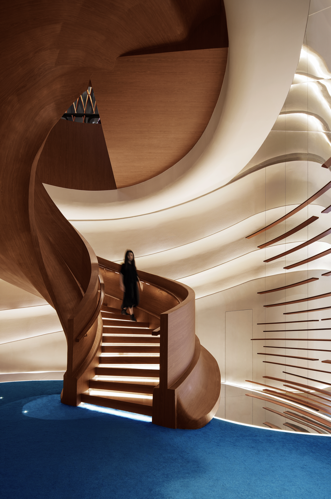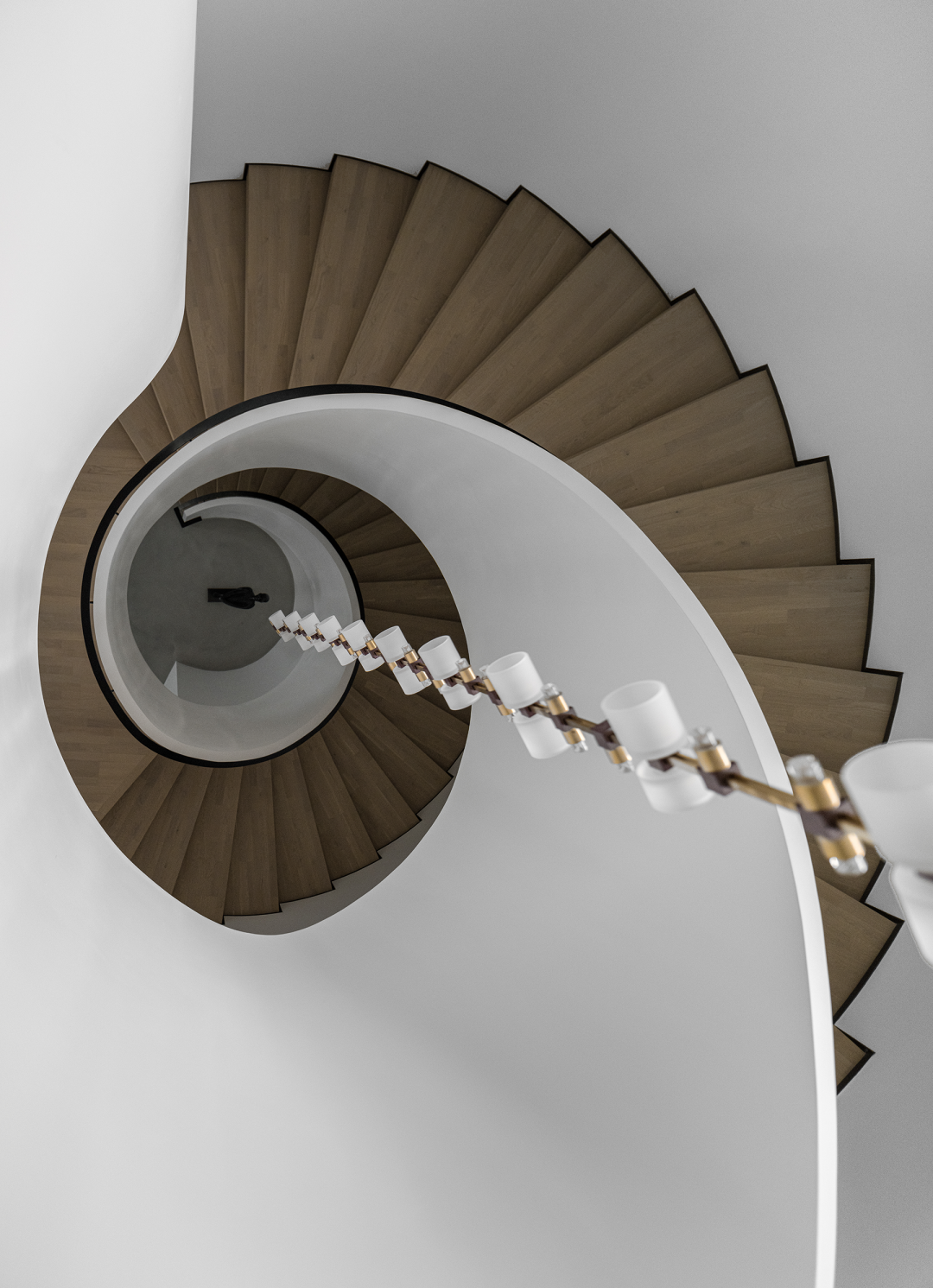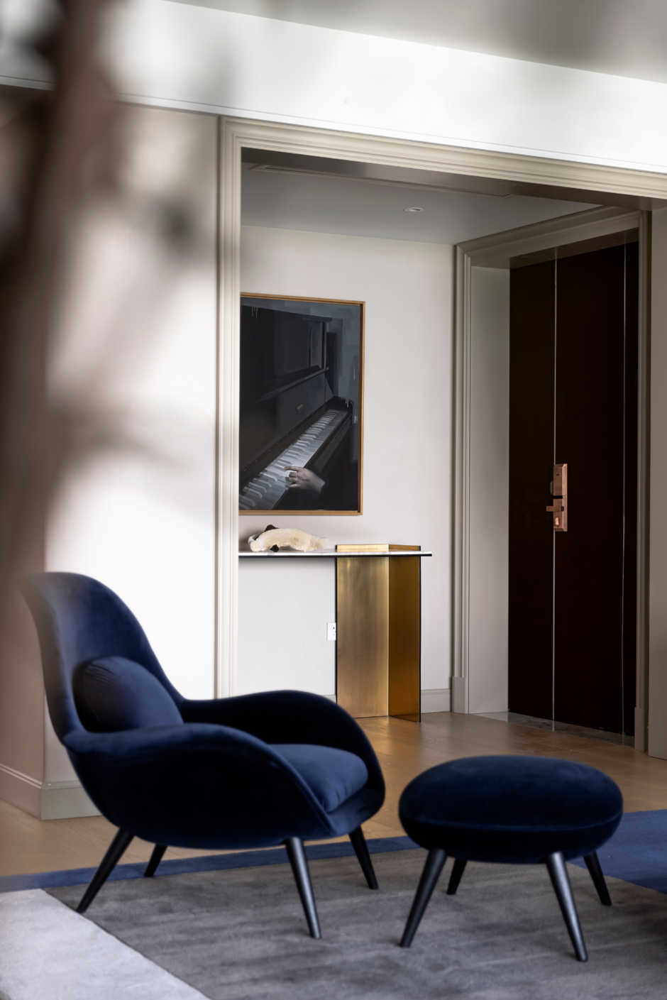 本案建筑为五栋塔楼,一层为庭院景观及连接的户外露天泳池,中间为大型的开口采光天井,巧妙地将自然光线与地面景观引入到负一层的会所空间,透过中央水景的波光反射,创造出奇妙的空间戏剧性。