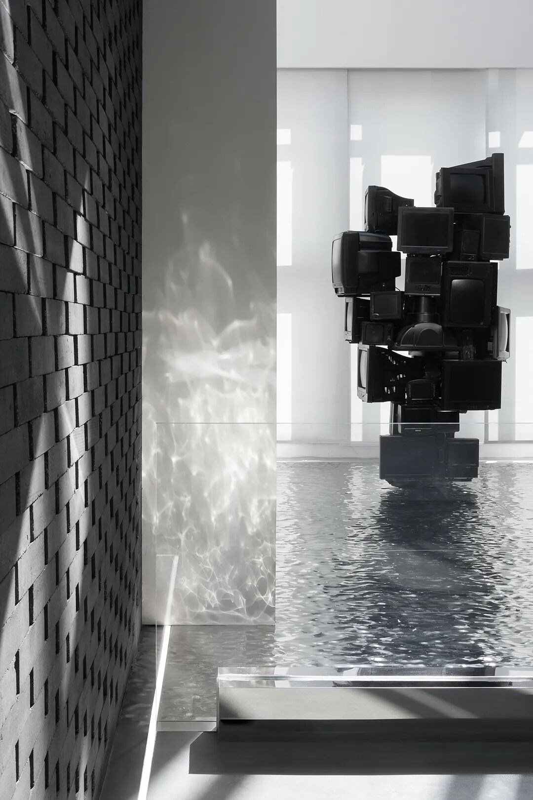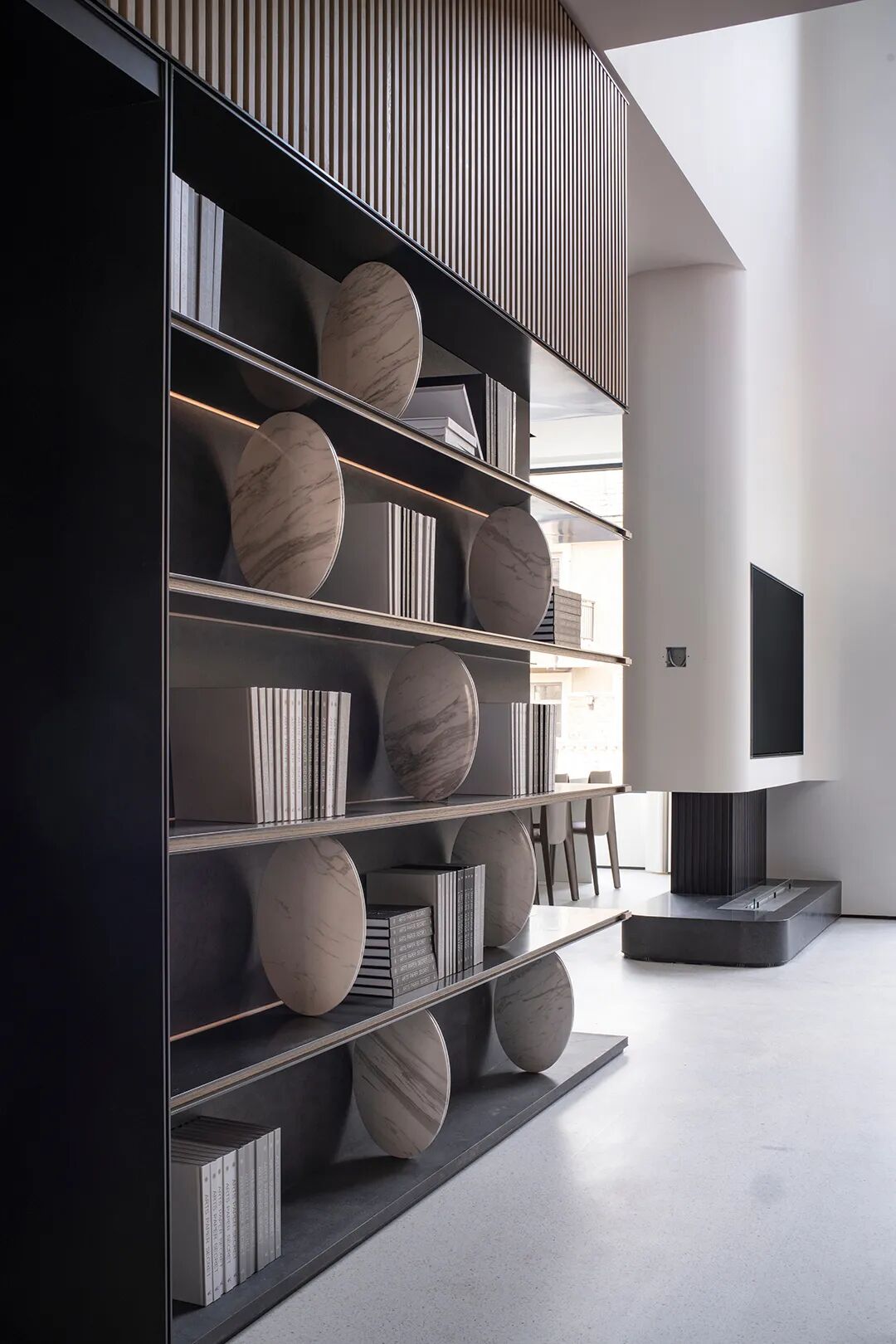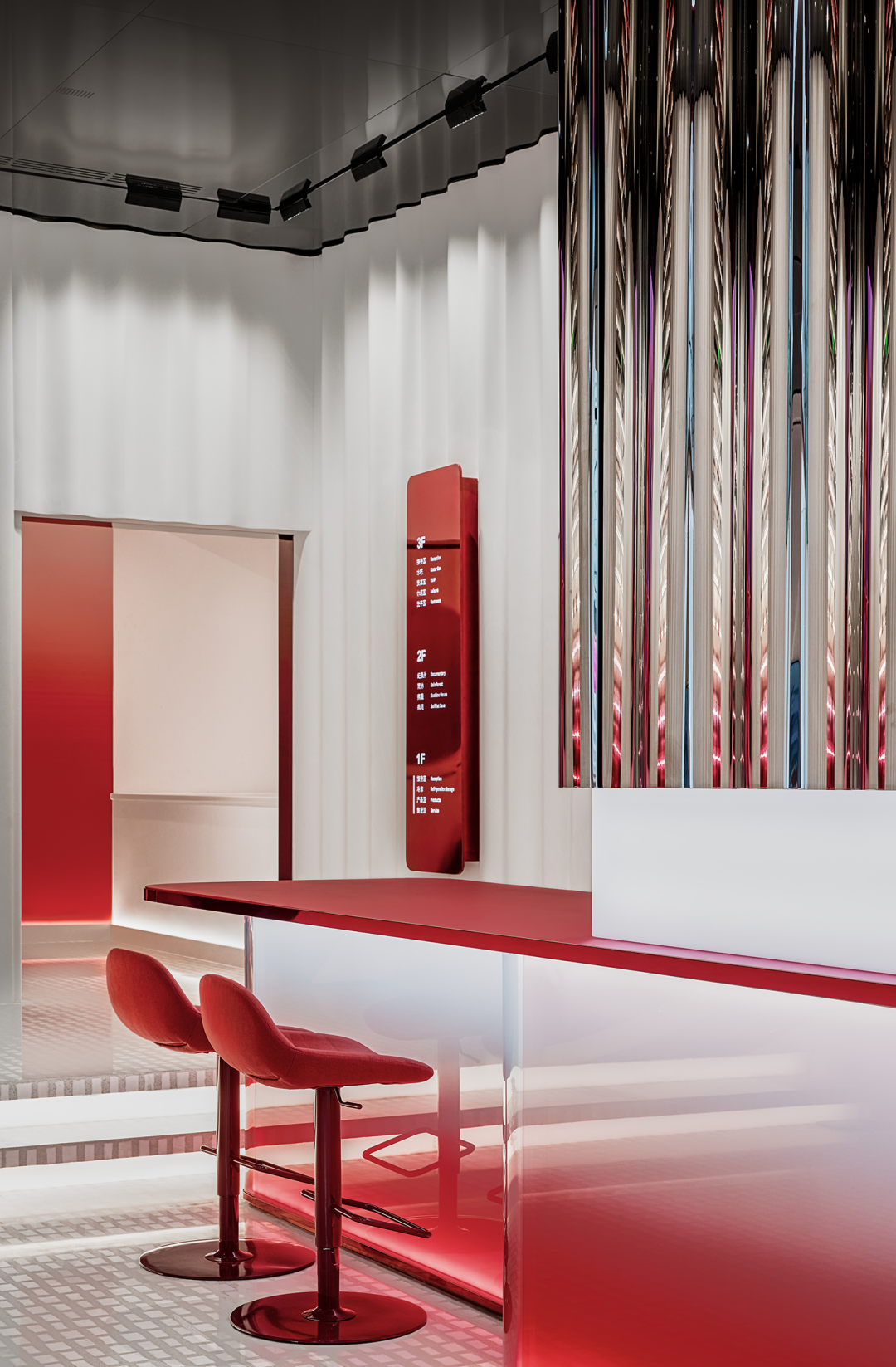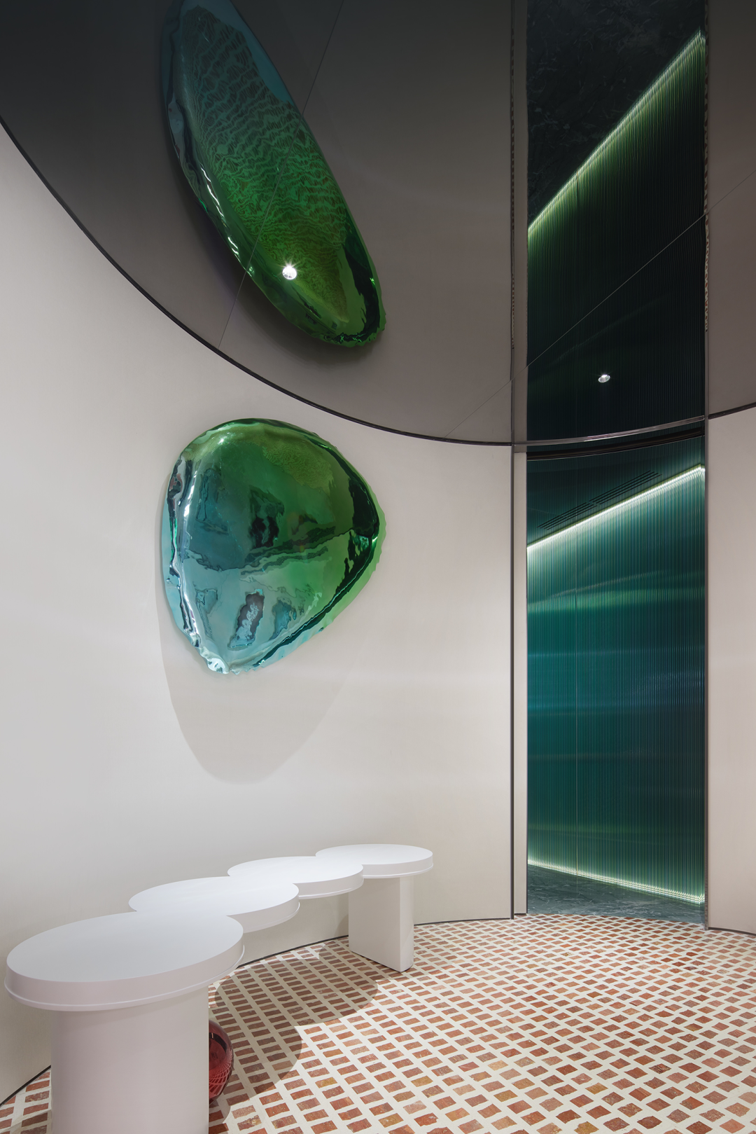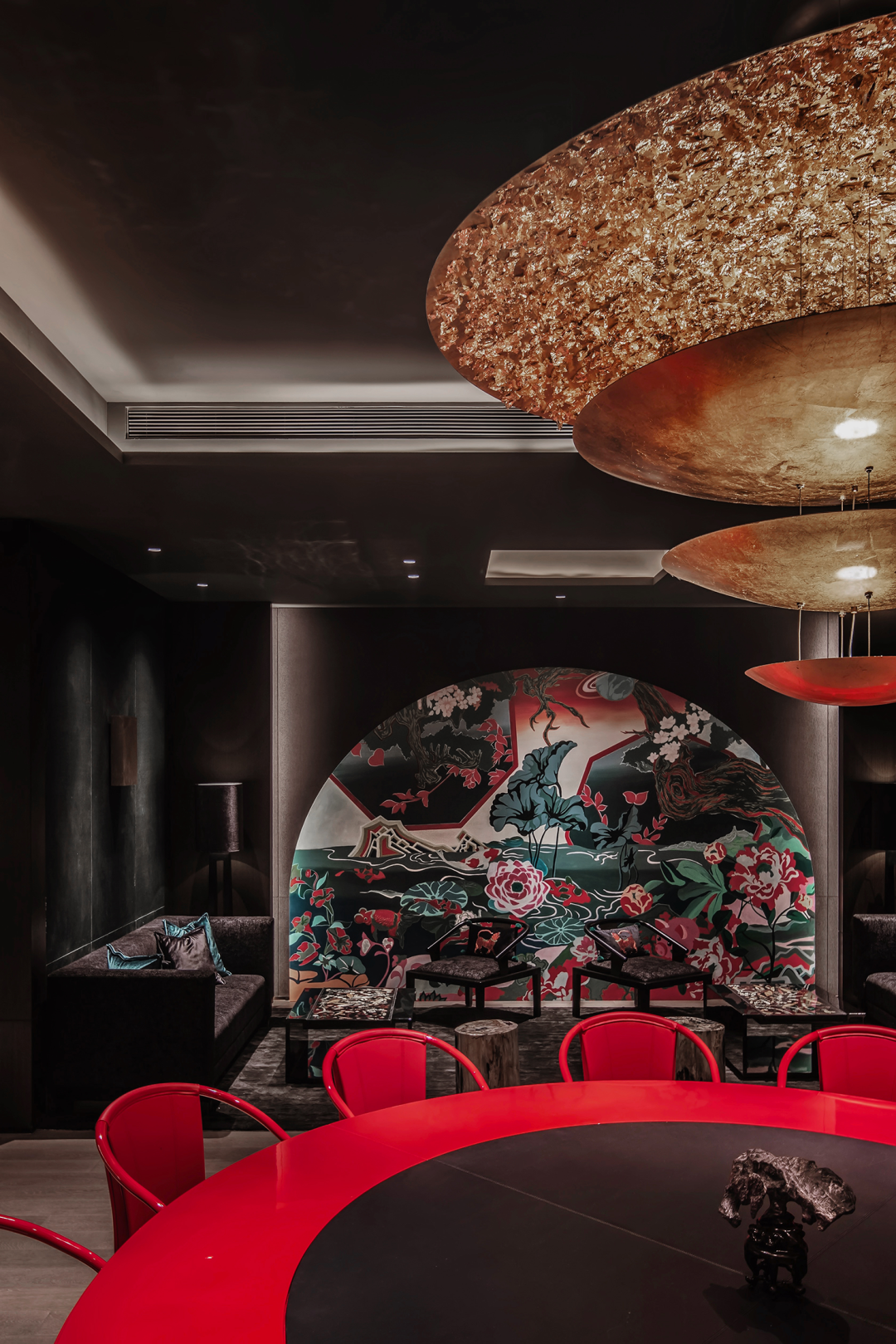 本案建筑为五栋塔楼,一层为庭院景观及连接的户外露天泳池,中间为大型的开口采光天井,巧妙地将自然光线与地面景观引入到负一层的会所空间,透过中央水景的波光反射,创造出奇妙的空间戏剧性。