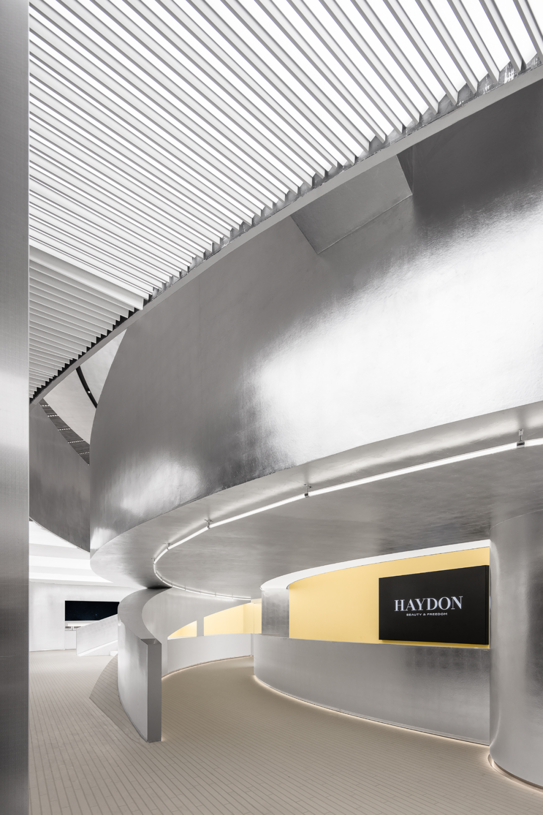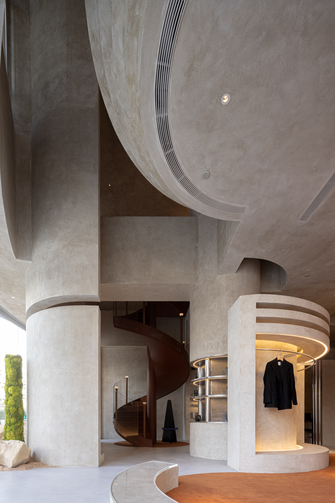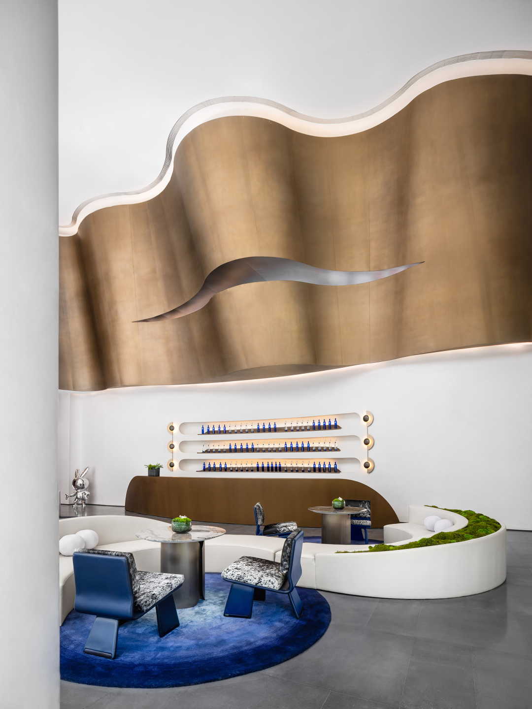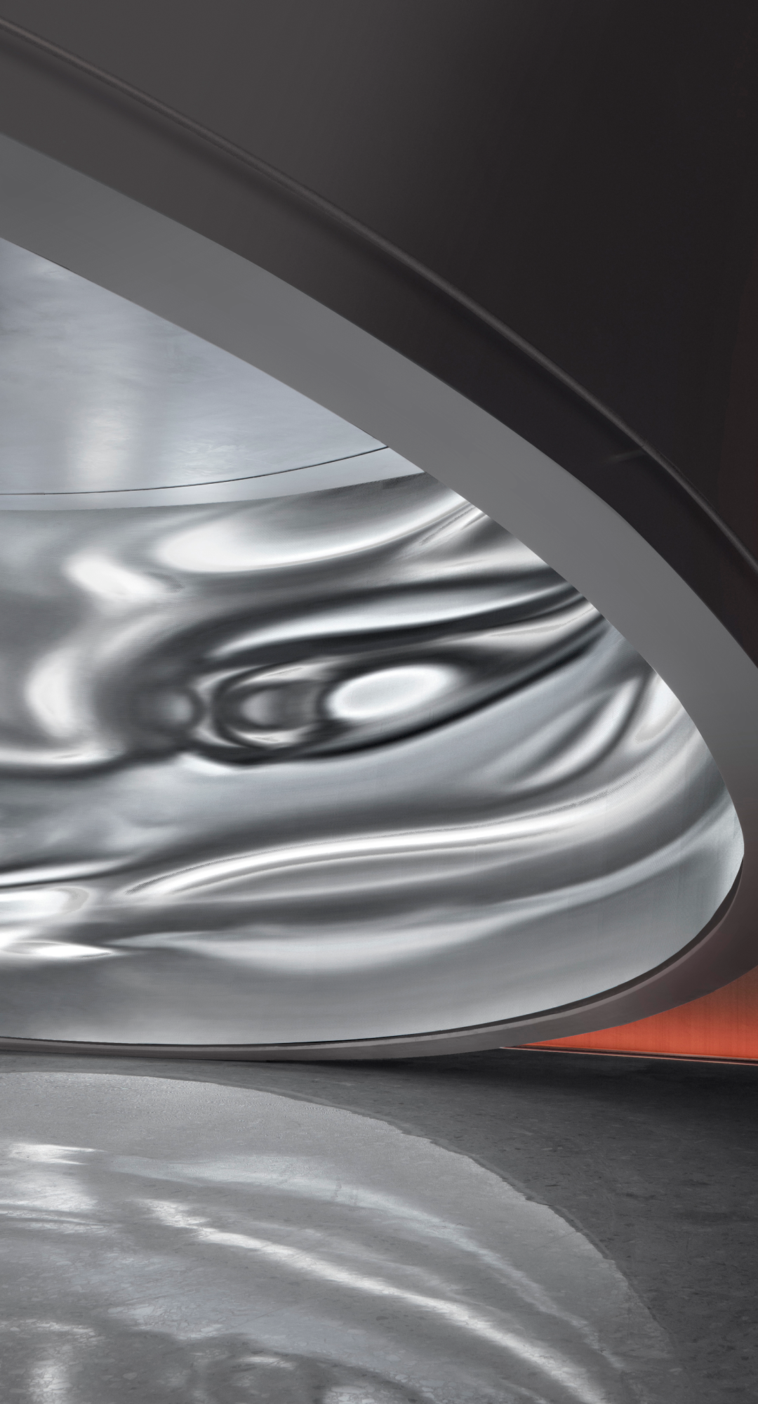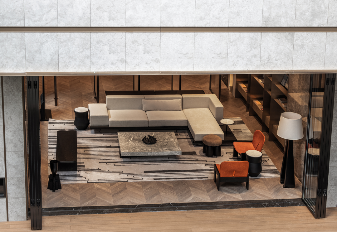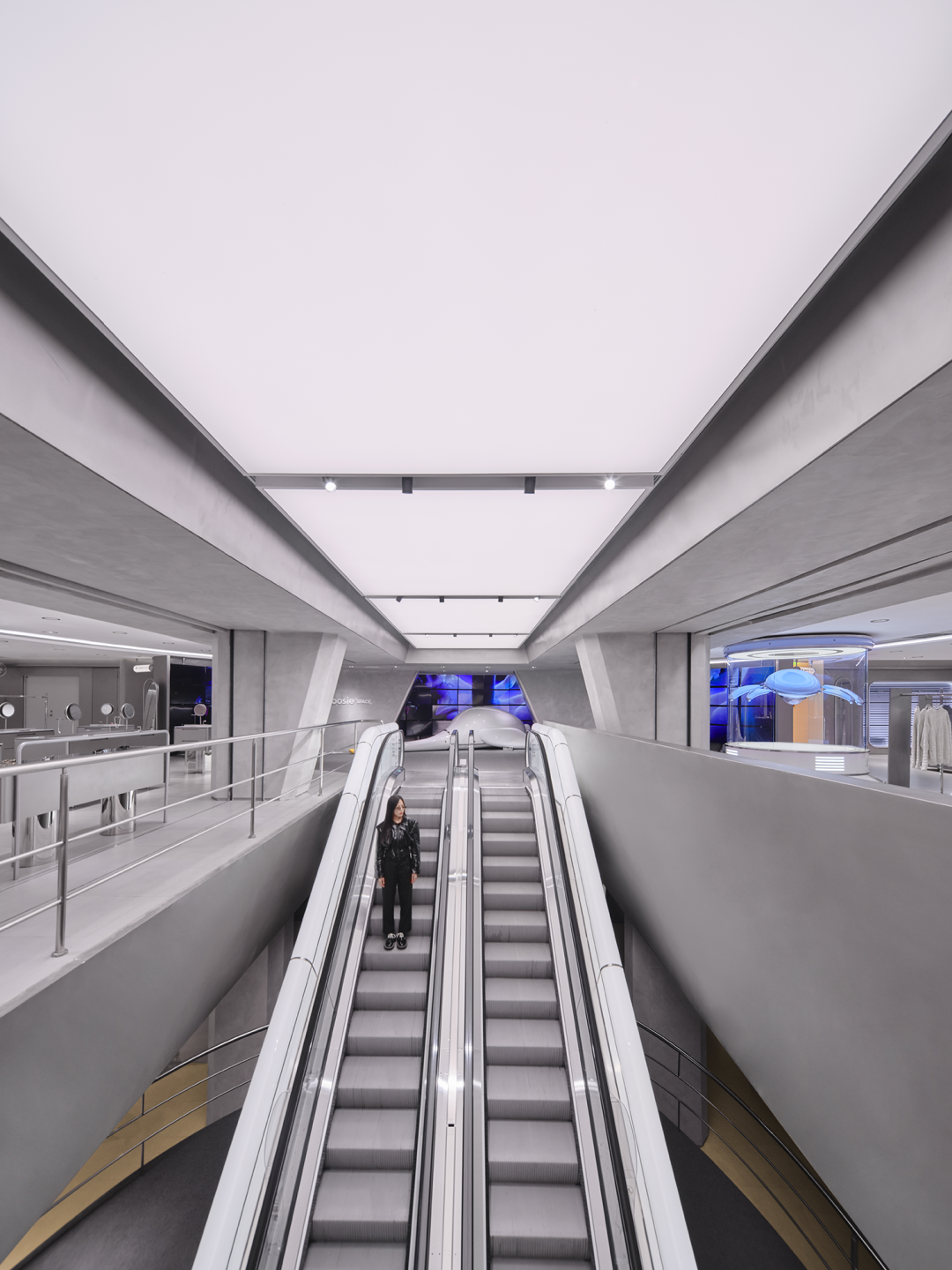 本案建筑为五栋塔楼,一层为庭院景观及连接的户外露天泳池,中间为大型的开口采光天井,巧妙地将自然光线与地面景观引入到负一层的会所空间,透过中央水景的波光反射,创造出奇妙的空间戏剧性。