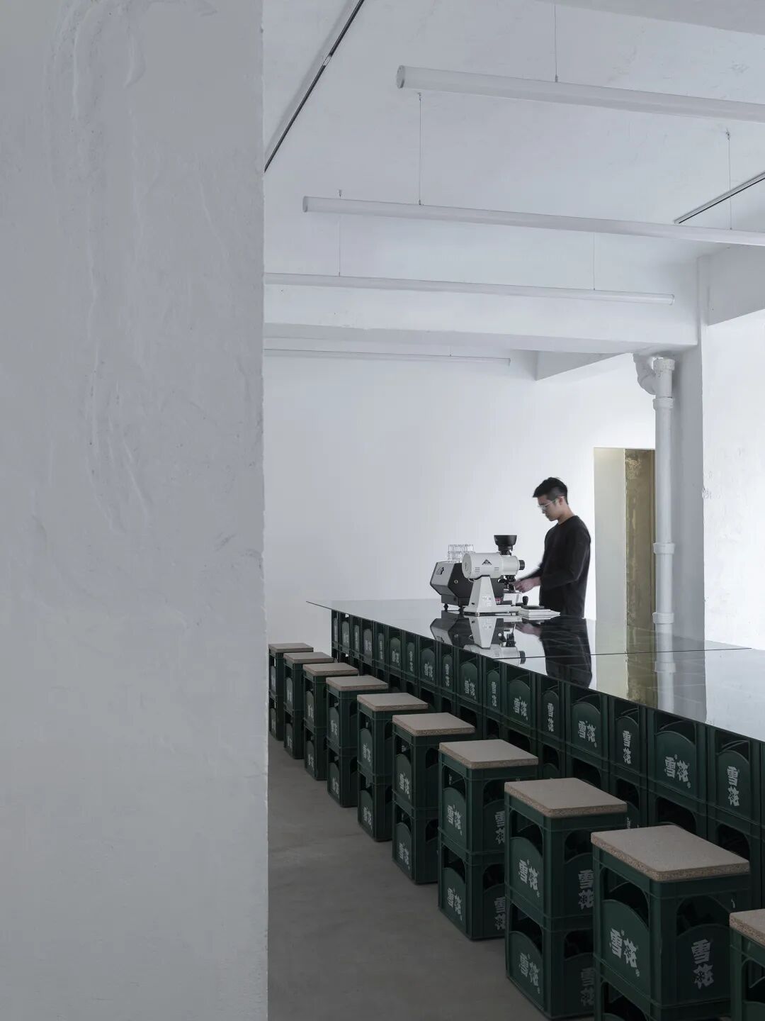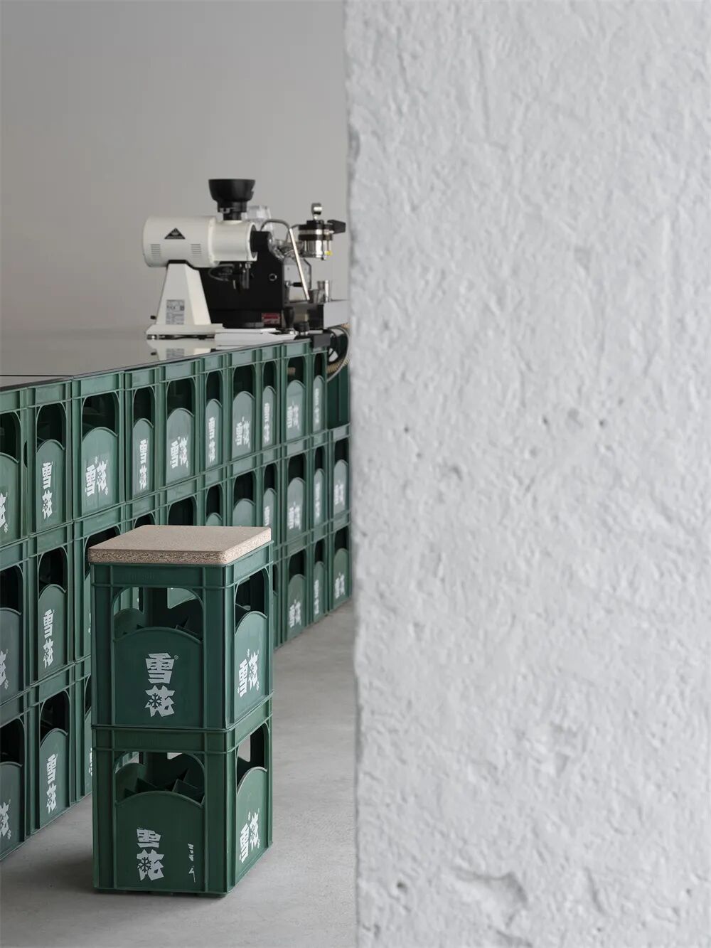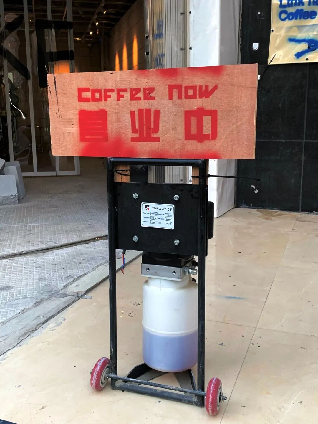 在咖啡店不断内卷的当下,现象设计以“废土美学”打造了LinkedTown Coffee 联庄咖啡在杭州的新店。在保留场地原生条件的基础上,以“低剂量”的理念对场地进行设计干预,用回收家具、废物改造完成了一系列实验性艺术装置。破旧的再生物让场地自带一种不经意的垮感。低廉的防水雨布加上街头涂鸦变成了书写体的店标;捆绑的砖块和旧电视上的迷离画面,宣告着末日破败的机能感;咖啡吧台由两个承重4000kg的举升机改造而成;从旧货市场淘来的破损椅子被套上了加固用的金属凳脚;旧音箱包裹着物流剩下的编织袋,上面还保留着快递单……实验性的解构、破坏、拼接诉说着空间场景的新叙事。