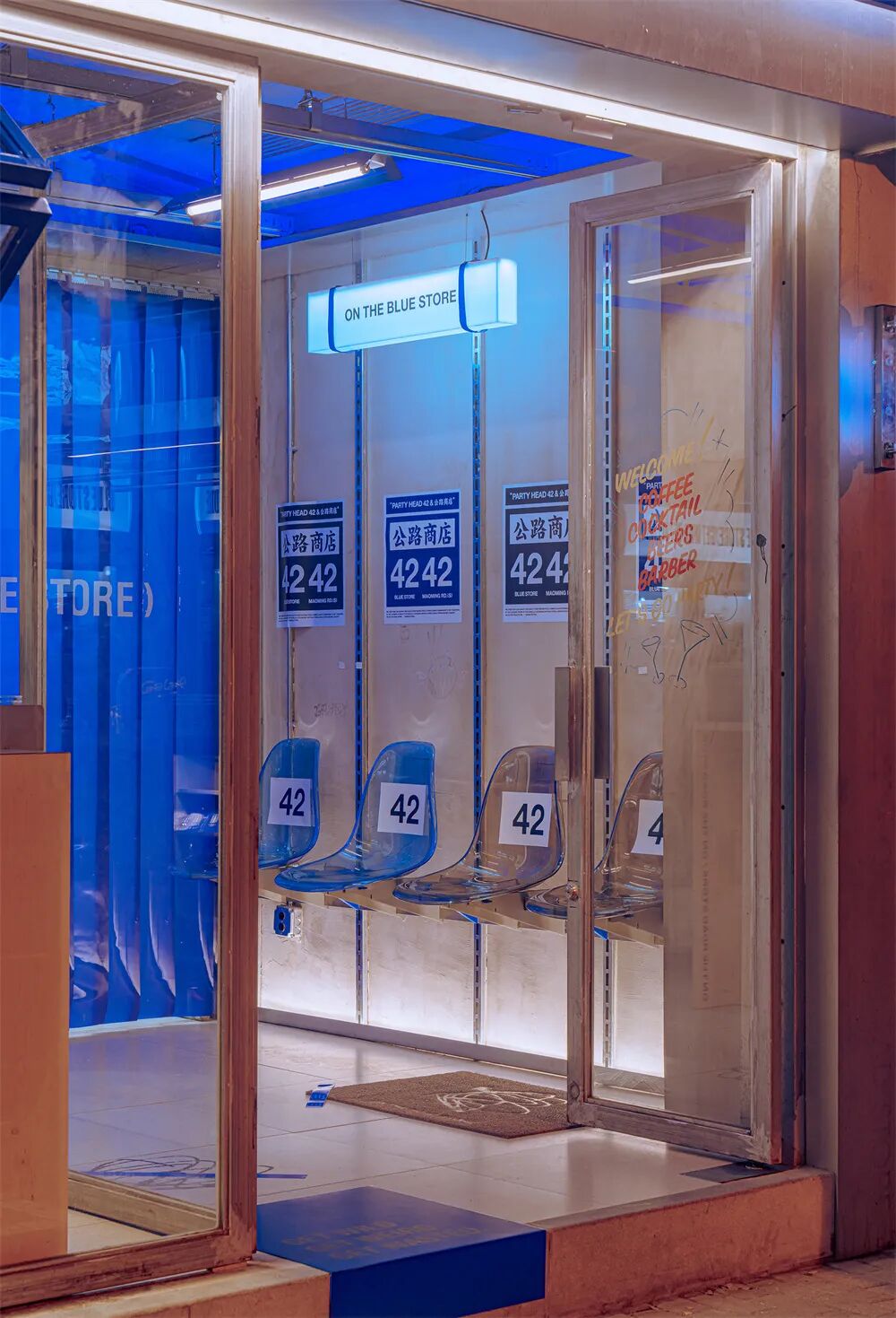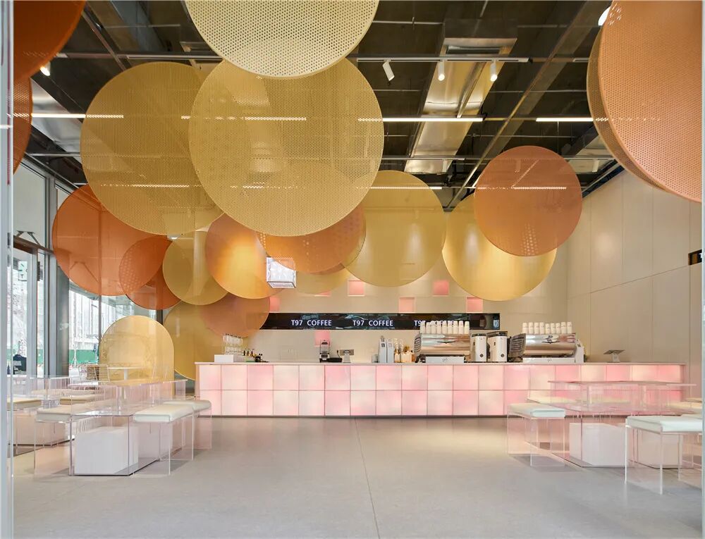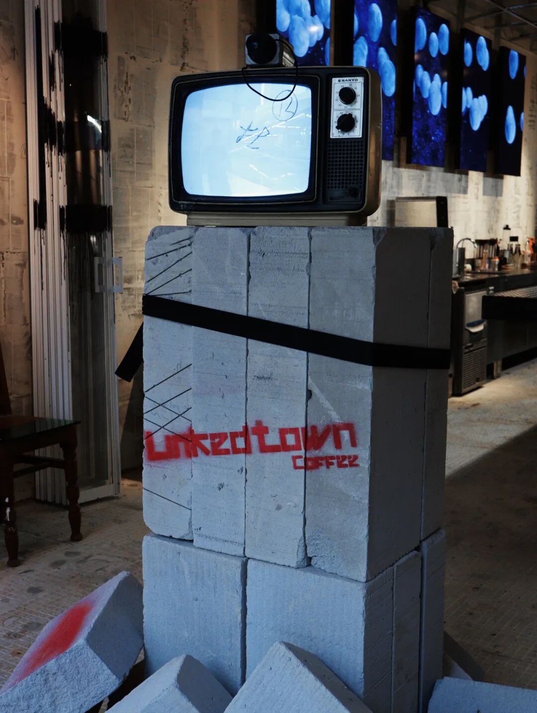 在咖啡店不断内卷的当下,现象设计以“废土美学”打造了LinkedTown Coffee 联庄咖啡在杭州的新店。在保留场地原生条件的基础上,以“低剂量”的理念对场地进行设计干预,用回收家具、废物改造完成了一系列实验性艺术装置。破旧的再生物让场地自带一种不经意的垮感。低廉的防水雨布加上街头涂鸦变成了书写体的店标;捆绑的砖块和旧电视上的迷离画面,宣告着末日破败的机能感;咖啡吧台由两个承重4000kg的举升机改造而成;从旧货市场淘来的破损椅子被套上了加固用的金属凳脚;旧音箱包裹着物流剩下的编织袋,上面还保留着快递单……实验性的解构、破坏、拼接诉说着空间场景的新叙事。