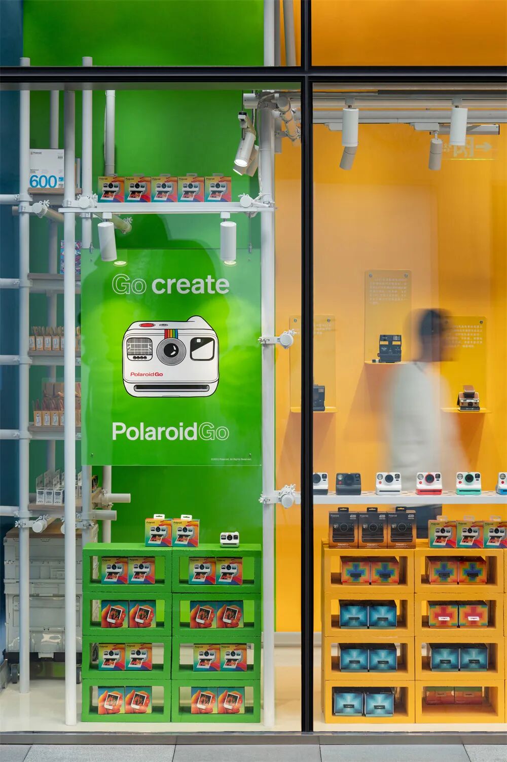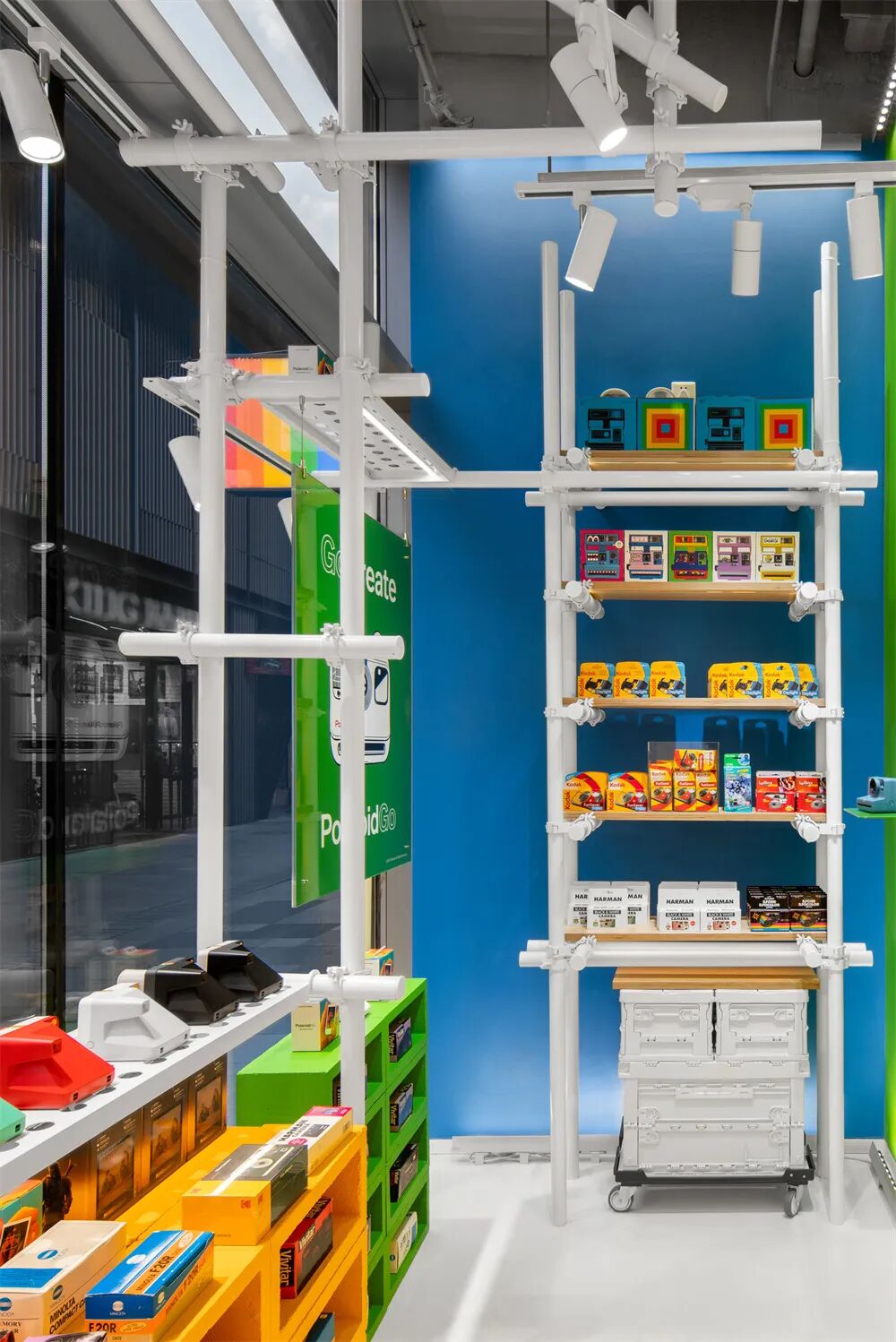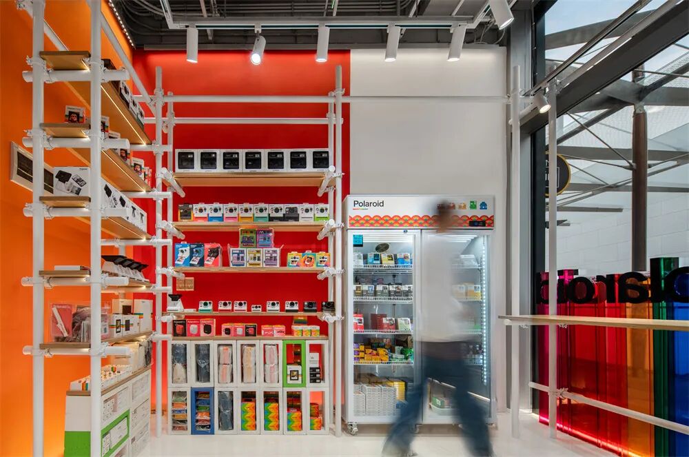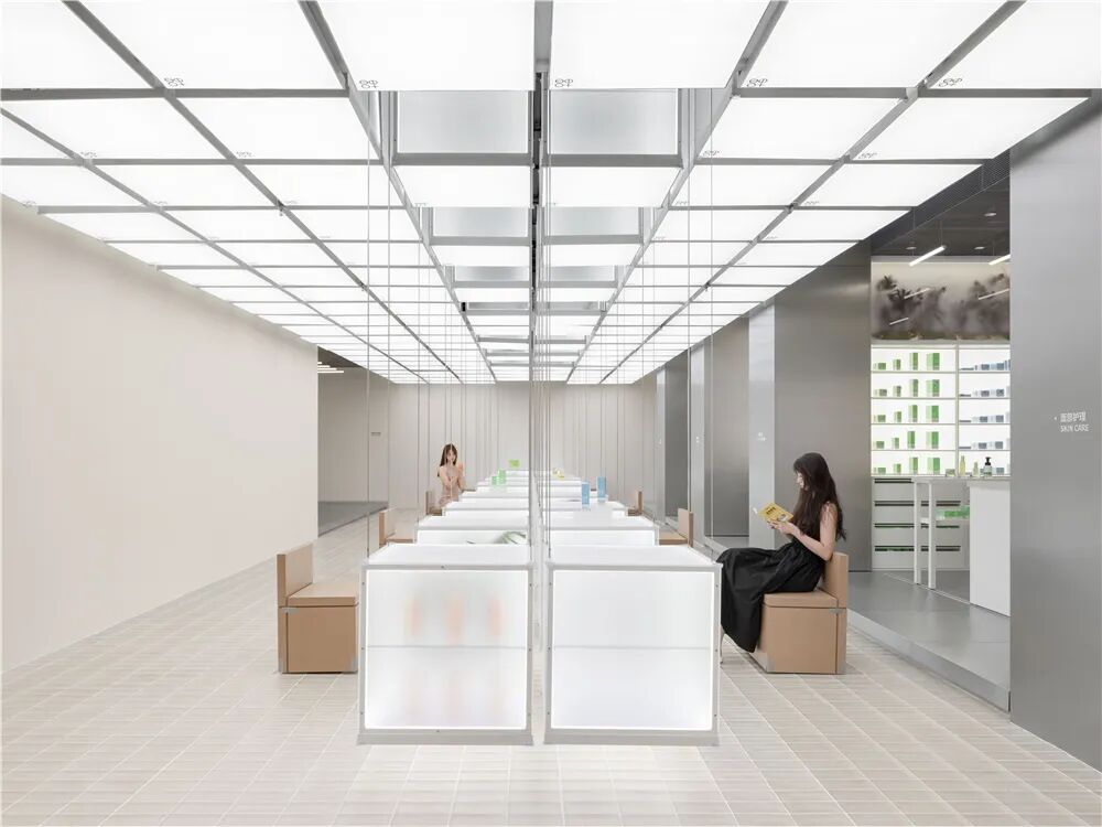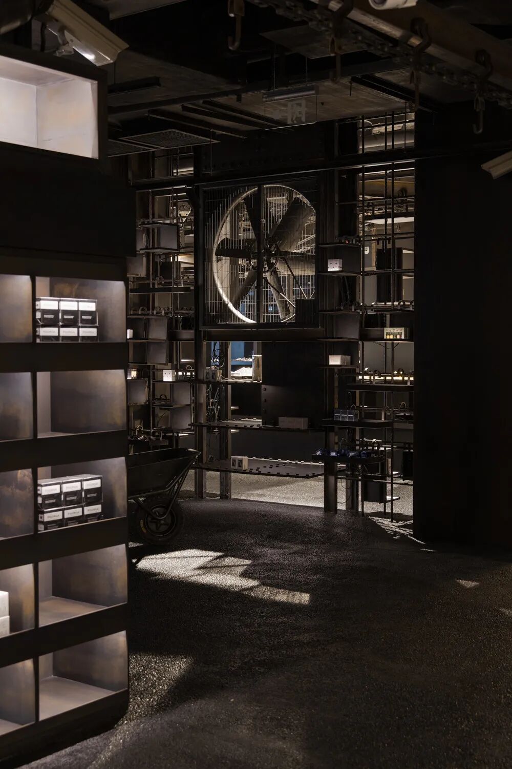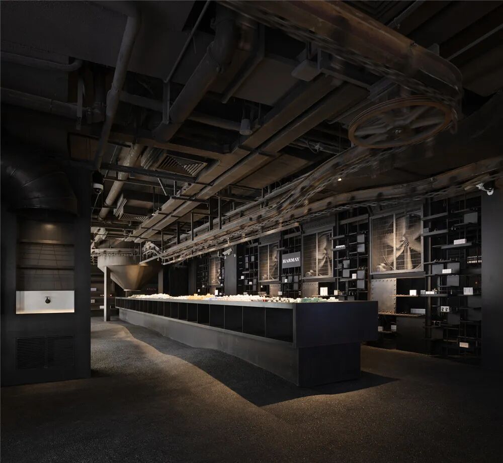 位于北京西单商圈内的HARMAY话梅新店深根于地下,像是从城市体内挖出的末日飞船一样。通过钢、铁等具有工业元素的材质来表达反乌托邦的氛围。通风口和机械部件构成了展示区,由于重力而弯曲的波浪形层板货架像仓库一样陈列着商品,巨大的工业垃圾箱中堆满着分类的产品……不平整的地板也给顾客逛店时创造了一种特别的情感体验。
