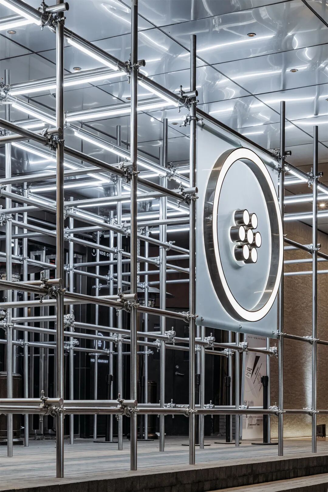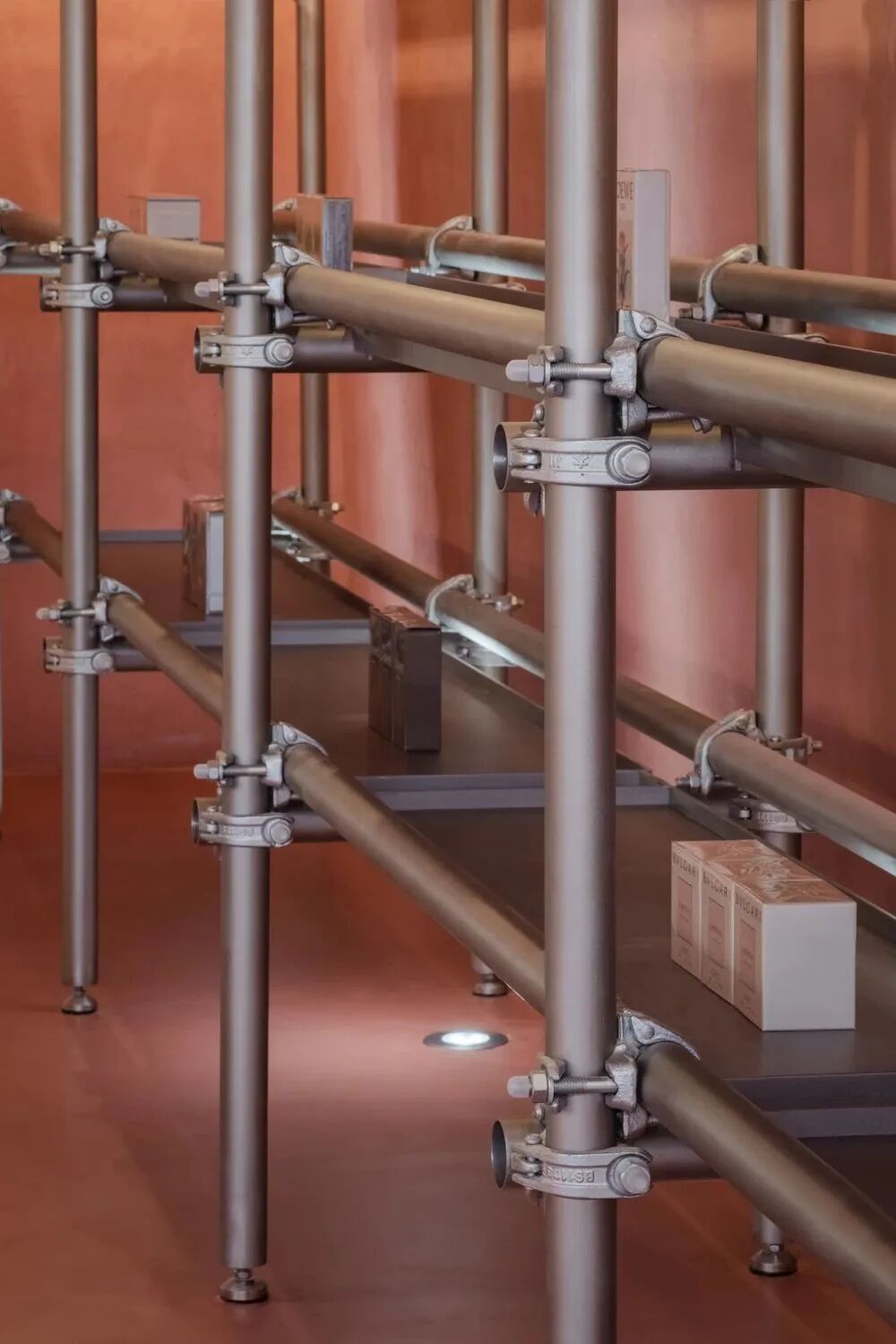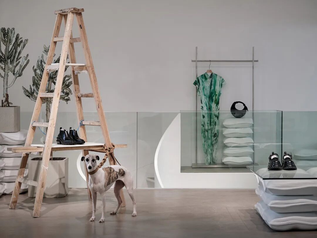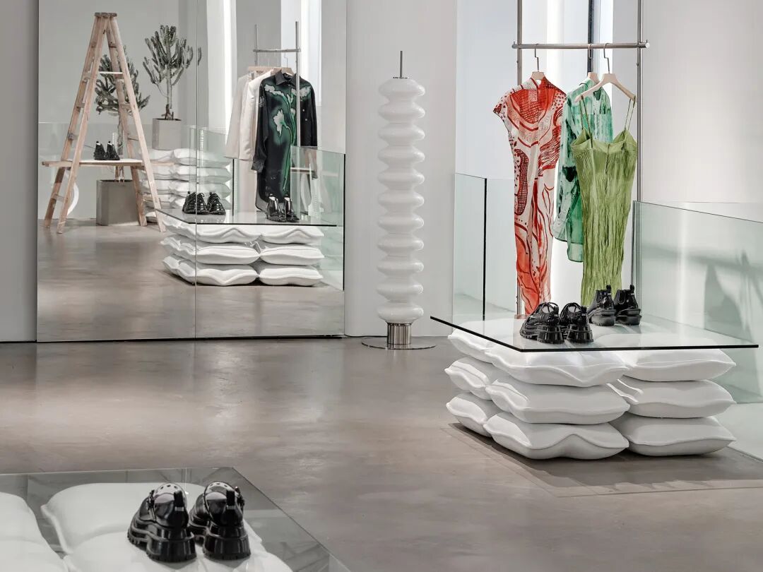 金属天然带有工业属性,生锈的外表和扭曲的形态更有一种沧桑感。金属板材敲打后重组成家具,钢管用于结构支撑或者变为挂衣钩、功能性陈列道具。脚手架可以组合成货架和装置,延续其结构功能和斑驳的美感。设计师或夸张或隐藏材料本身的不确定性,让这些工业遗址的独特表面和缺陷成为一种特色。尽量减少视觉噪音的突兀感,同时引发人们对不完美外观的探索欲。