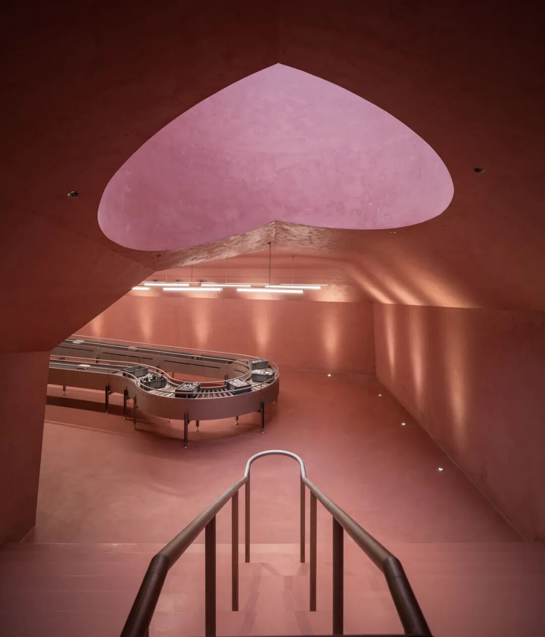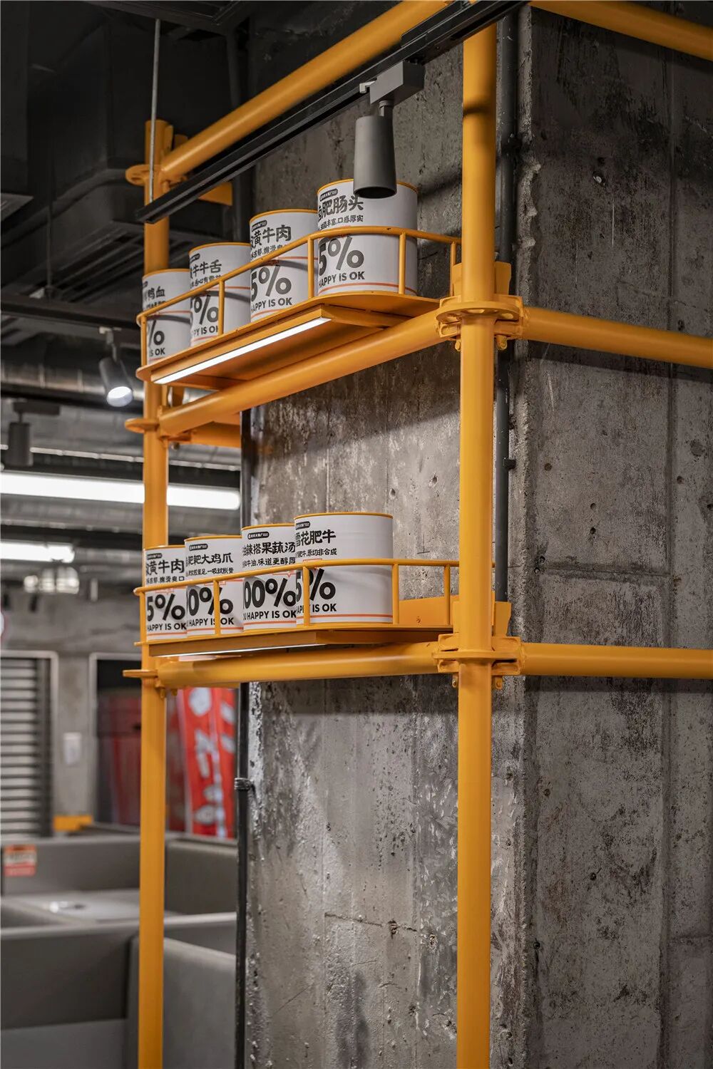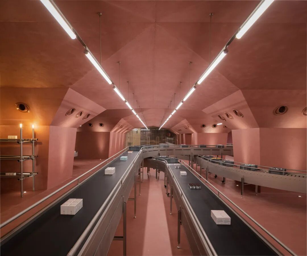 重庆HARMAY話梅是藏匿于地下的零售体验店,设计团队以重庆历史标志性的地下结构——防空洞为原型,用几何形体的切割和活力的色彩让其与环境形成鲜明对比,创造出人造隧道内的独特体验。受隐藏在防空洞中的工厂启发,空间中充满了机械感强烈的巨大传送带、发电机和工业器具,让来到空间的人们体验回连轴转,不停息的地下工厂和Hamay話梅的工业仓储文化。