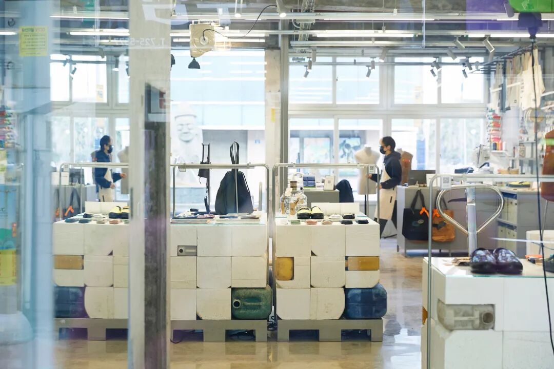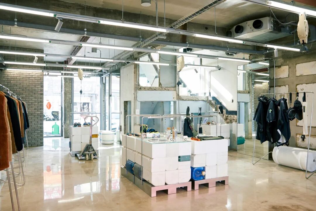 KOLON品牌概念店主要销售由回收材料制成的服装。设计师长坂常延续了“可持续发展”的宗旨,移除了建筑中现有的填充物,让建筑骨架尽可能不加修改地被使用,以适应未来的变化和发展。同时回收济州岛周边海岸的海洋废弃物,制作成固定装置用作陈列道具。