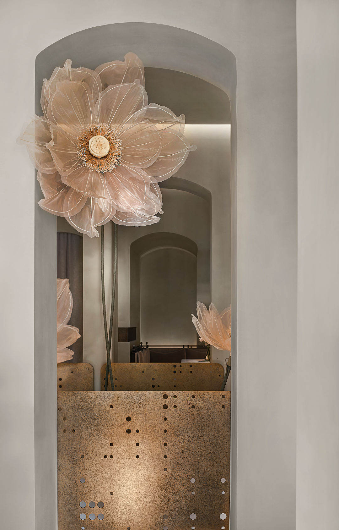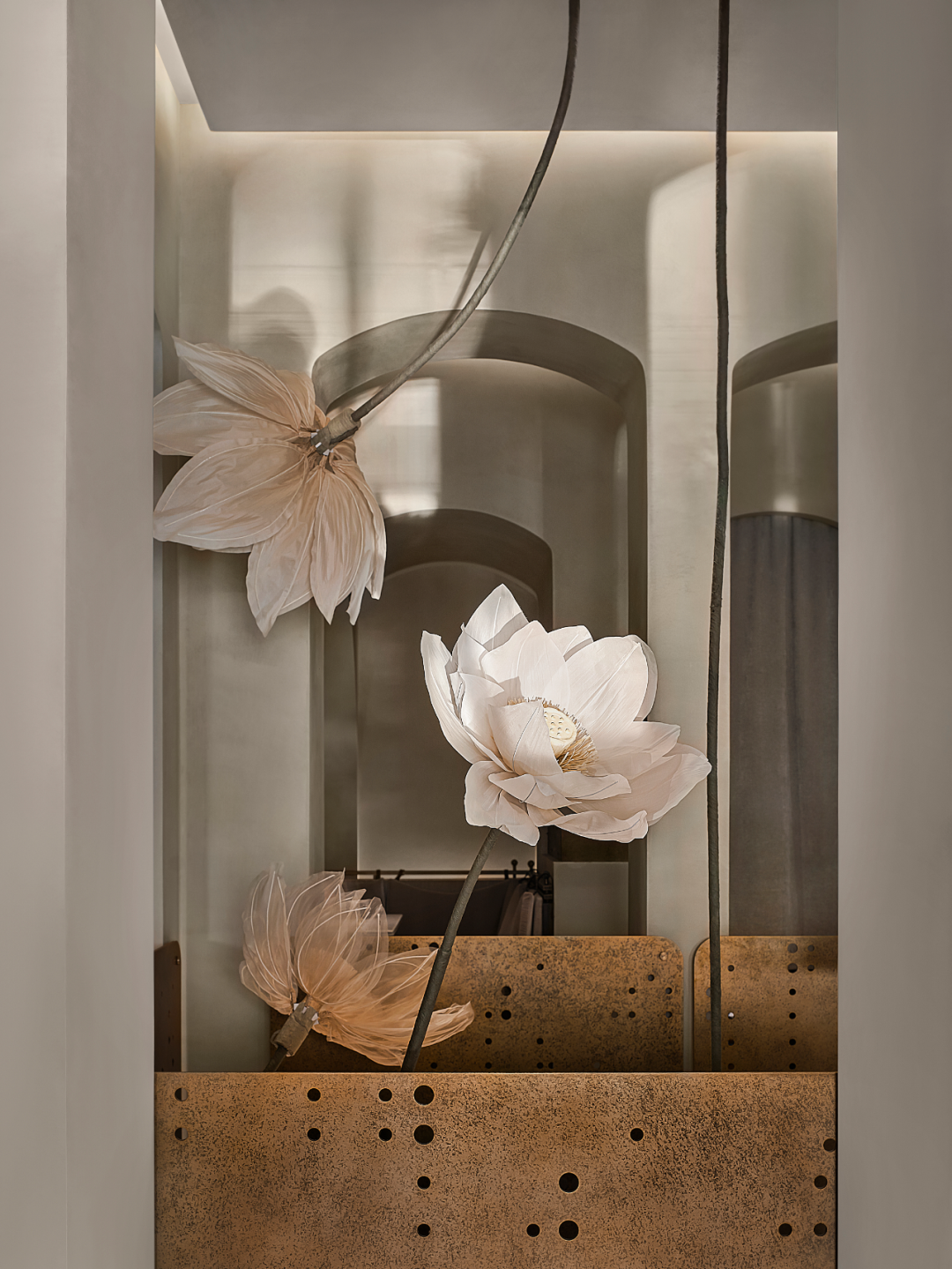 Tomacado花厨一直围绕着一城一花、一花一餐的品牌美学体系,杭州新店以“荷”为设计线索,将女性优雅揉进流动的时光。花艺装置贯通两层围合式挑空,装置内部载有机电结构,可以让荷花主体盛放、闭合、摆动,丝绸质地柔韧轻盈,把花的美丽最大程度的展现出来。
