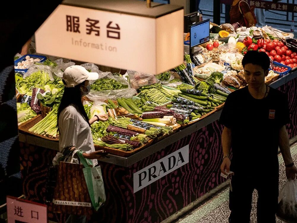 9月27日-10月10日,Prada与上海乌中市集共同开展了一场为期两周的合作活动。活动期间,乌中市集沿街外立面和内部果蔬货柜装饰上Prada标志性的Jacquard印花图案,每个摊位每日限量供应写有FEELS LIKE PRADA标语的印花包装袋。
