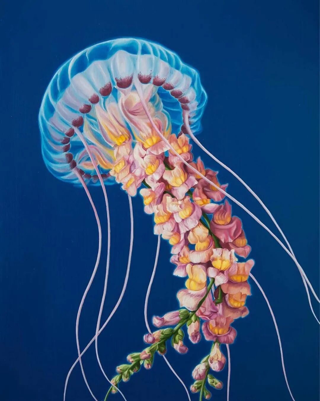 刚才说到,花能够带给人美好的感觉,在乔恩·金的超现实主义题材的油画作品中,就经常有花的身影,接下来小绛要介绍给大家的这一组作品,就来自这位艺术家之手,他将动物与植物相结合,共生出了全新的生物,这些华丽的超现实油画,展现了地球生命的无限潜力。