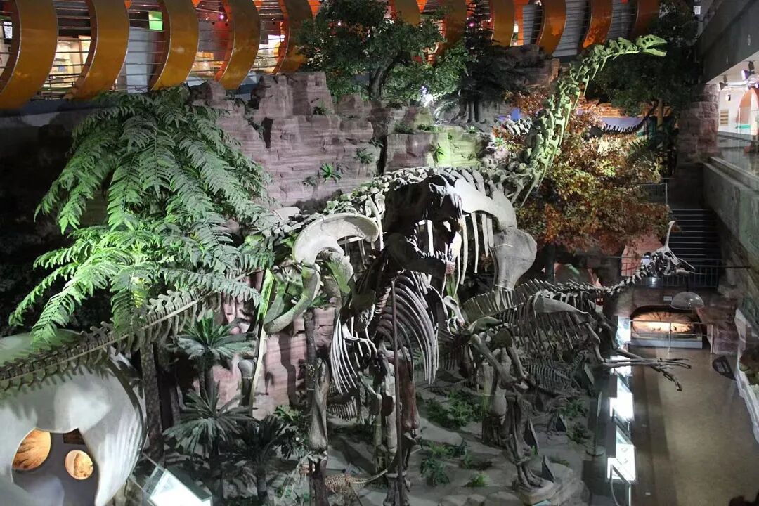 河南地质博物馆(如今改名叫河南自然博物馆)复原了巨型汝阳龙的骨架,复原后,恐龙体长38.1米,体宽3.3米,脖子长17米,简直可以说是“一栋放倒的十层楼”。