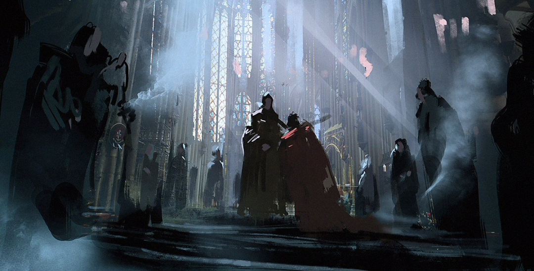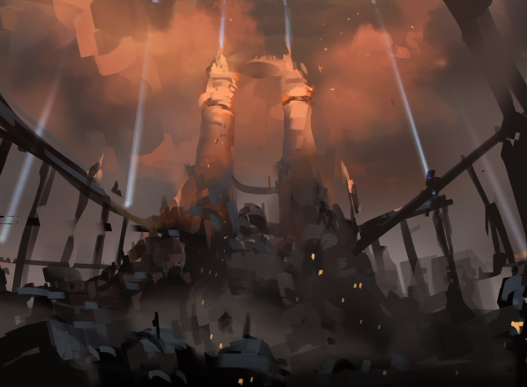 他常会在个人平台放出作品草图与成图的对比,但实际上草图的完成度一点也不低,基础结构与光源基本位置已经确定,画面视觉平衡也表现得差不多,可以称得上是完整作品。