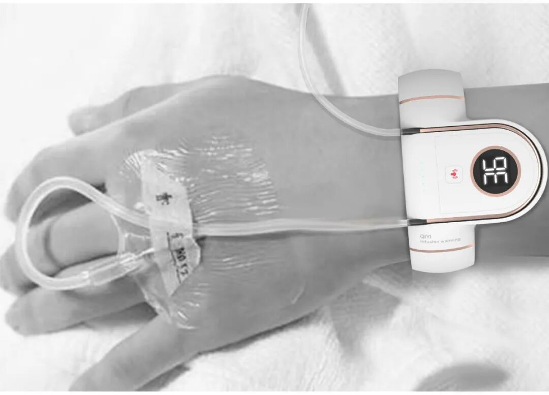 设计说明 | 产品采用可穿戴式设计,使用时将其佩戴在手腕处,再将输液管按压嵌入U形凹槽内,凹槽内,内嵌环形的加热铜管,输液管嵌入后与加热管接触达到加热液体的效果,U形的加热管增加了加热面积,使终端输出的液体温度更加稳定,同时内嵌式设计,对输液管起到了有效的固定效果,患者在移动的过程中能够防止意外拉扯而导致脱针的情况。