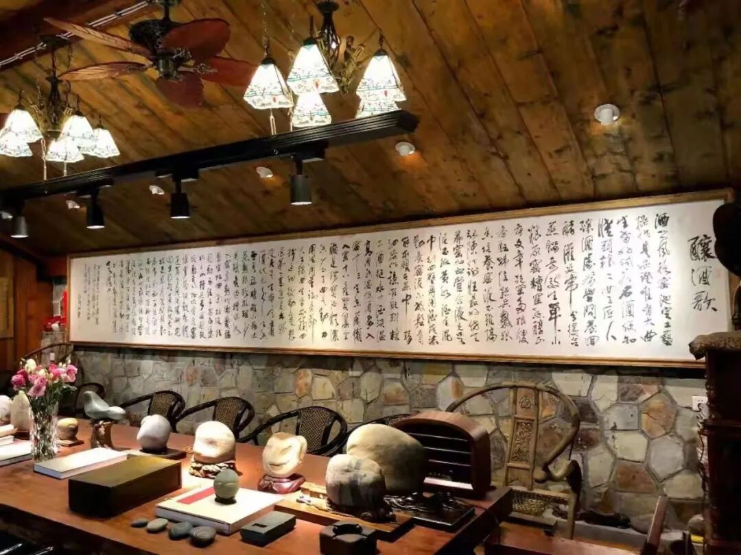 活到极致,是一种勇气,也是一种格局。大师除了在白酒行业拔得头筹之外,还大胆汲取多种艺术的营养,使其酿出的酒更具文化的芬芳。藏石、书法、弹琴、歌舞,以至于对茶道、插花、艺术设计和布局都有涉猎。所以,他每次寄来的酒,都要亲自书写标贴,还特别讲究选词择印,且那般新意叠出,唯美儒秀。一只陶罐,注满了他浓浓的情谊,承载着他的希冀,让我每每难以承受之重。