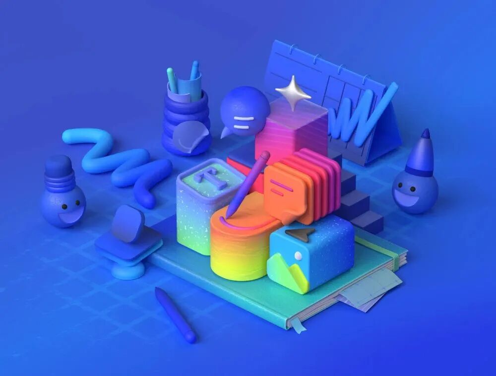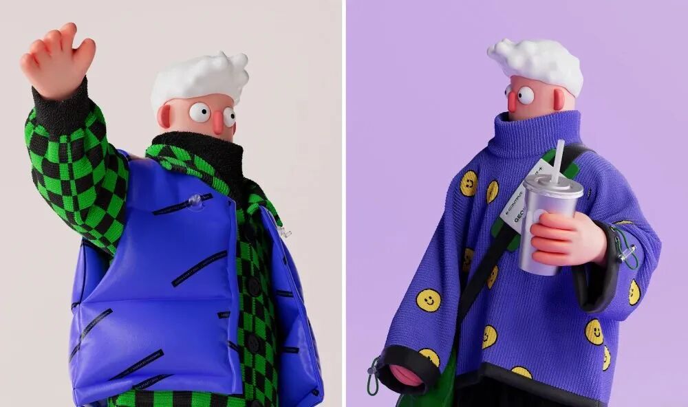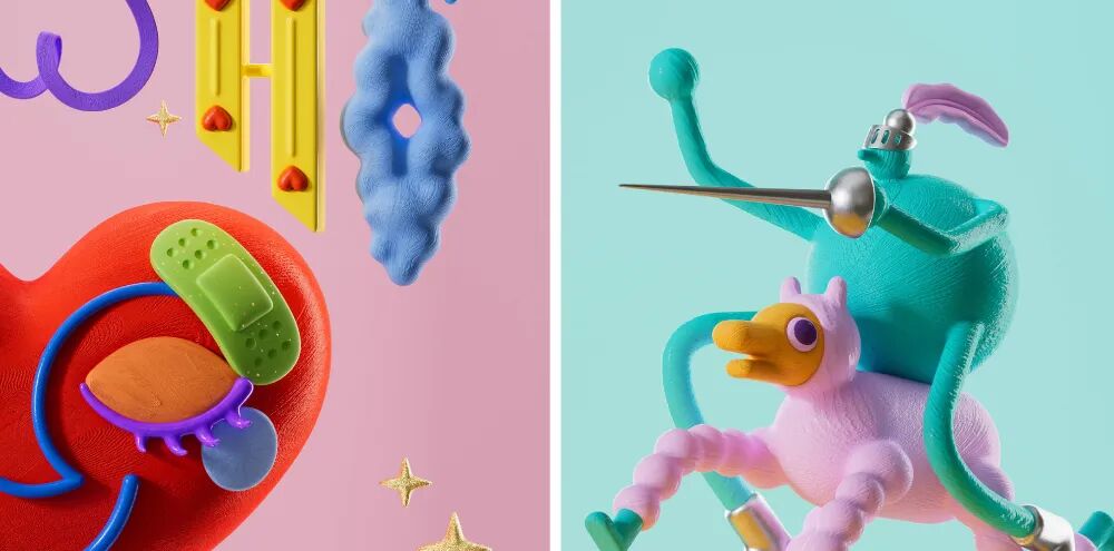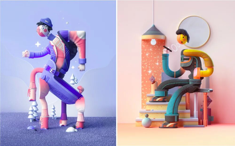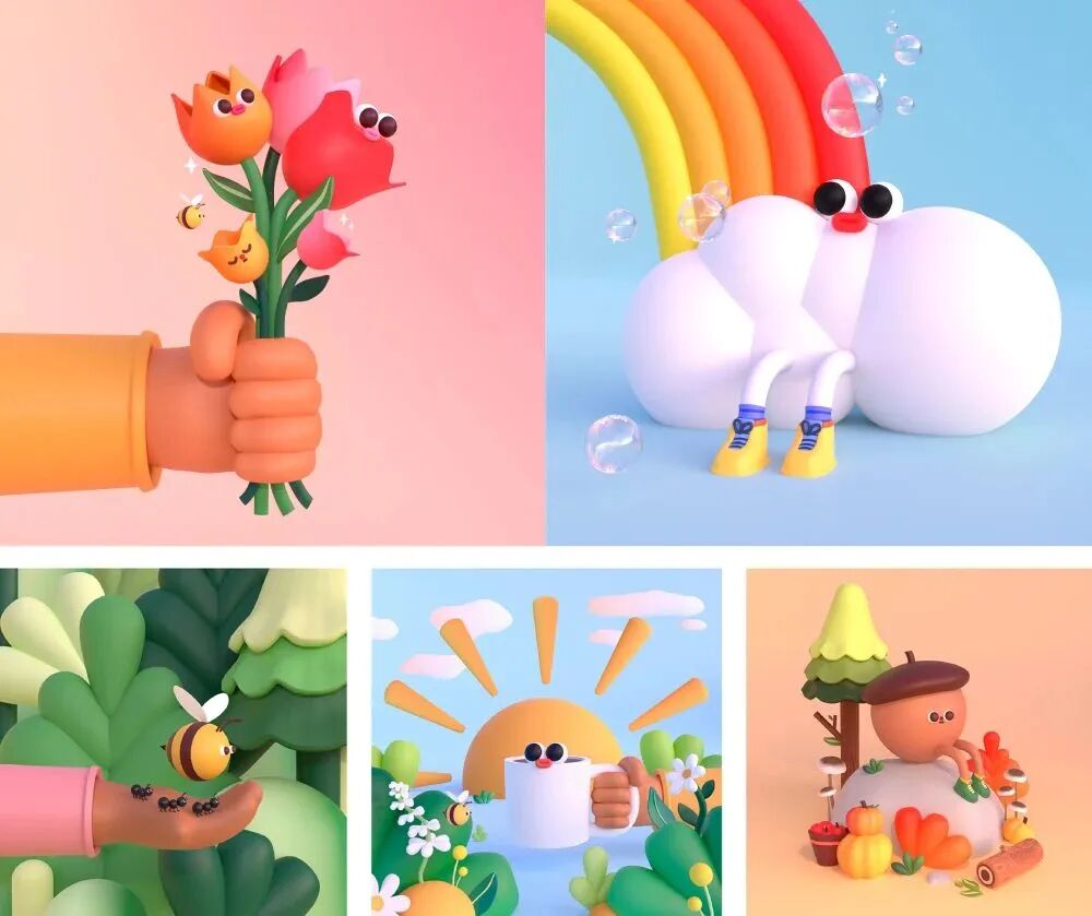 与 3D 设计通常呈现的光亮平滑不同,塑性黏土风的表面是凹凸不平的,像是手工捏制后留下的痕迹,这种效果可以是真实黏土自带的,也可以用 3D 软件塑造。这种“不完美”的特性让黏土风摆脱了工业设计的冰冷理性,更加童真质朴,具有人文气息。这种风格也提醒我们“美隐藏在不完美中”—— 黏土重复使用和任意塑造的特点鼓励设计师们要不断的探索、大胆实验,用自己的努力和实践去改变和塑造世界。