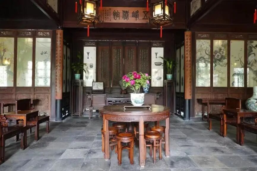 室内布局与陈设除了家具外,也有很多其他的细节部分。比如五峰仙馆牌匾下方的翘头案上,并没有如传统民居一般,中间放座钟,右边放花瓶,左边放镜子,取“终生平静”(“钟声”“瓶”“镜”)之意,而是右边放花瓶,左边放大理石插屏,中间位置60年代放置的是盆景配木雕仿太湖石底座,现在放置的则是配有底座的一块真太湖石。无论是花瓶还是插屏,依旧象征着“平静”“平安”,可见留园的此处的设计既没有落人窠臼,也不是离经叛道,而是表现出文人对于审美的独特而克制的追求。