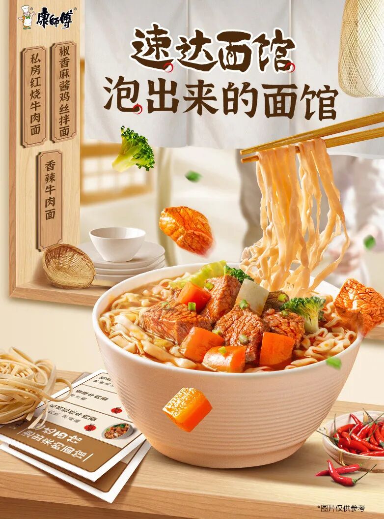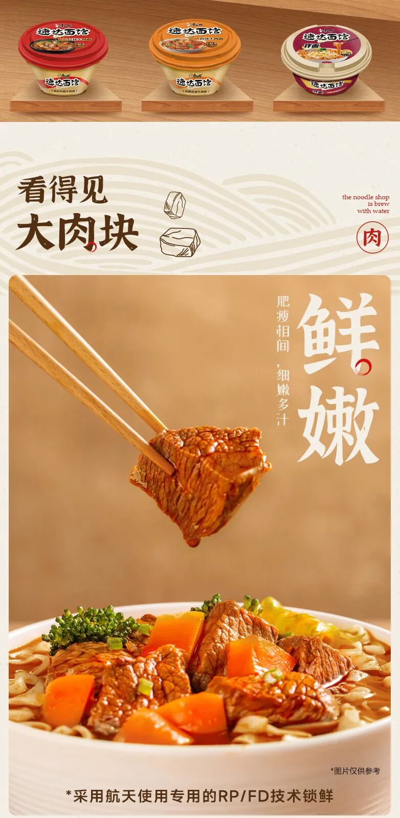 太厉害了!整个面条详情页,一看就是顶尖高手设计,超大肉块特写,非常有动感,香味扑鼻而来。非常值得我们学习和借鉴!