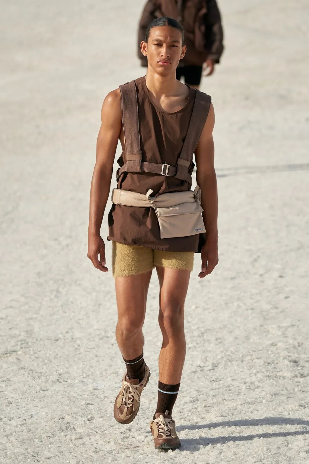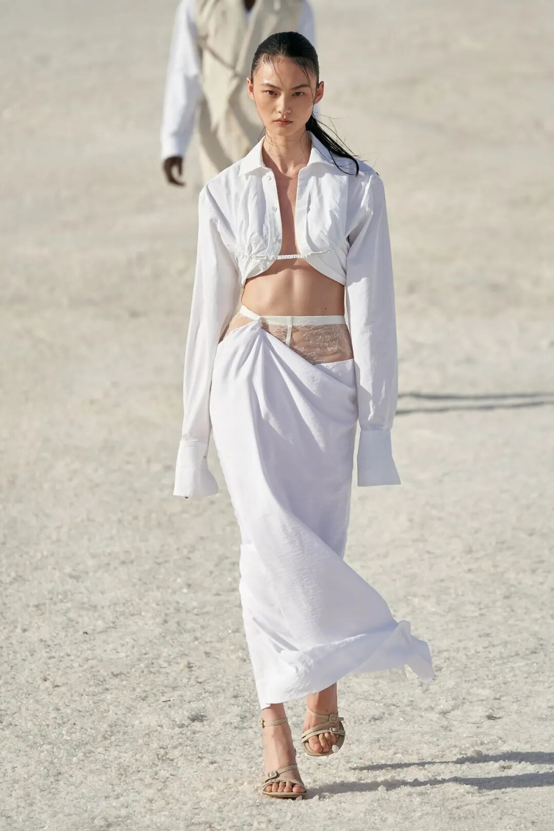 在盐山之间,Jacquemus 开辟了一条沿着山坡的 runway。他的模特从山顶上下来,她们的裙摆在风中摇摆,她们的薄纱被吹成云朵,看起来就像 Karl Lagerfeld 装扮的《沙丘》中的临时演员。一旦外观与视线持平,现实就变得更加清晰。