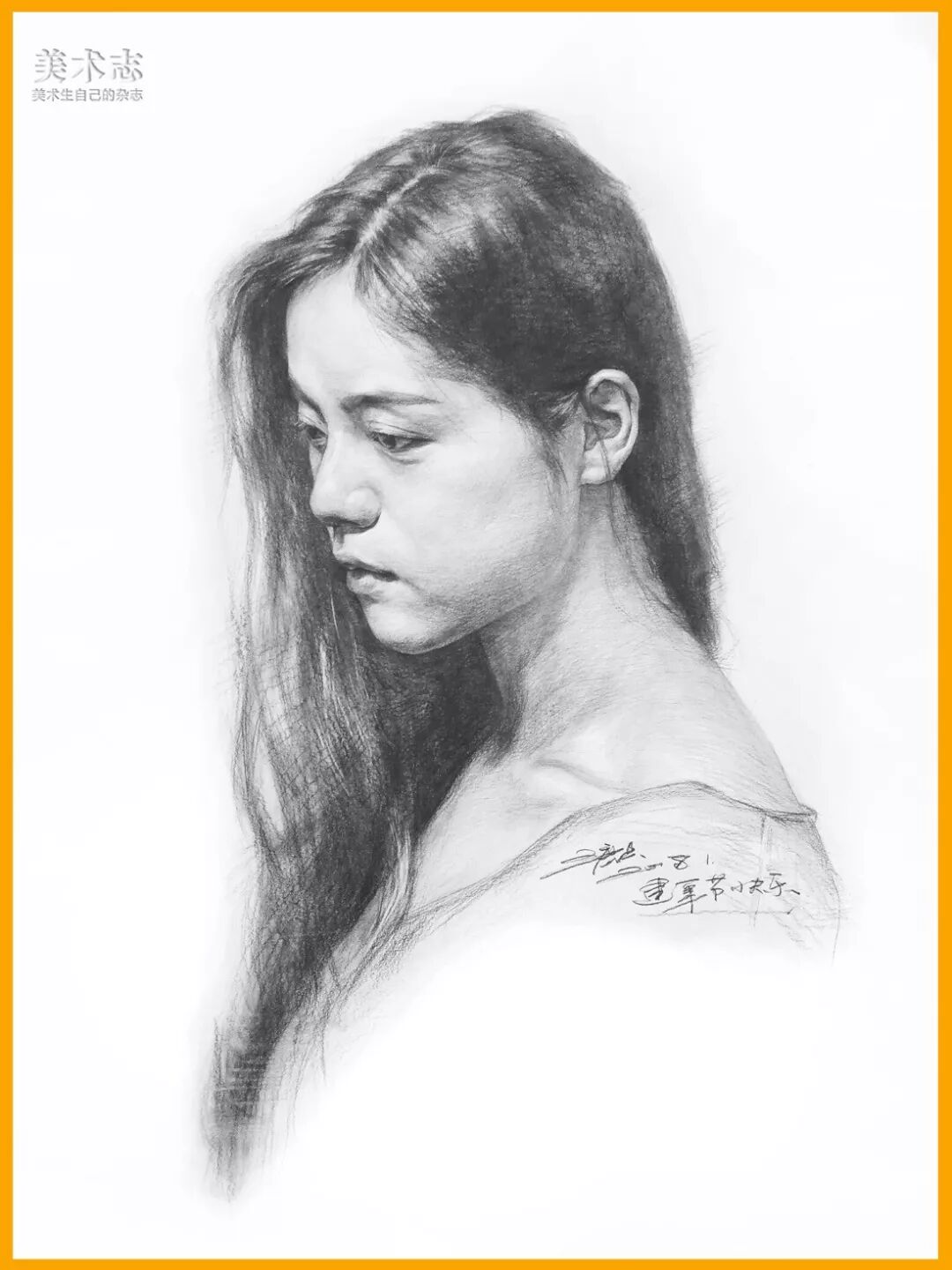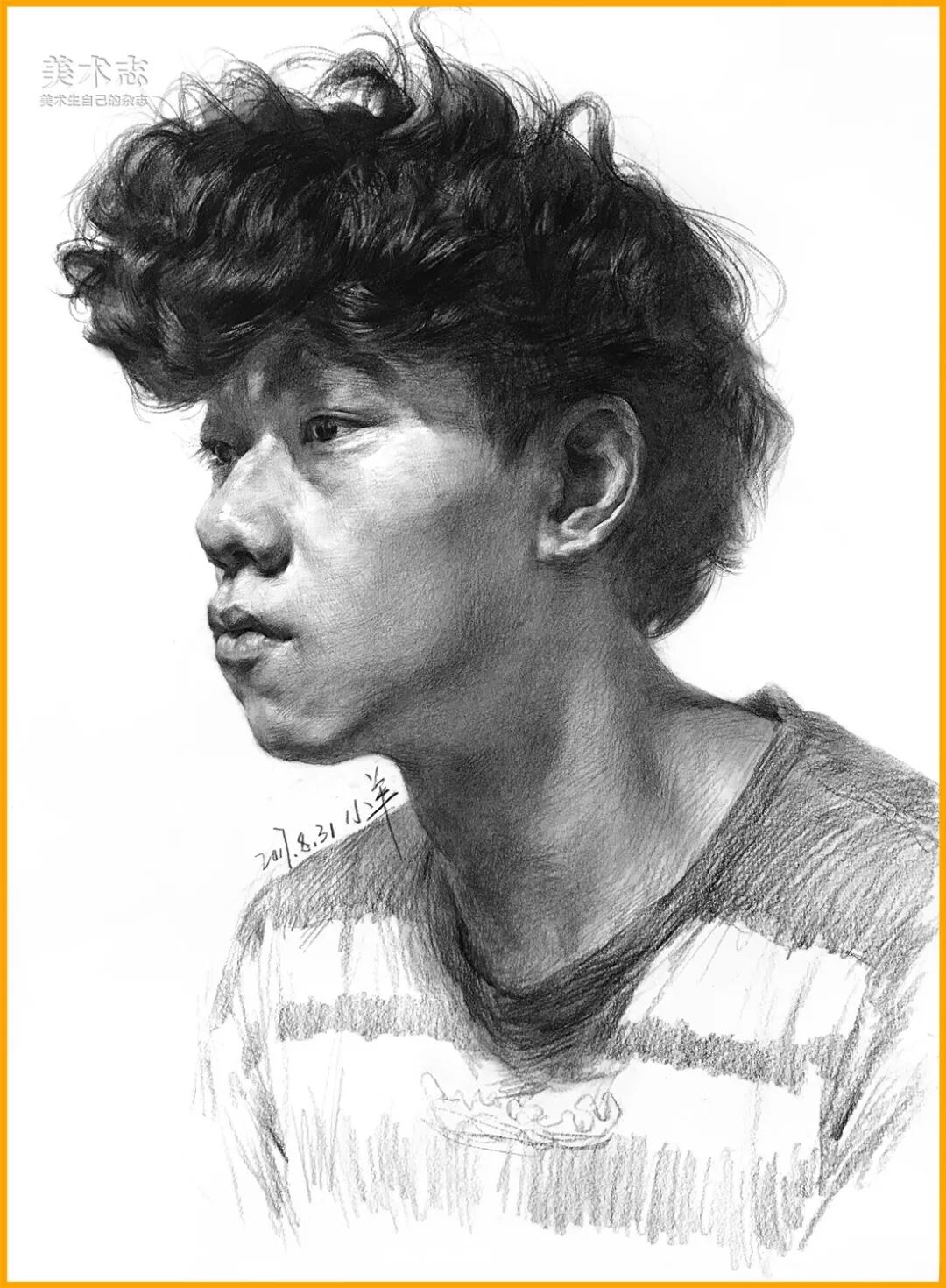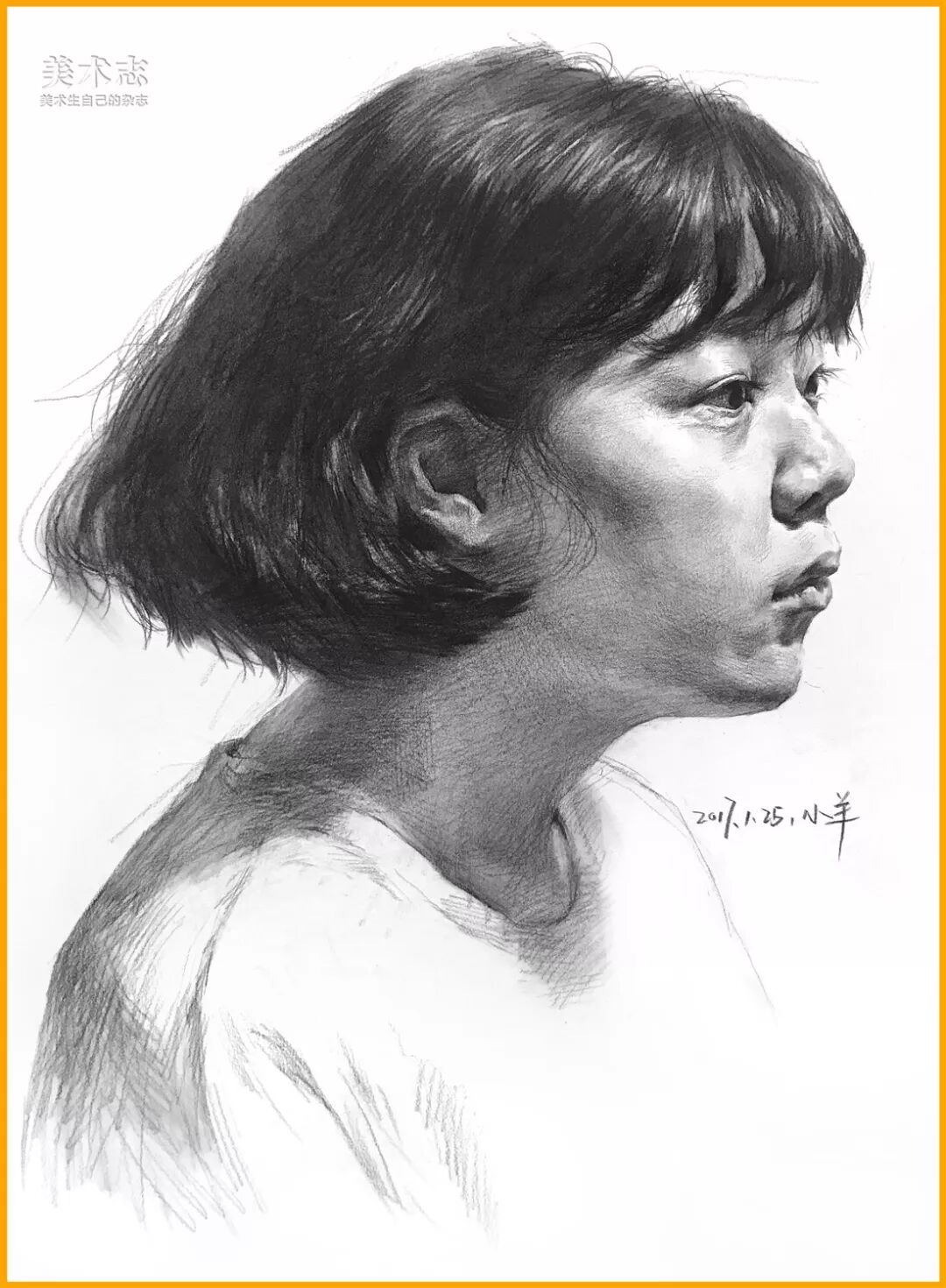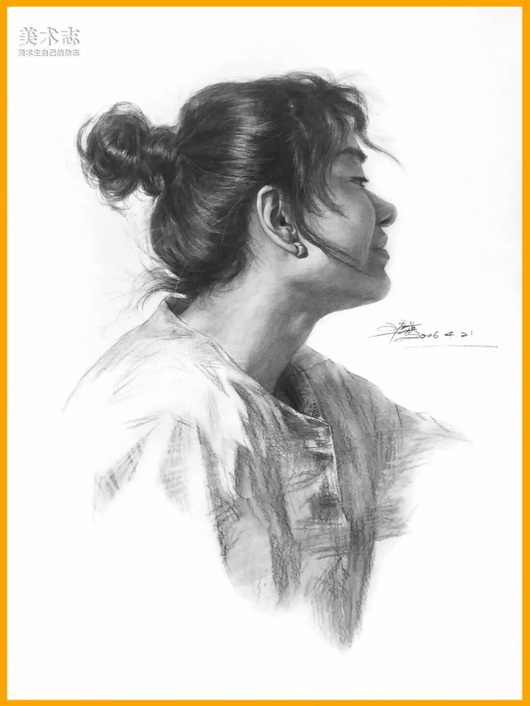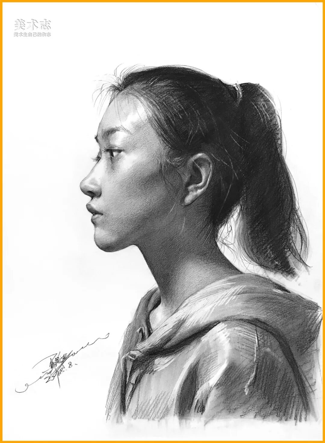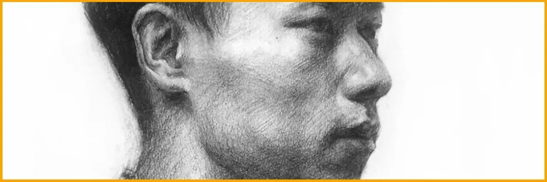 ④从鼻子到耳朵的前后空间关系,根据空间控制对比度。脸(包括颧骨咬肌至下颏的明暗交界线)适当的减弱对比度。千万不要描边缘线。