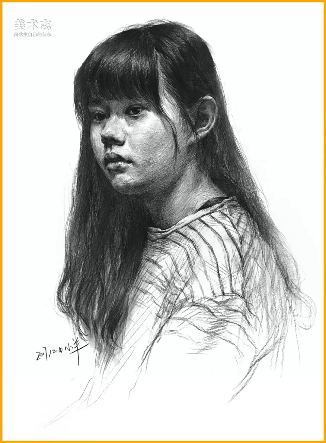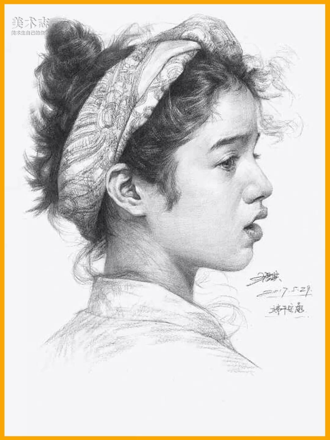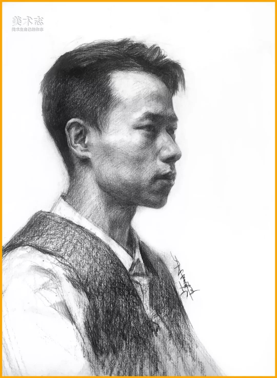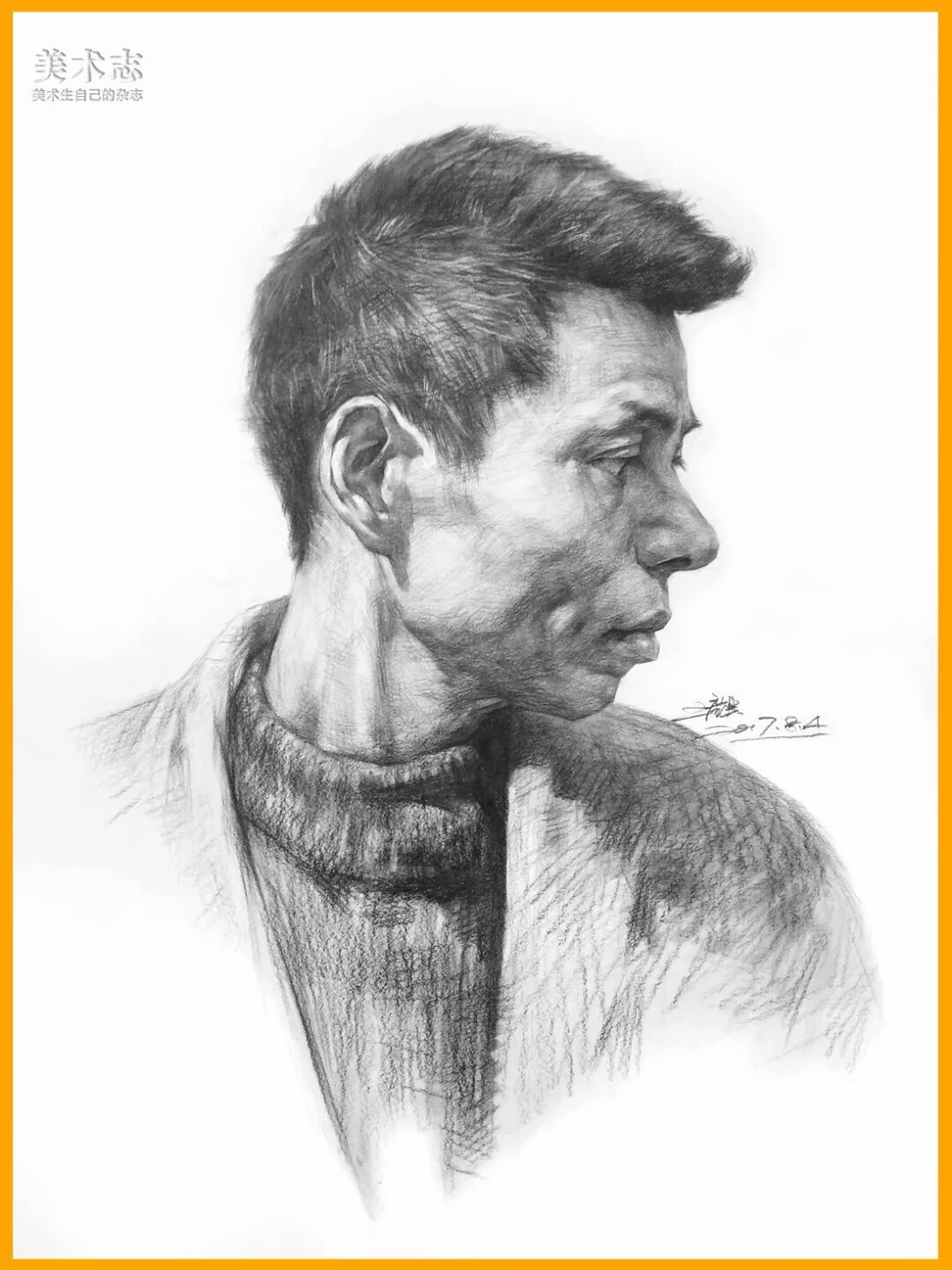 ④从鼻子到耳朵的前后空间关系,根据空间控制对比度。脸(包括颧骨咬肌至下颏的明暗交界线)适当的减弱对比度。千万不要描边缘线。