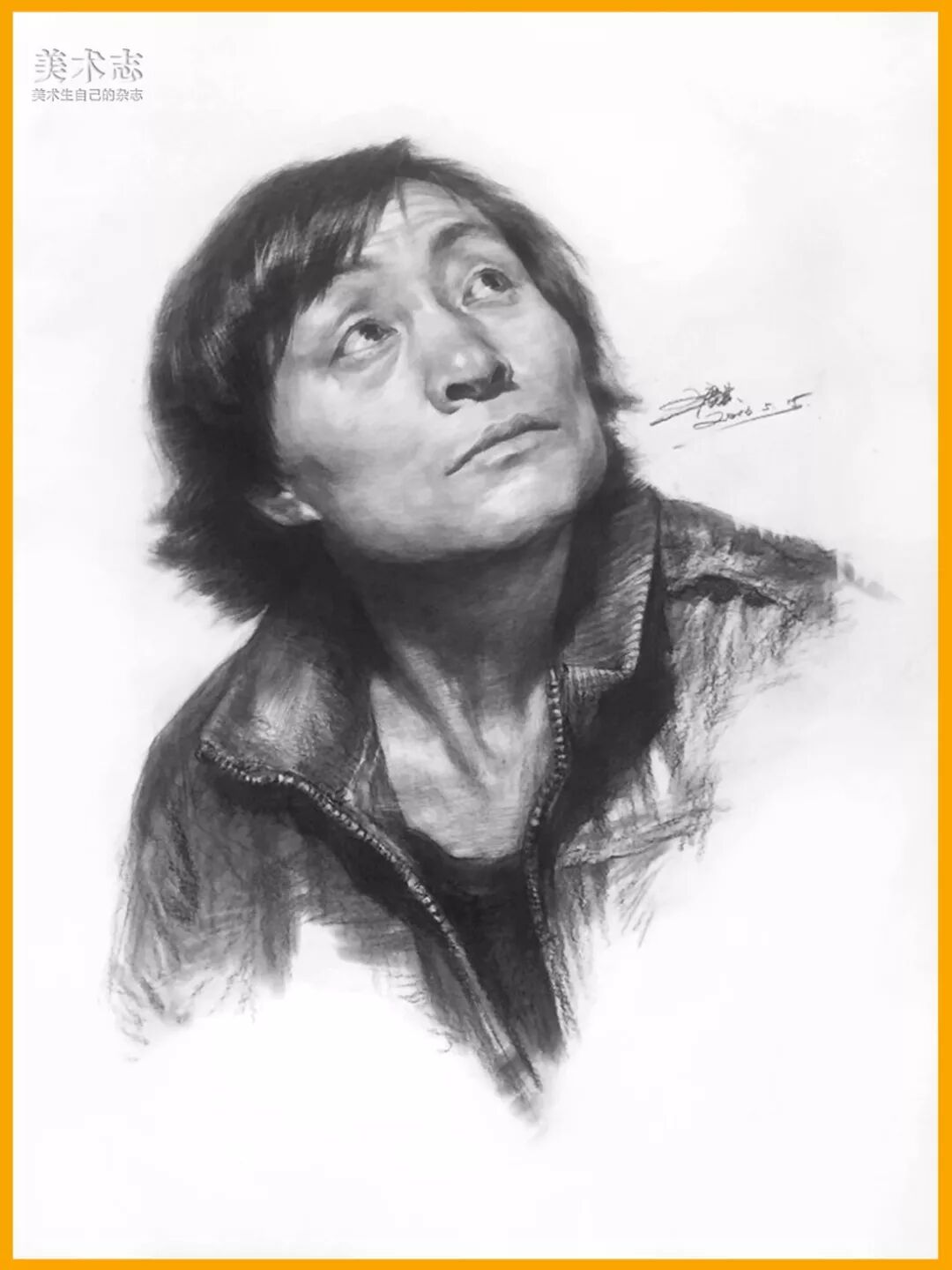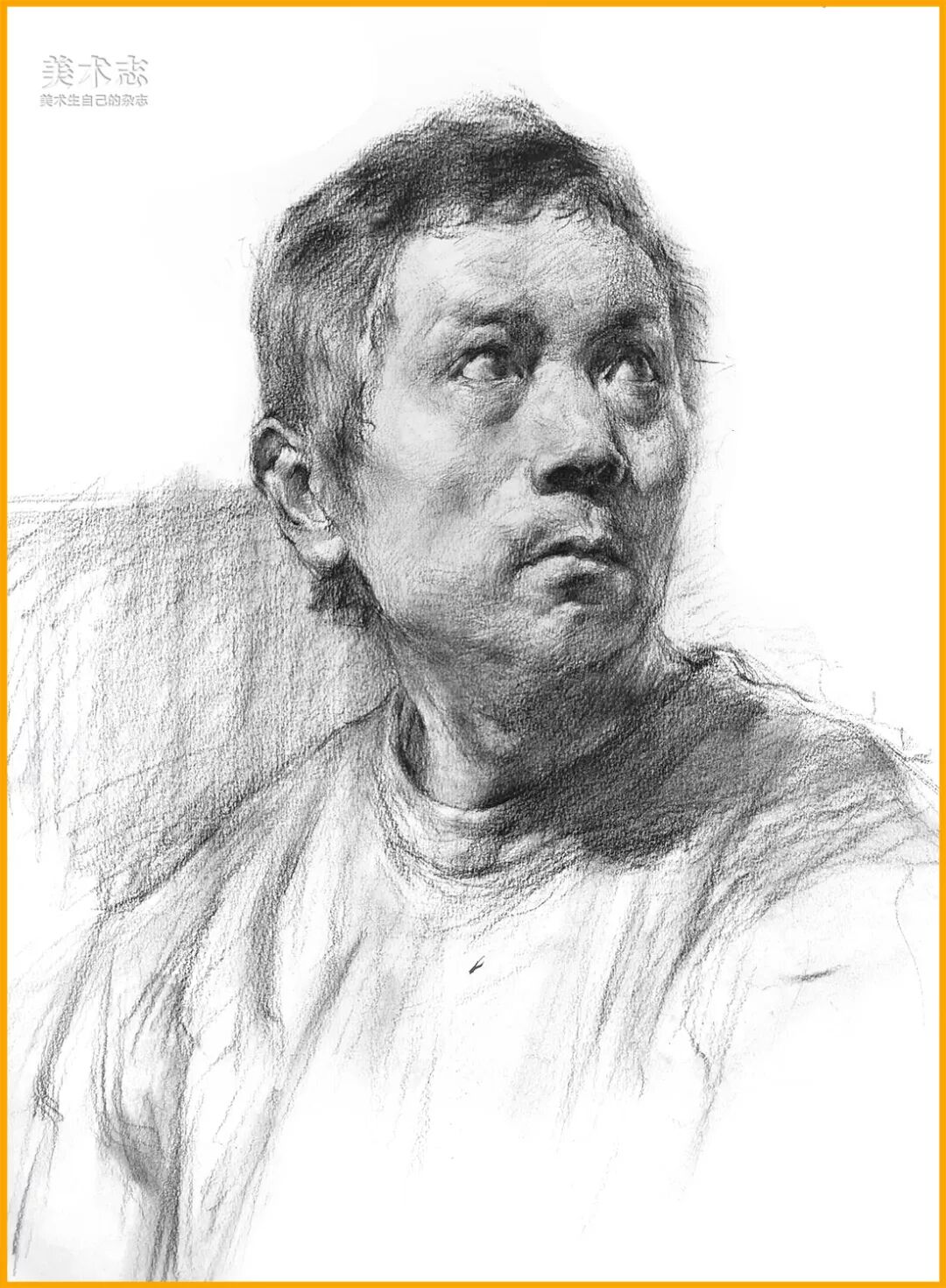 ①仰视与俯视的核心都是一样的,最重要的地方就是透视问题。鼻底的空间变大,注意画得要透气,不要死黑一片。额头的面积减少,下巴、脖子的面积变大,这里要注意下巴的塑造一定要“卡两头,虚中间”,要有空间感。