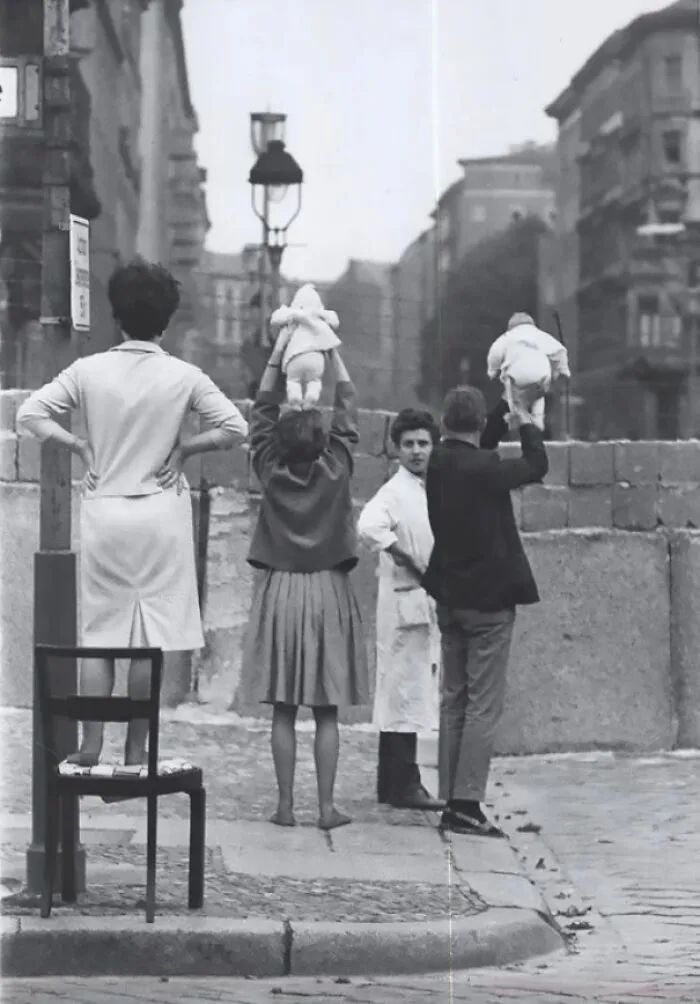 1961年,西柏林居民向居住在东柏林的祖父母展示他们的孩子。