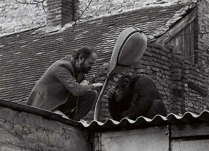 1988年南斯拉夫,动物园管理员和逃跑的黑猩猩之间的"谈判"。