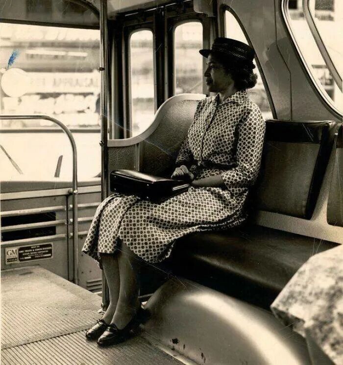 直到1965年,美国黑人才有资格乘坐公交车,图为名为罗莎·帕克斯的黑人女性大胆地乘坐公交,争取权益。