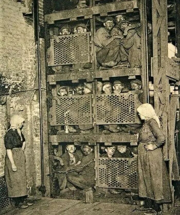 比利时煤矿工人在漫长的一天工作结束后挤进电梯(1900年)。