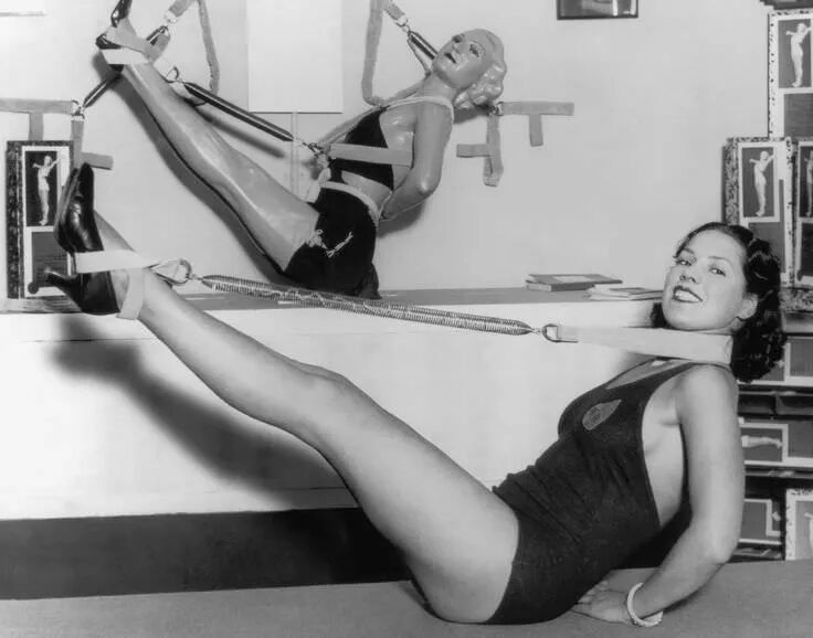 这是美国在1937 年时推出的一款瘦腿器材,为了能够增加广告的真实性,直接请了一名模特示范。