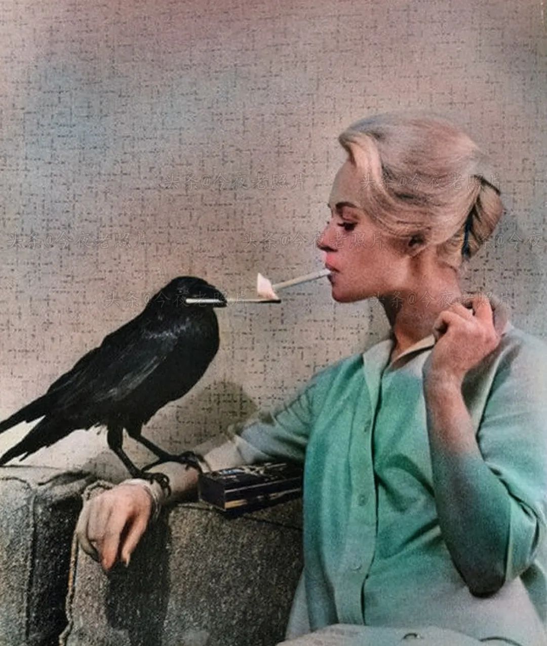 1962年,蒂皮·海德伦在乌鸦帮助下点烟,她是一名演员及动物保护者。