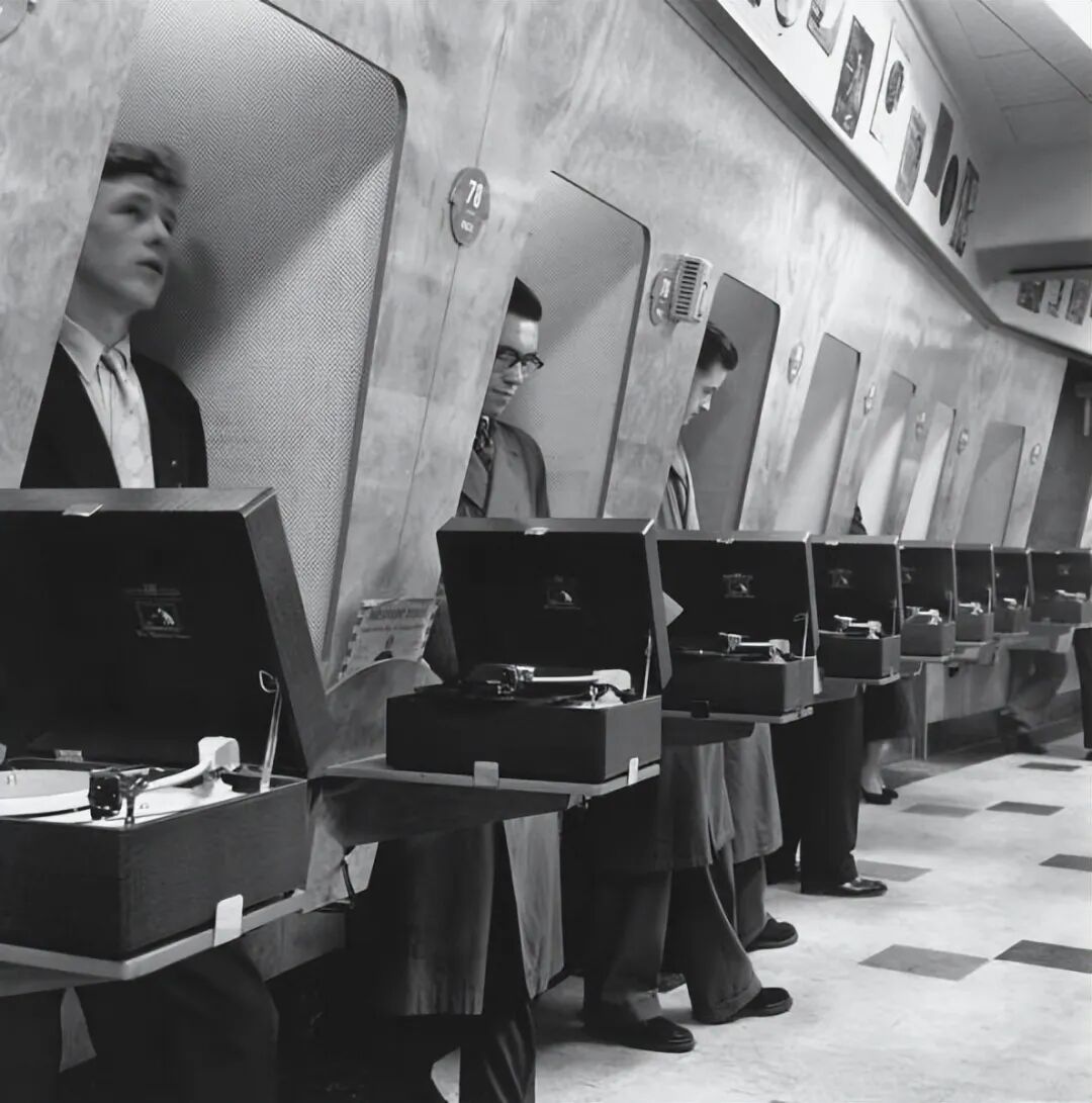 1955年,伦敦唱片商店为顾客提供试听服务。